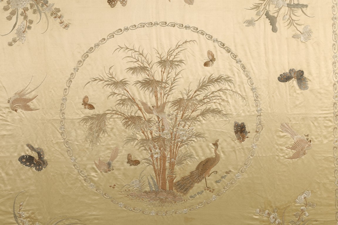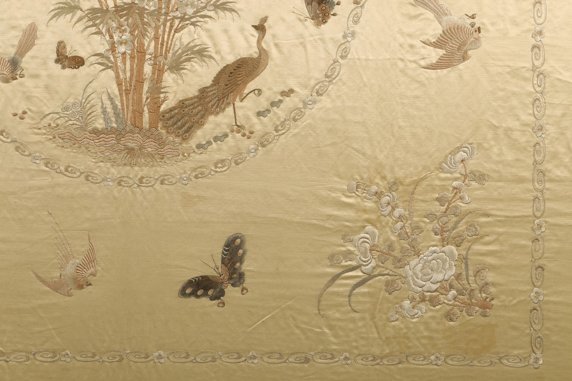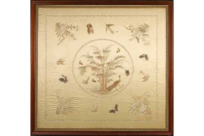 Framed. Of square form, embroidered with peacock, butterflies, and bamboos to the center, surrounded by flying butterflies and flowers. Qing Dynasty period.