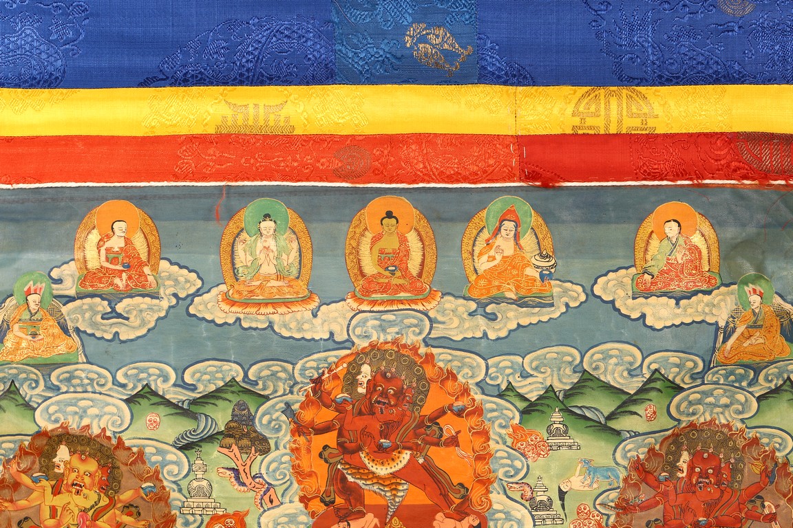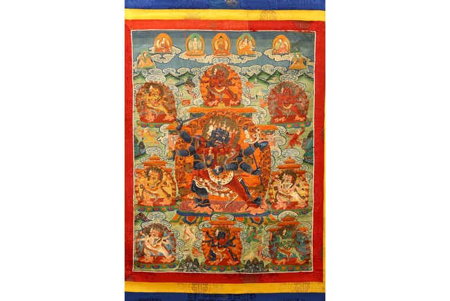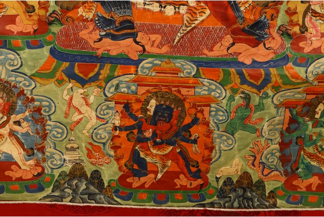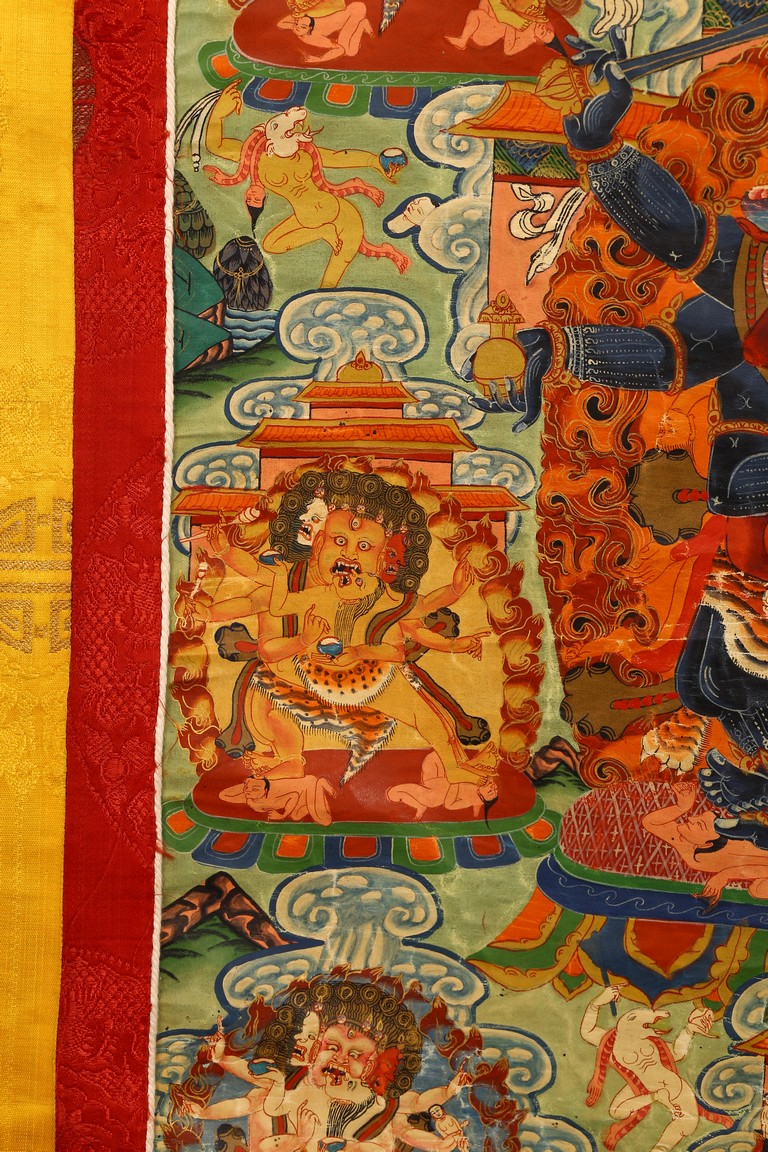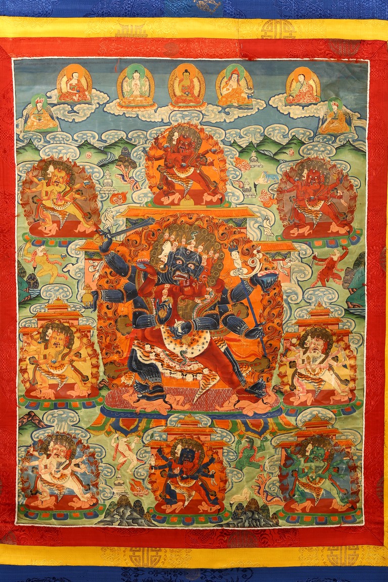 Qing Dynasty period. Depicting the ferocious deity holding various weapons and ritual objects at the center, surrounded by other smaller deities.