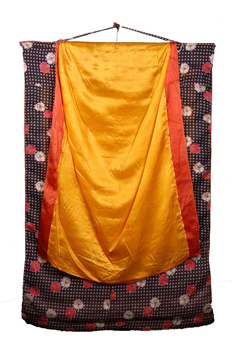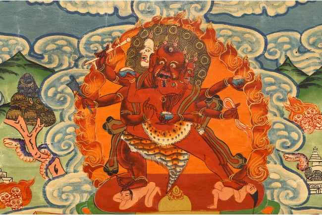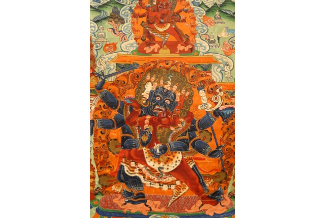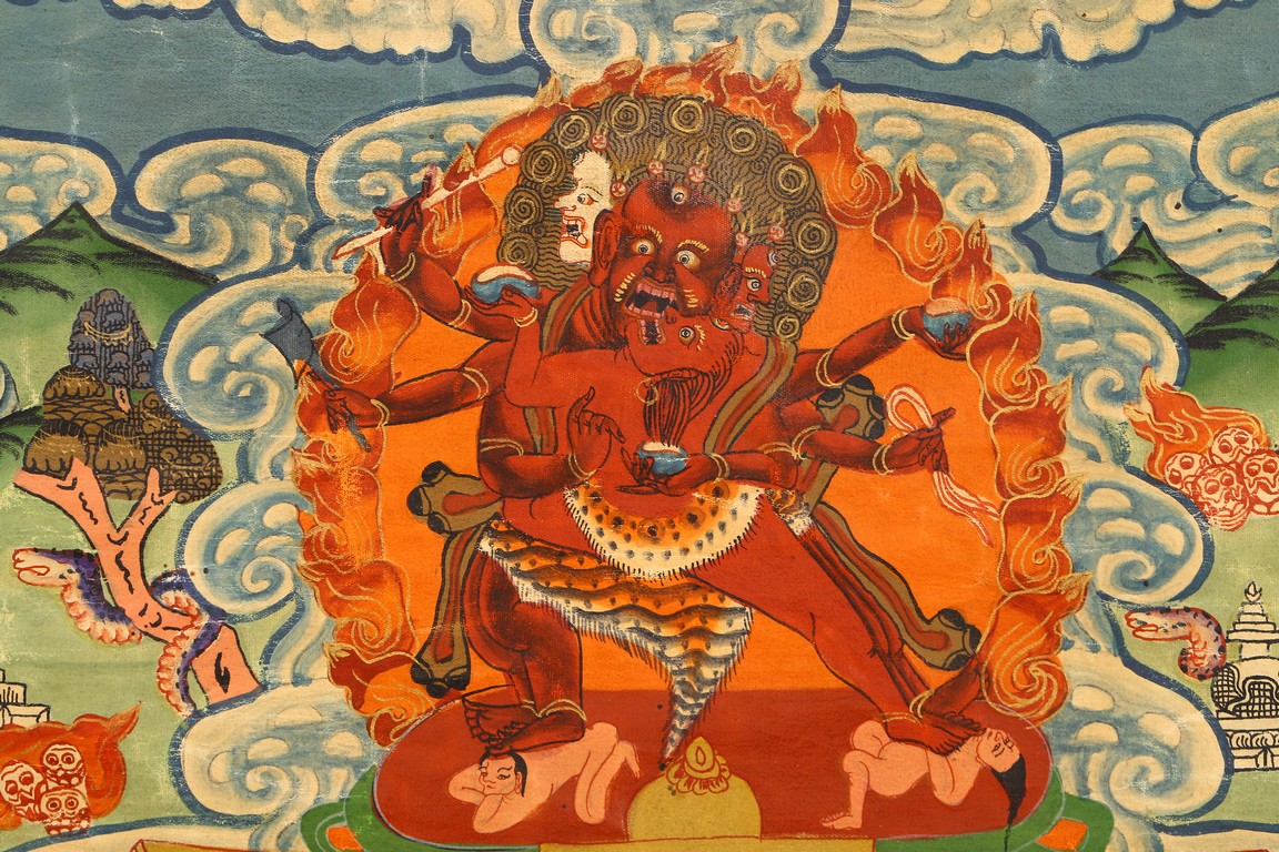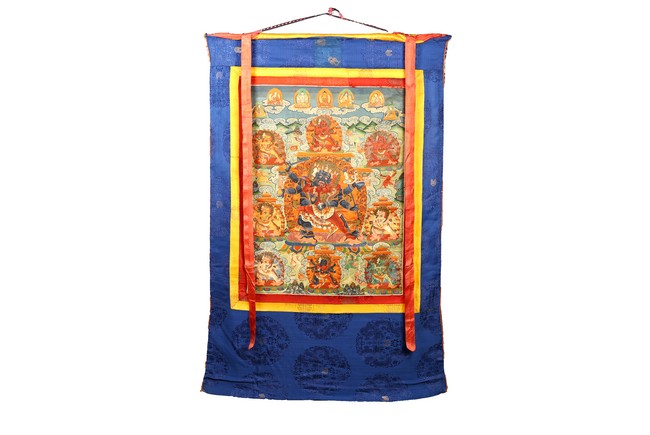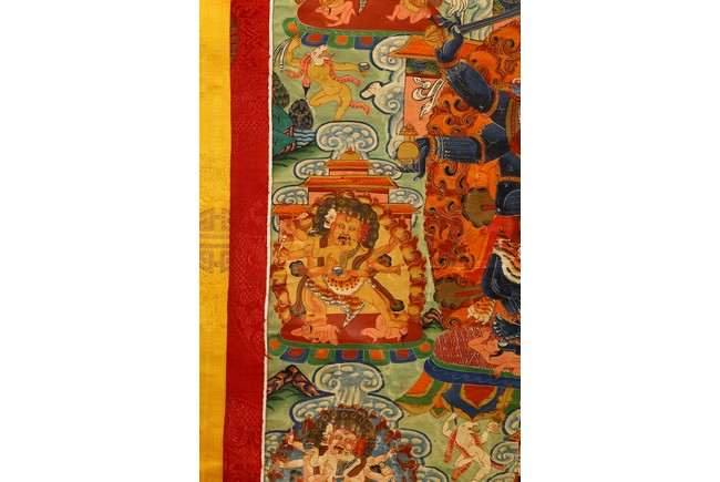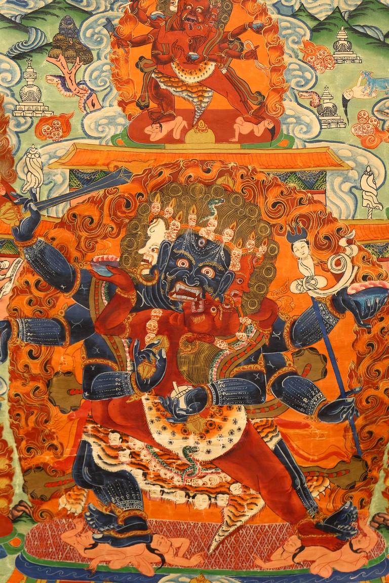 Qing Dynasty period. Depicting the ferocious deity holding various weapons and ritual objects at the center, surrounded by other smaller deities.