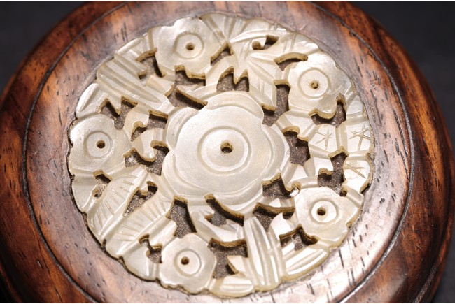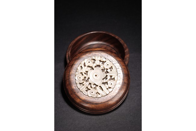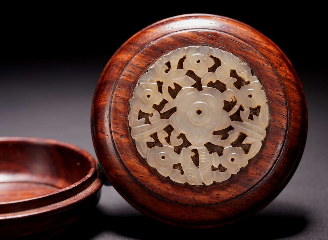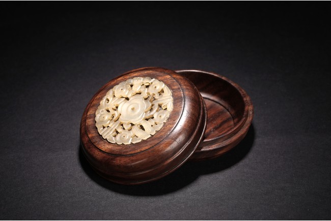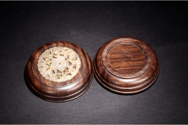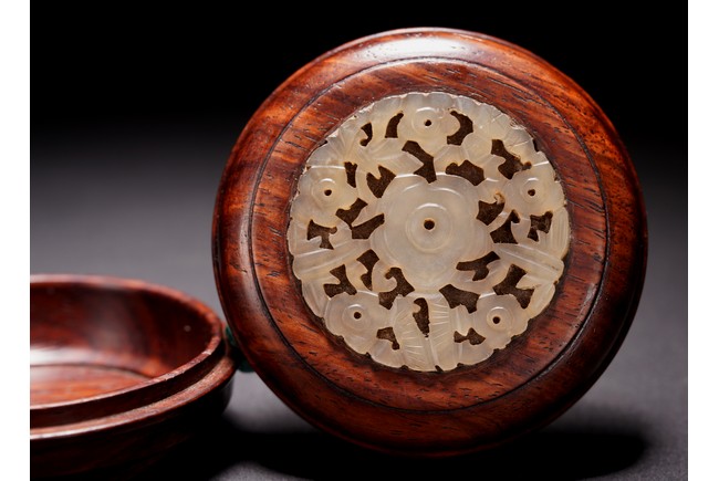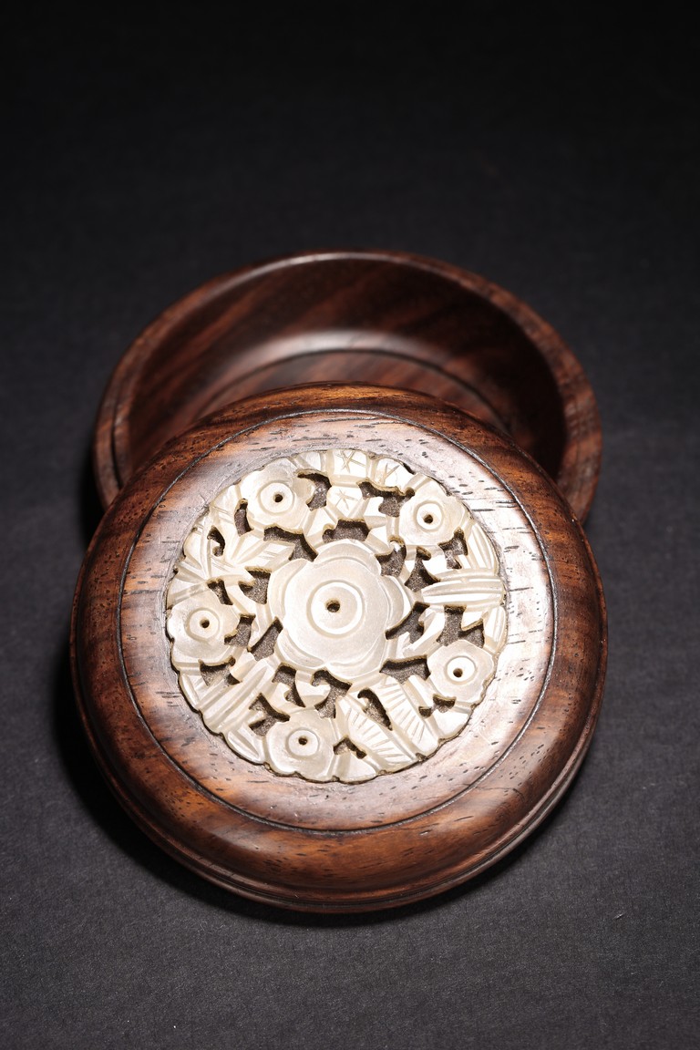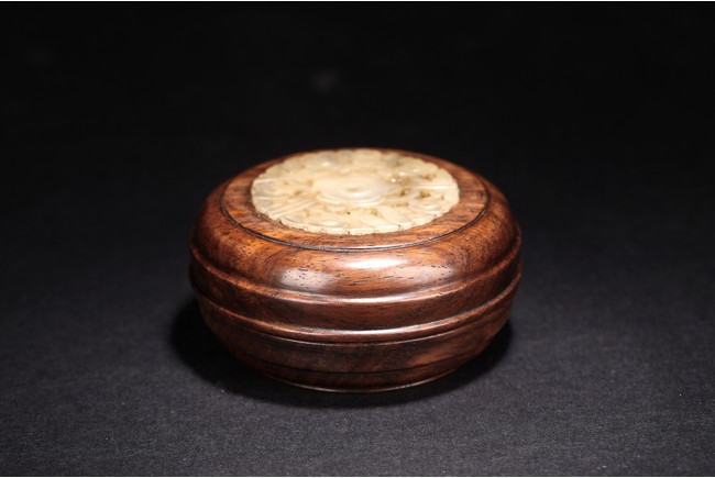 此盒以精品黃花梨木製作,呈扁圓形,蓋與器身子母口結合,質地堅硬細密,包漿老厚。頂部鑲嵌白玉花片,口沿、蓋沿起陽線,工藝精湛,素美雅緻。整器做工精緻,盒口銜接緊密,形制規整,为鑲嵌工藝中的雅作,值得收藏。 來源:南加州重要藏家收藏 Provenance: Property from an important Southern California collector
