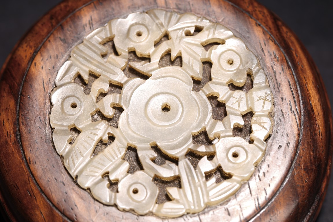Qing Dynasty period. Of circular form, the box cover inlaid with a reticulated 'flower' jade plaque, the box with attractive wood grain pattern