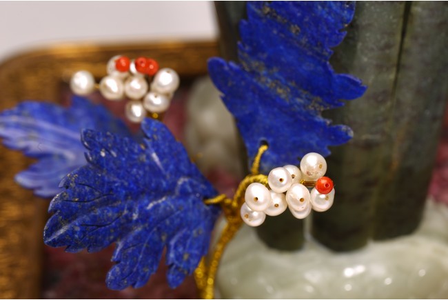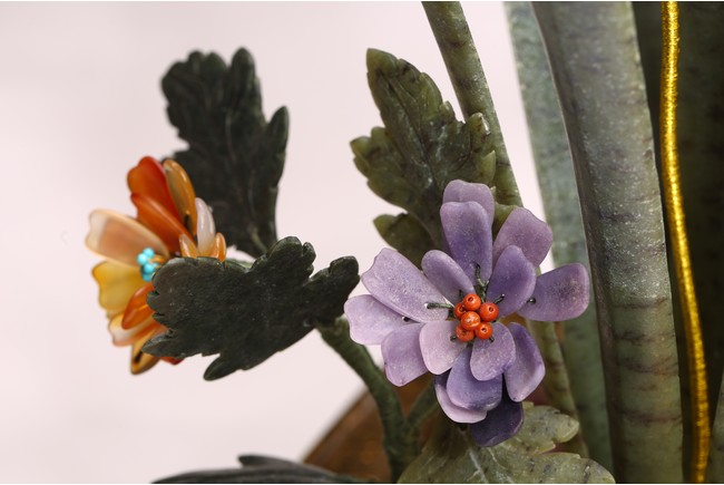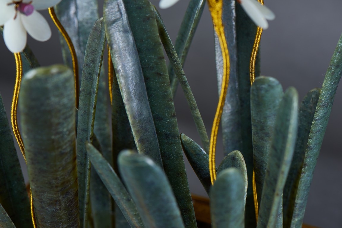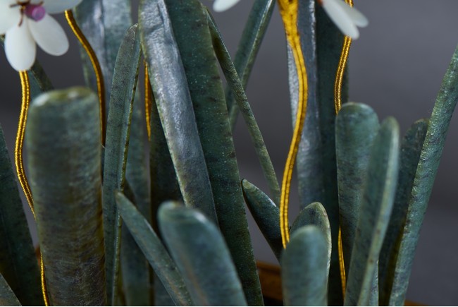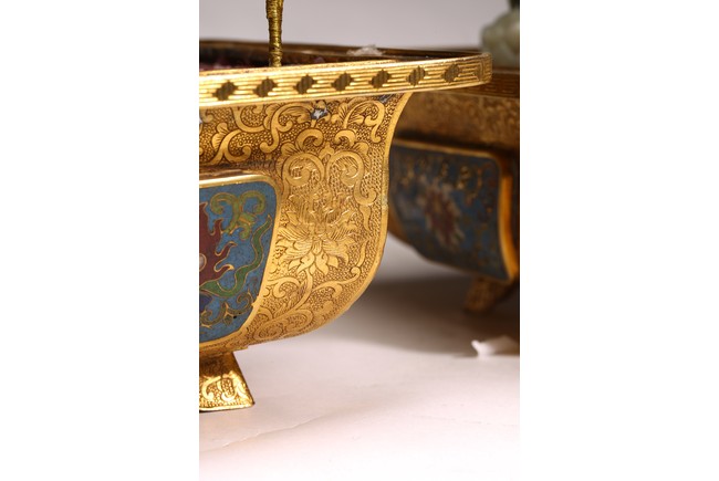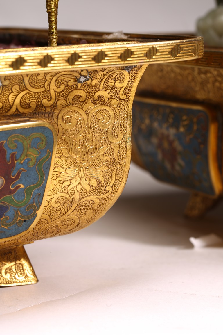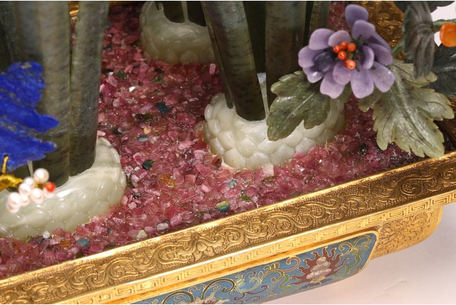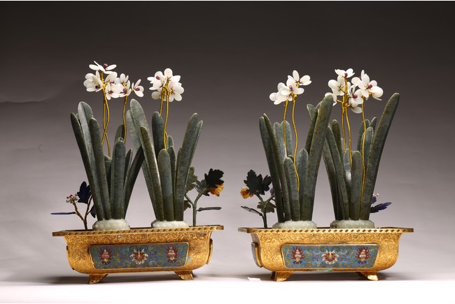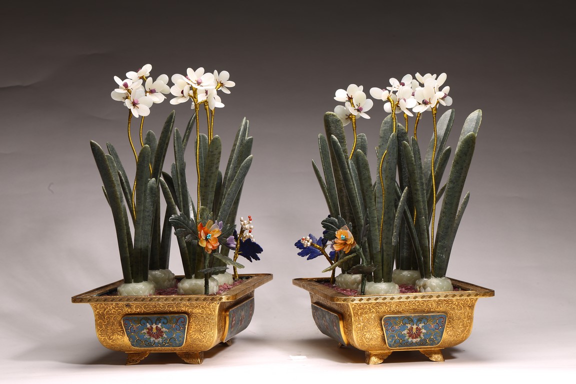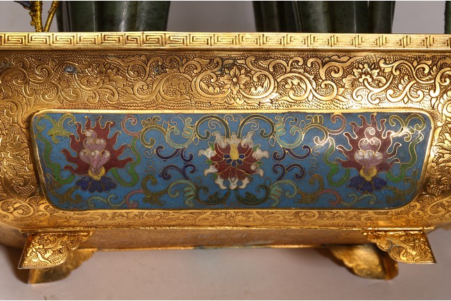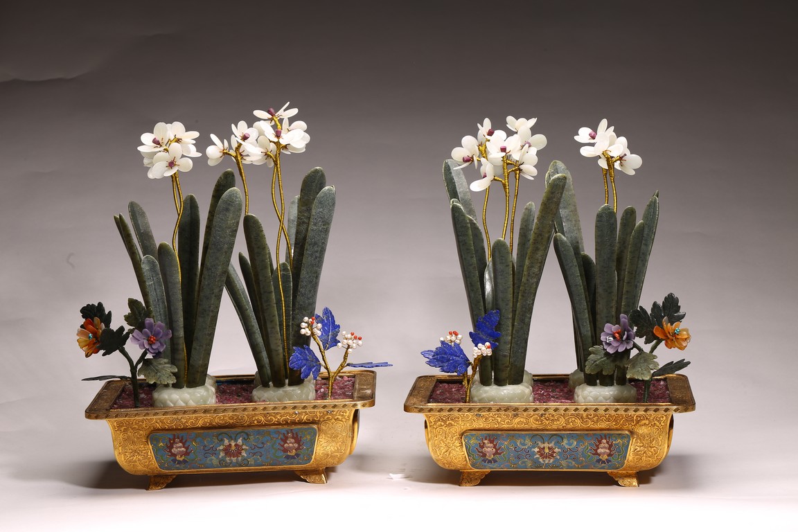 盆座為一對,銅質鎏金,鏨刻花紋,內嵌景泰藍開光,下為四如意形足。盆內用碧玉、白玉作水仙,用白玉、寶石作花朵,花繁葉茂,參差斑斕,製作細膩,耀眼奪目,華美富麗。整個盆景構思新穎,製作精細。