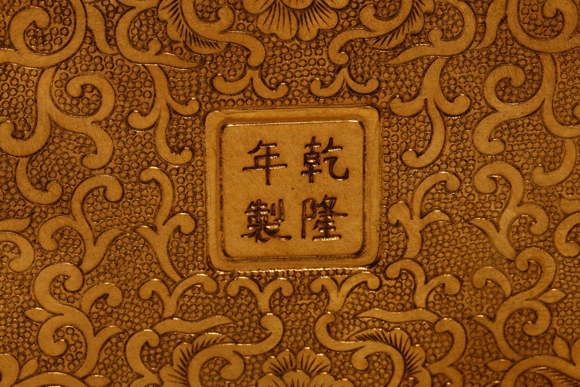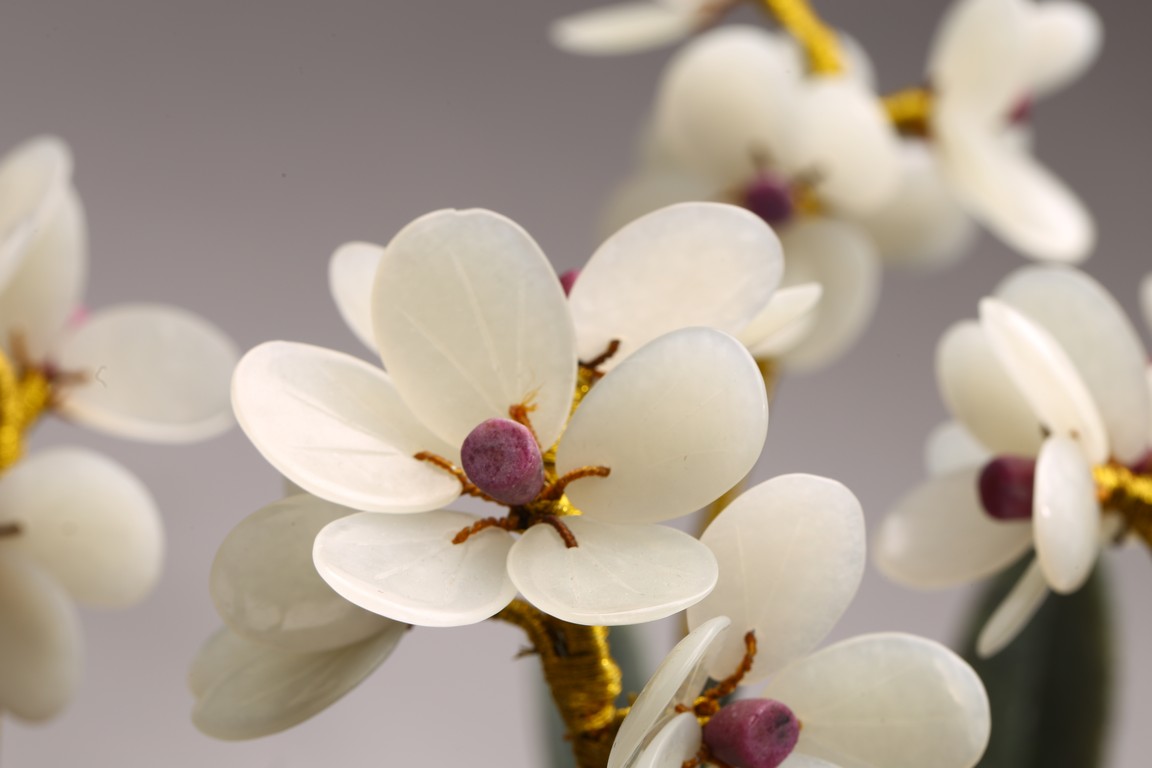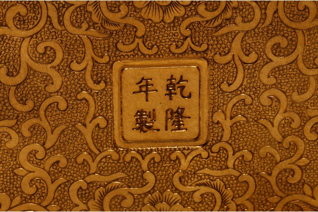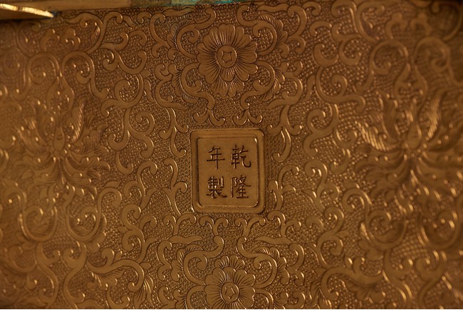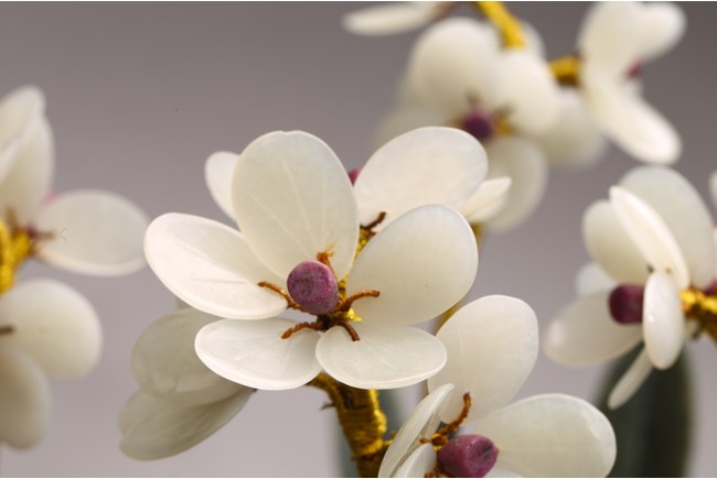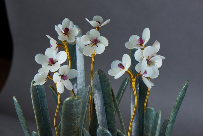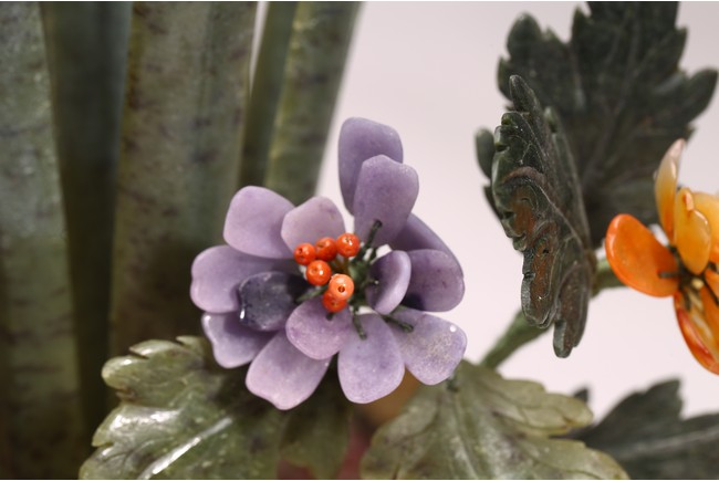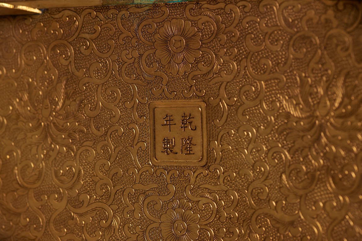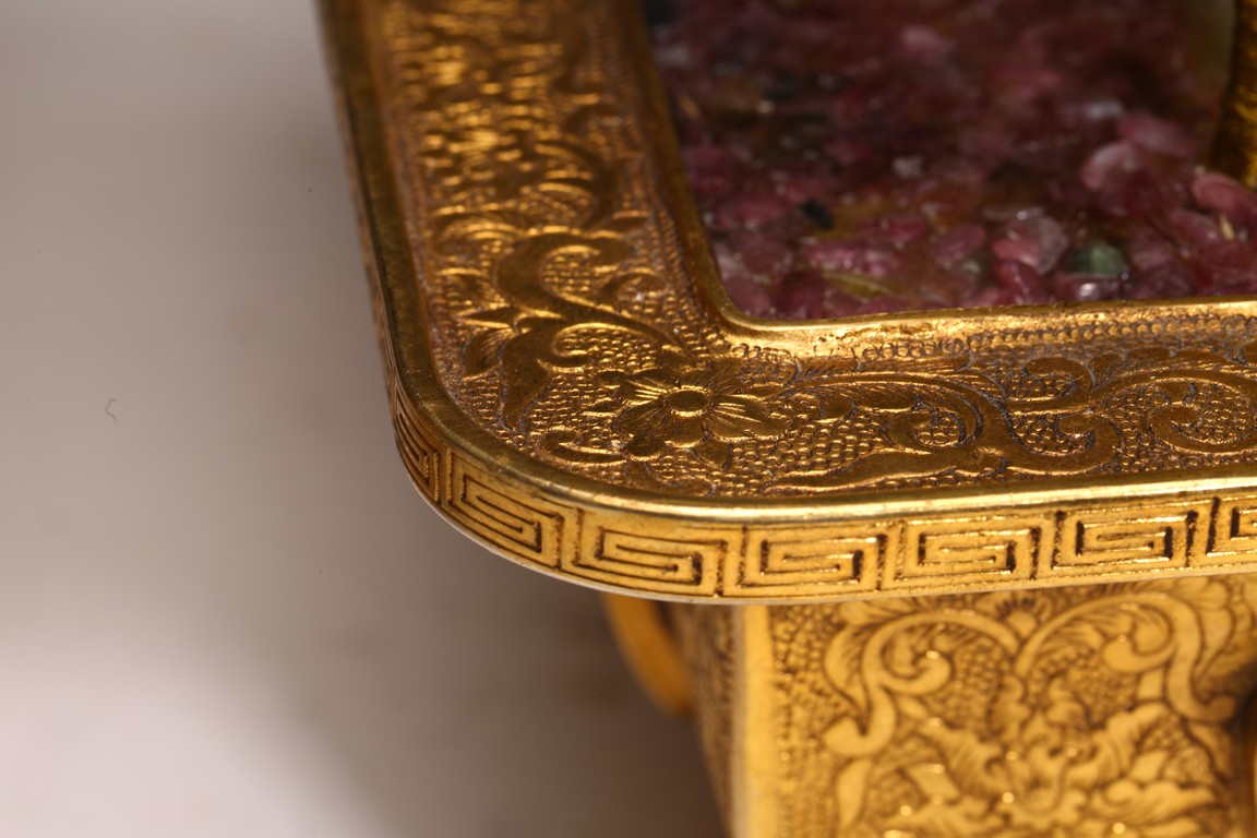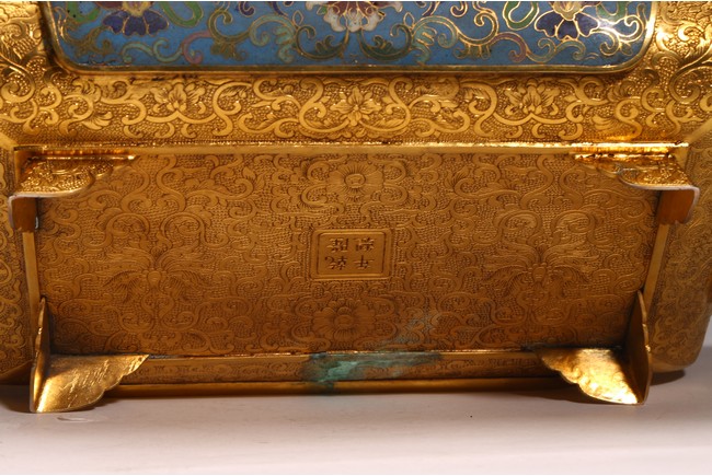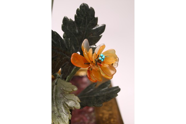 盆座為一對,銅質鎏金,鏨刻花紋,內嵌景泰藍開光,下為四如意形足。盆內用碧玉、白玉作水仙,用白玉、寶石作花朵,花繁葉茂,參差斑斕,製作細膩,耀眼奪目,華美富麗。整個盆景構思新穎,製作精細。