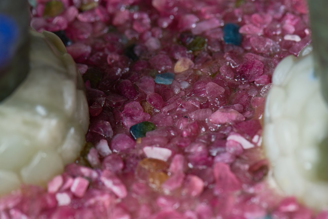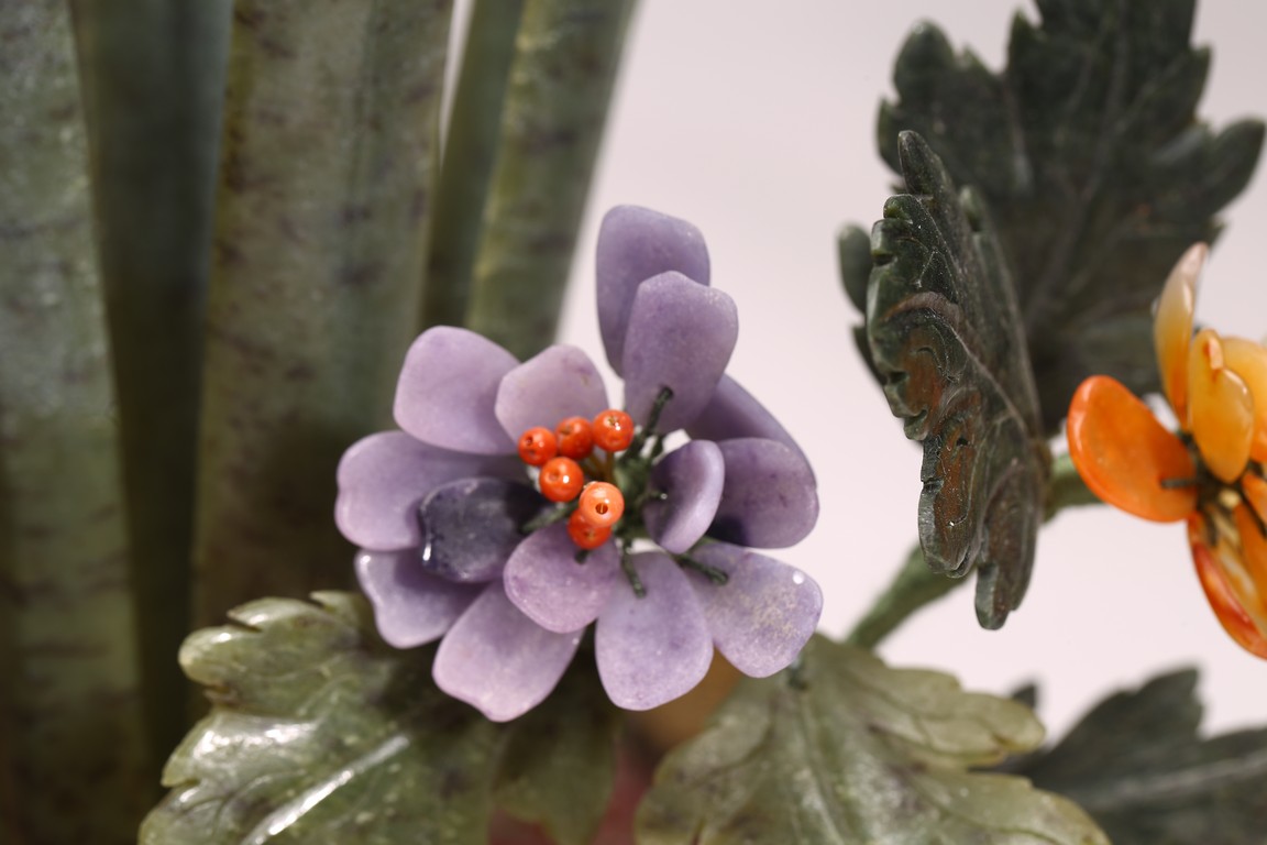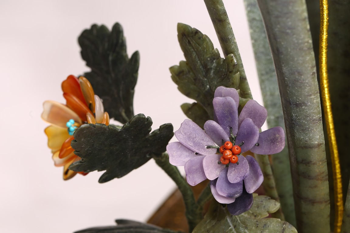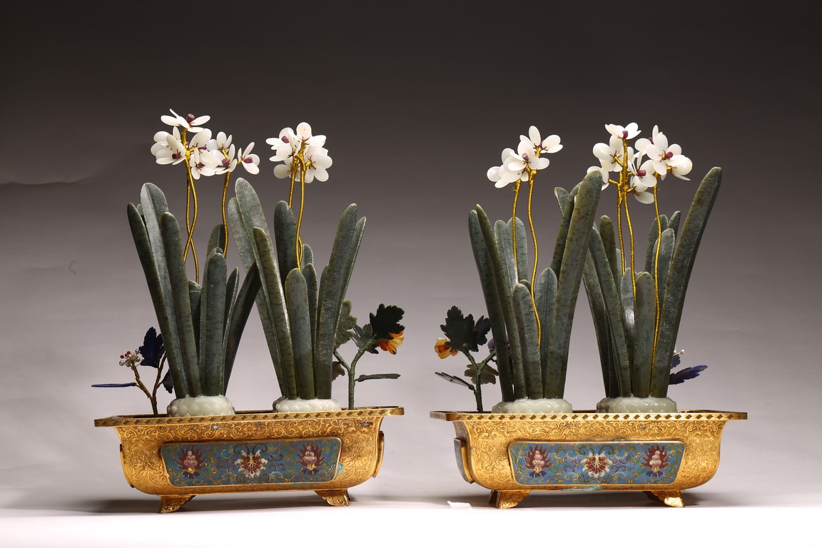 Each jardiniere and 'planted' with white jade flowers and green jade orchids attached to white jade stems, surrounded by smaller lapis lazuli and agate flowers, the jardiniere body embellished with cloisonne enamel panels on each side, all supported on four splayed short feet.