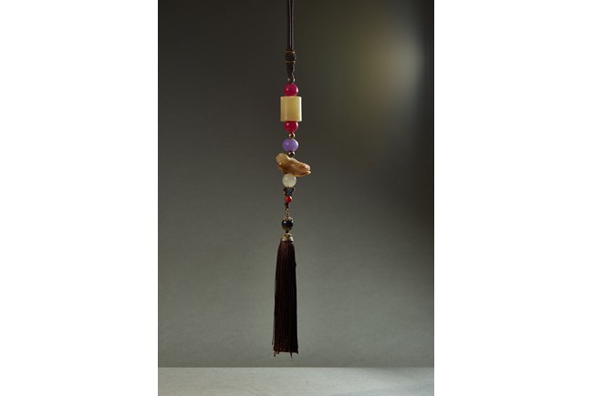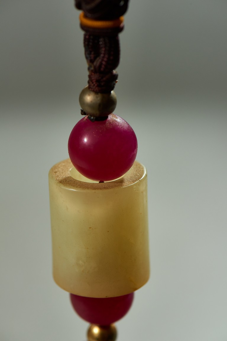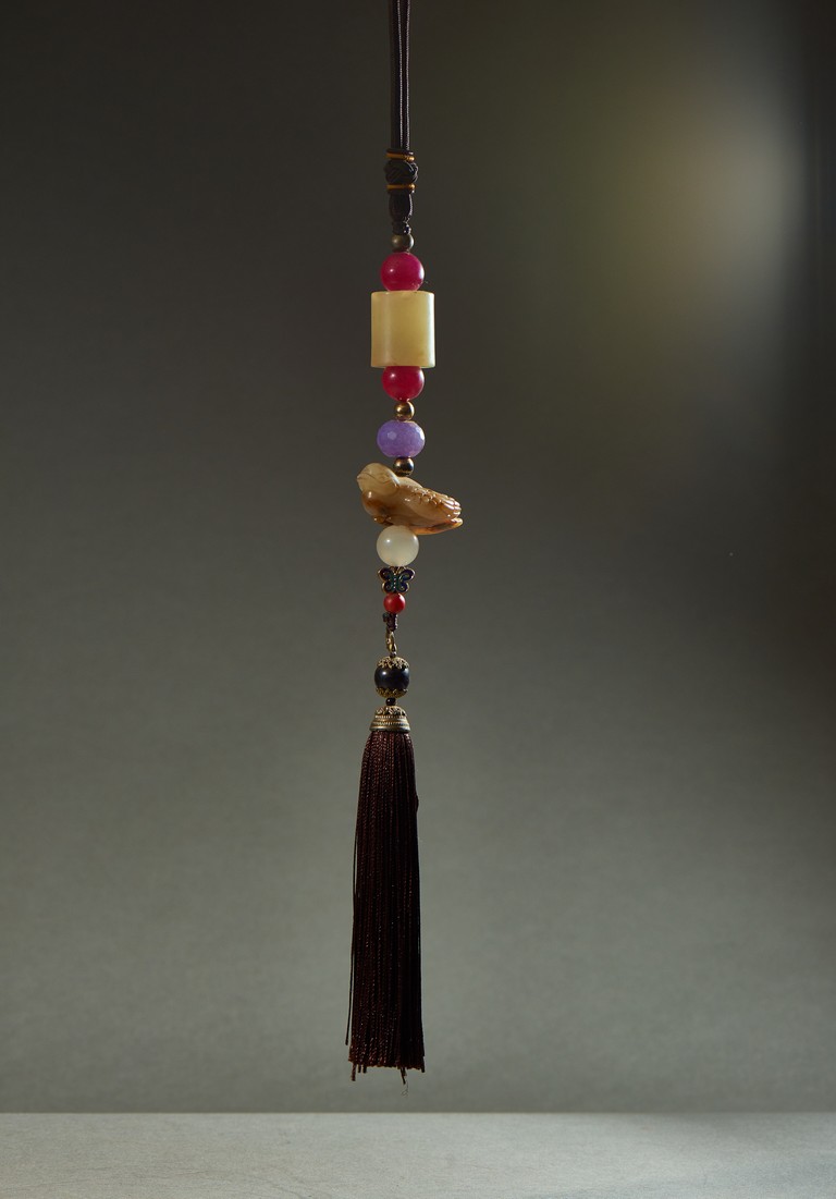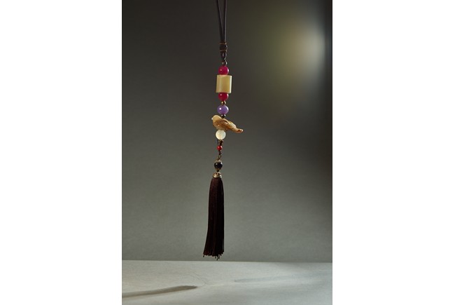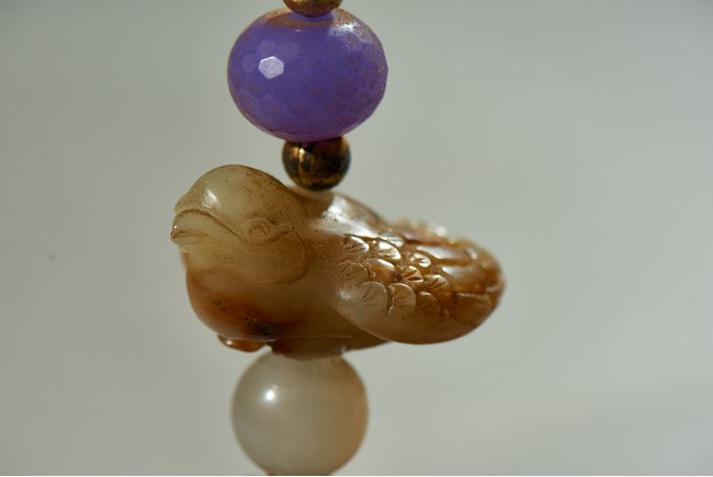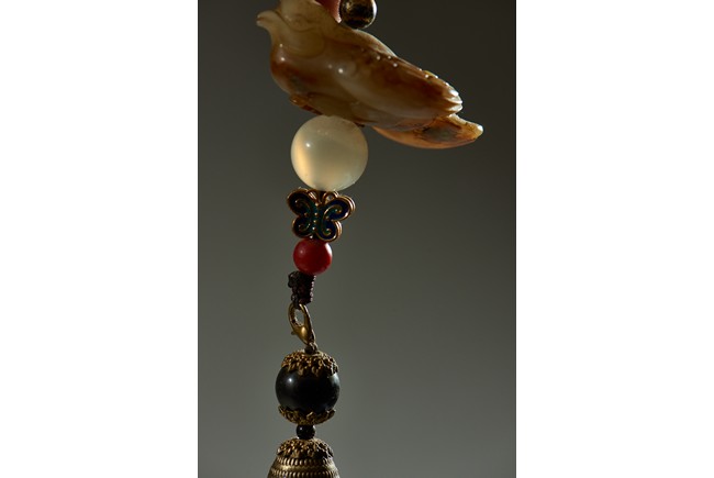 The jade pendant carved in the form of bird with detailed feather, the head with beak and rounded eyes.