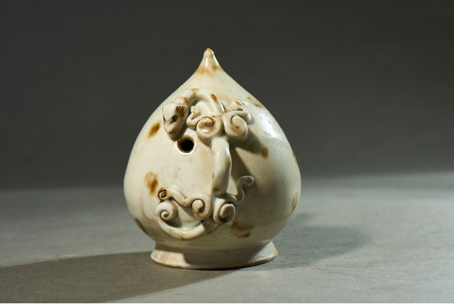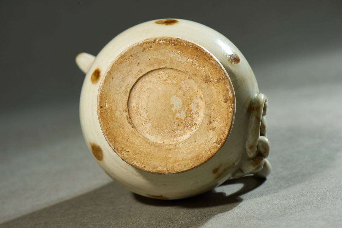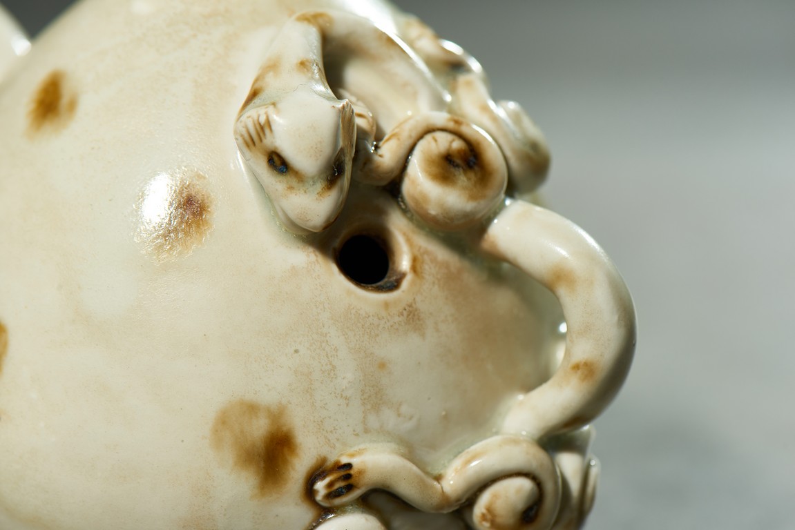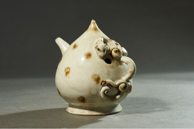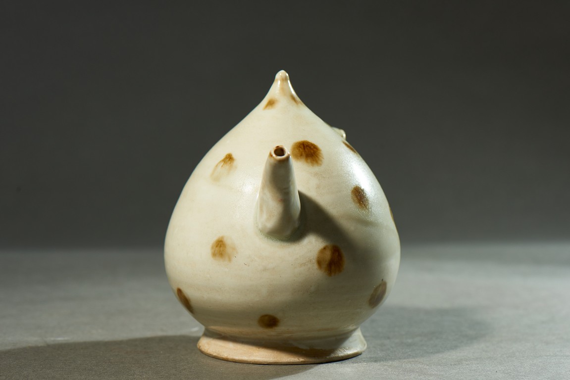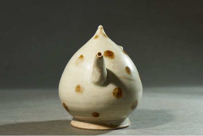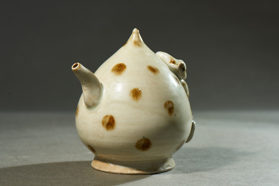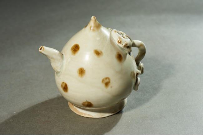 In the shape of a peach raised on a spreading foot, with chilong-form handle and spout, overall in creamy white glaze with russet splashes. Base unglazed.