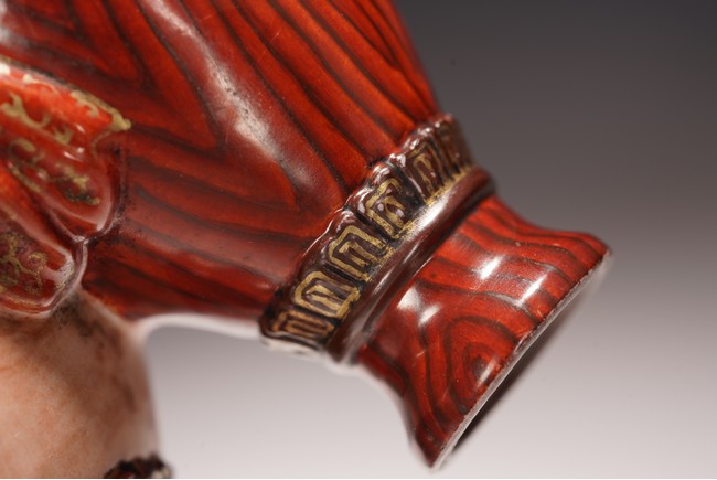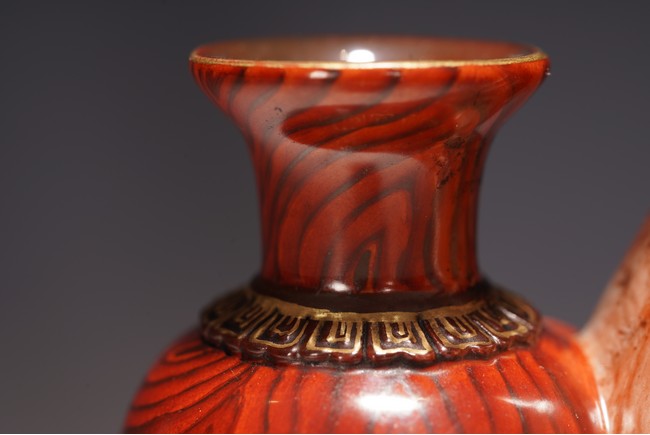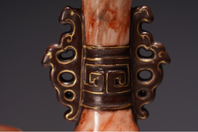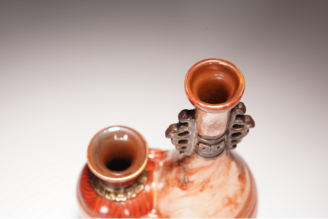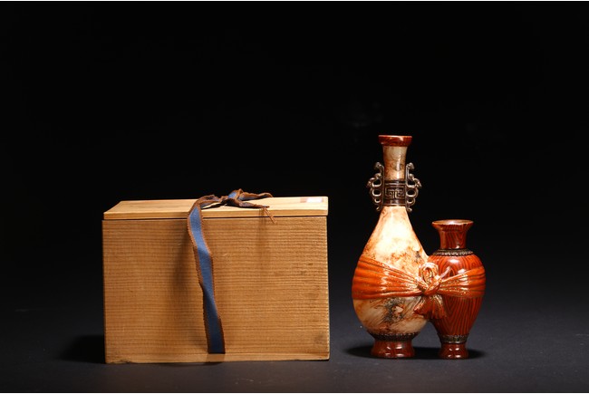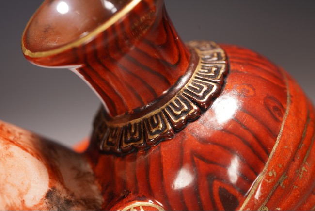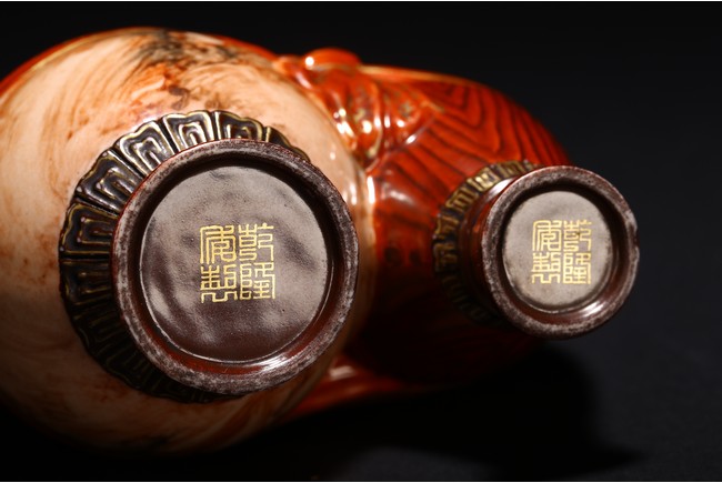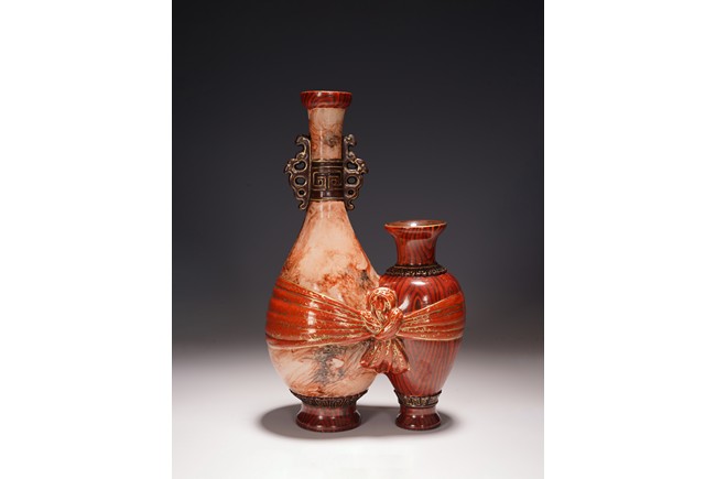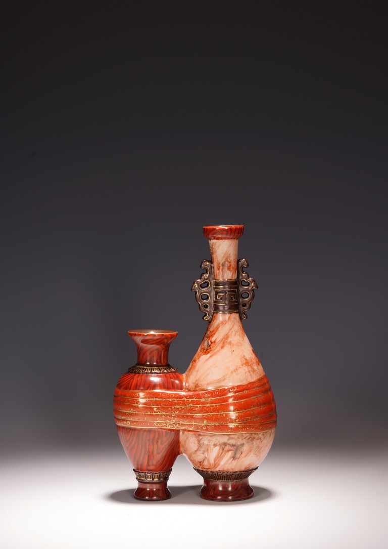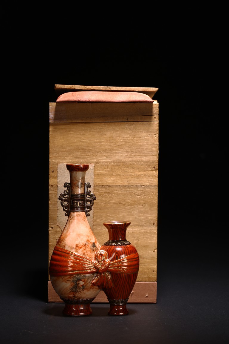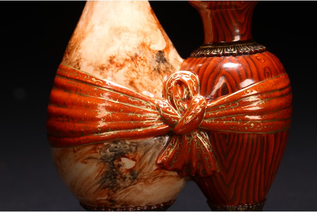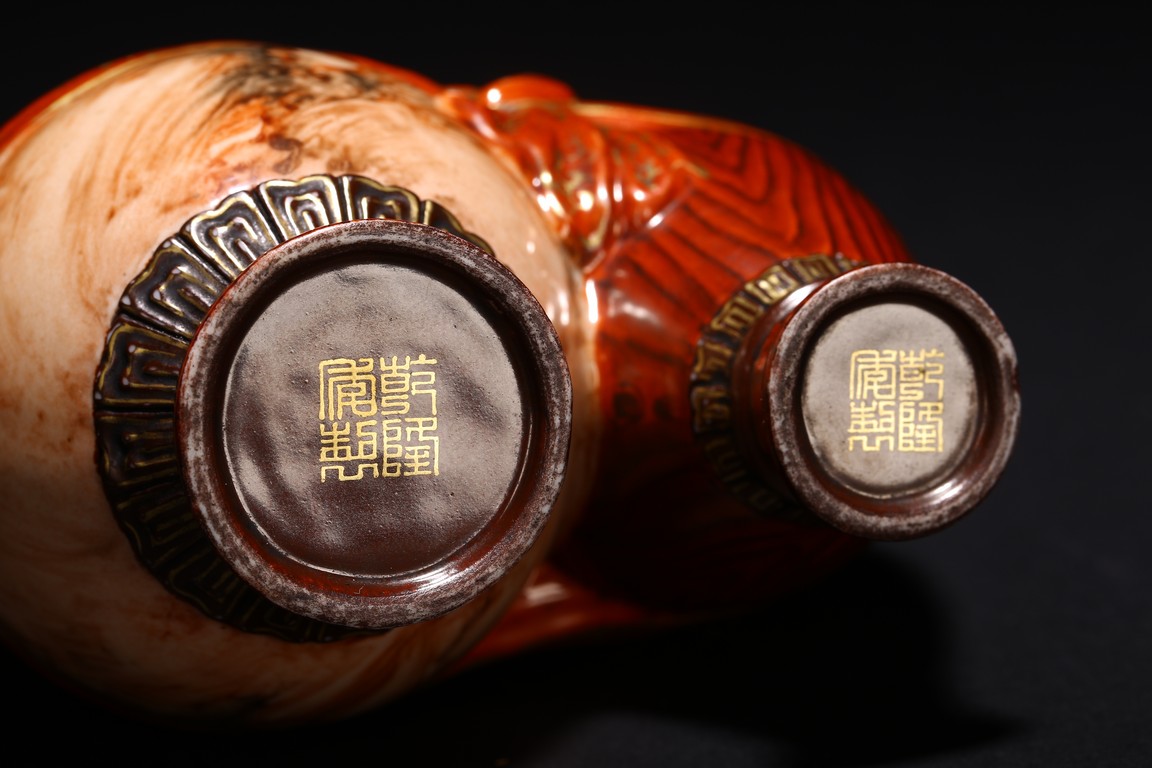 本品設計別緻新巧,以大小長頸瓶和觀音瓶聯合而成。大者直口,長頸,頸上有雙耳,垂腹,圈足微撇。小瓶為侈口,細頸,溜肩,圈足微撇。兩瓶連為一體,雕塑一包袱將二者捆在一起,結扣置於中間,形像生動,足具趣味。大瓶通體施石紋,色彩深淡相宜,紋路舒展相間,繪圖如石紋狀自然有序,又似行雲流水般暢酣,紋理空隙間見洞石之奇妙效果。小瓶通體施仿木釉,顏色、花紋描繪惟妙惟肖。包袱施珊瑚紅彩,上有描金。描金“乾隆年制” 款識。