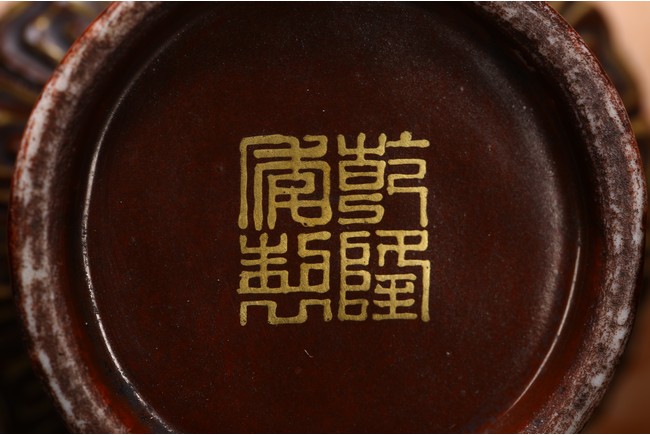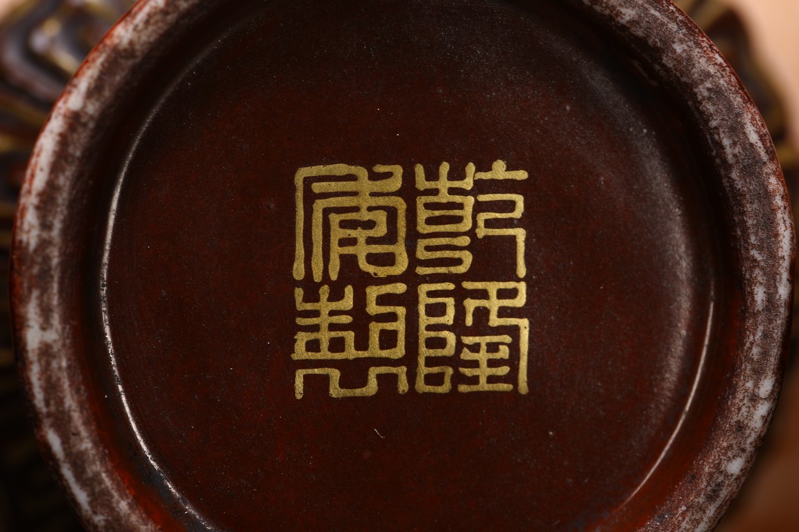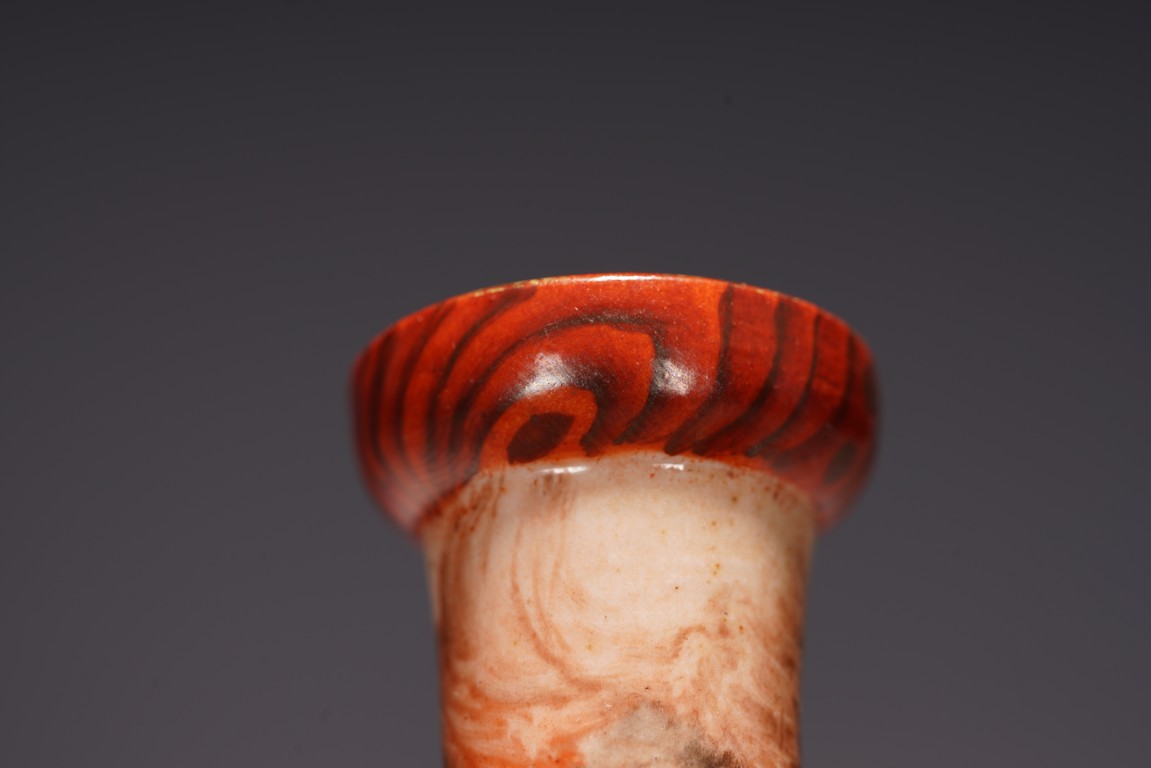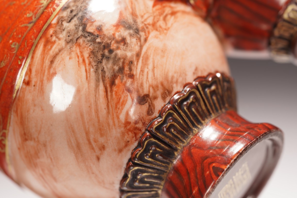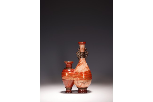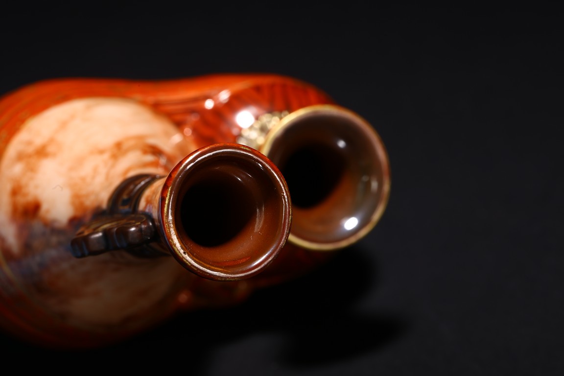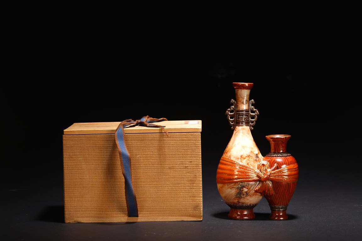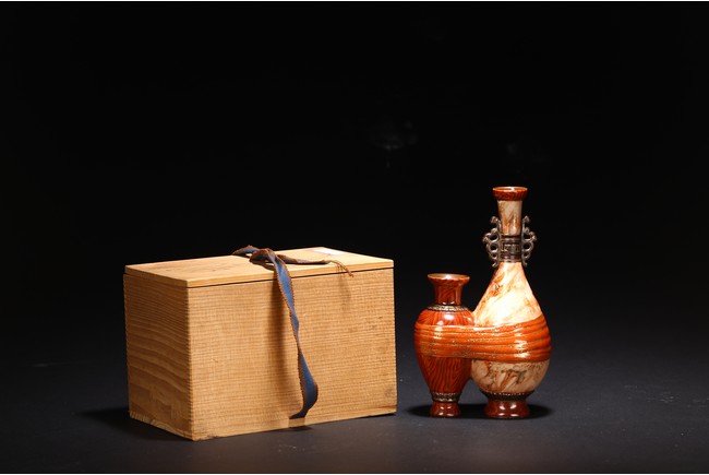 本品設計別緻新巧,以大小長頸瓶和觀音瓶聯合而成。大者直口,長頸,頸上有雙耳,垂腹,圈足微撇。小瓶為侈口,細頸,溜肩,圈足微撇。兩瓶連為一體,雕塑一包袱將二者捆在一起,結扣置於中間,形像生動,足具趣味。大瓶通體施石紋,色彩深淡相宜,紋路舒展相間,繪圖如石紋狀自然有序,又似行雲流水般暢酣,紋理空隙間見洞石之奇妙效果。小瓶通體施仿木釉,顏色、花紋描繪惟妙惟肖。包袱施珊瑚紅彩,上有描金。描金“乾隆年制” 款識。