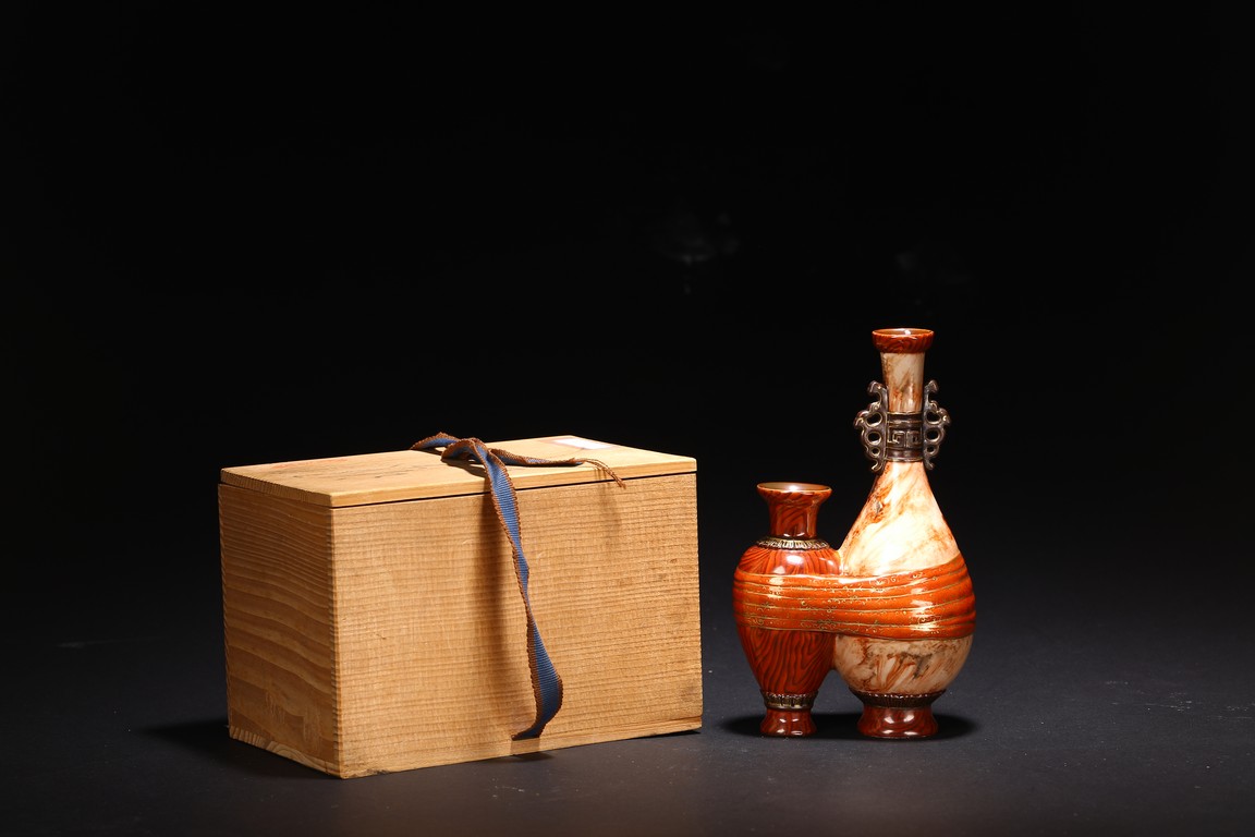 Consisting with two conjoined vases, one enamelled with wood grain imitation ground, the other with pear shape overall with rock grain imitation ground, tied together by a gilt painted sash, each base bearing four character Qianlong reign mark.