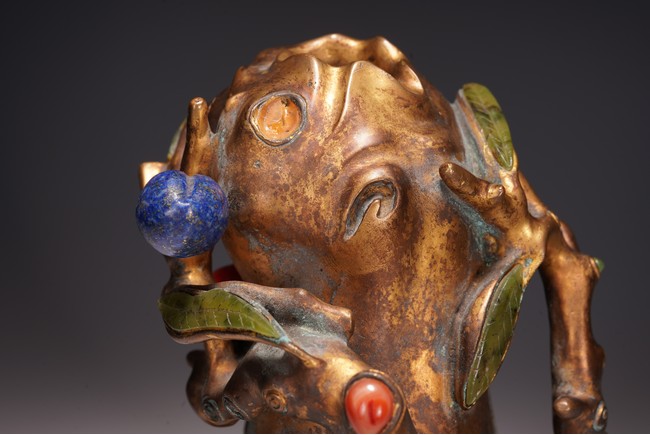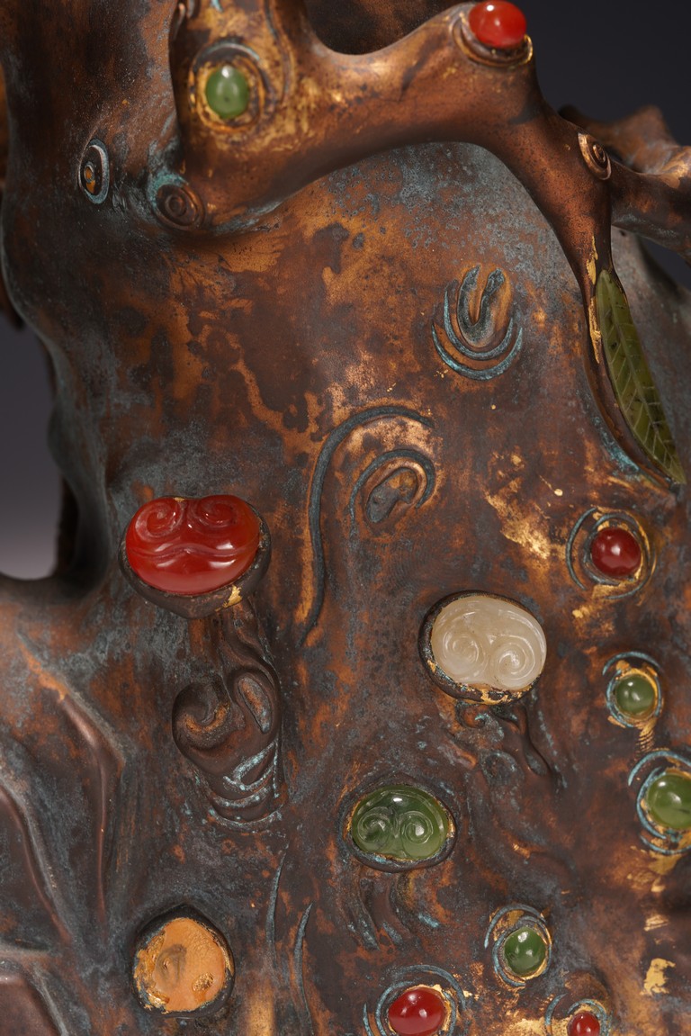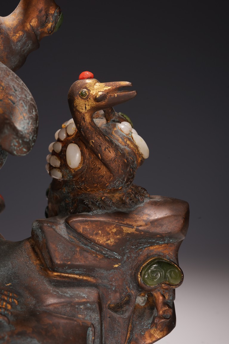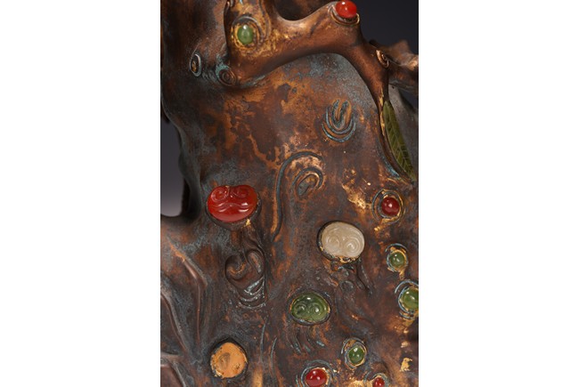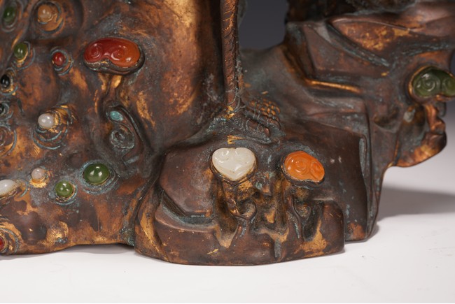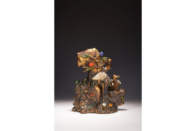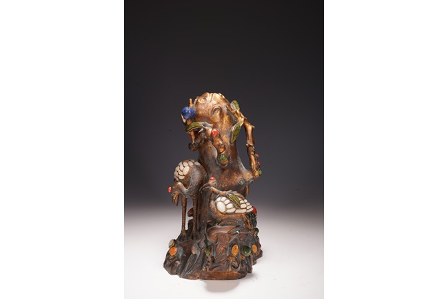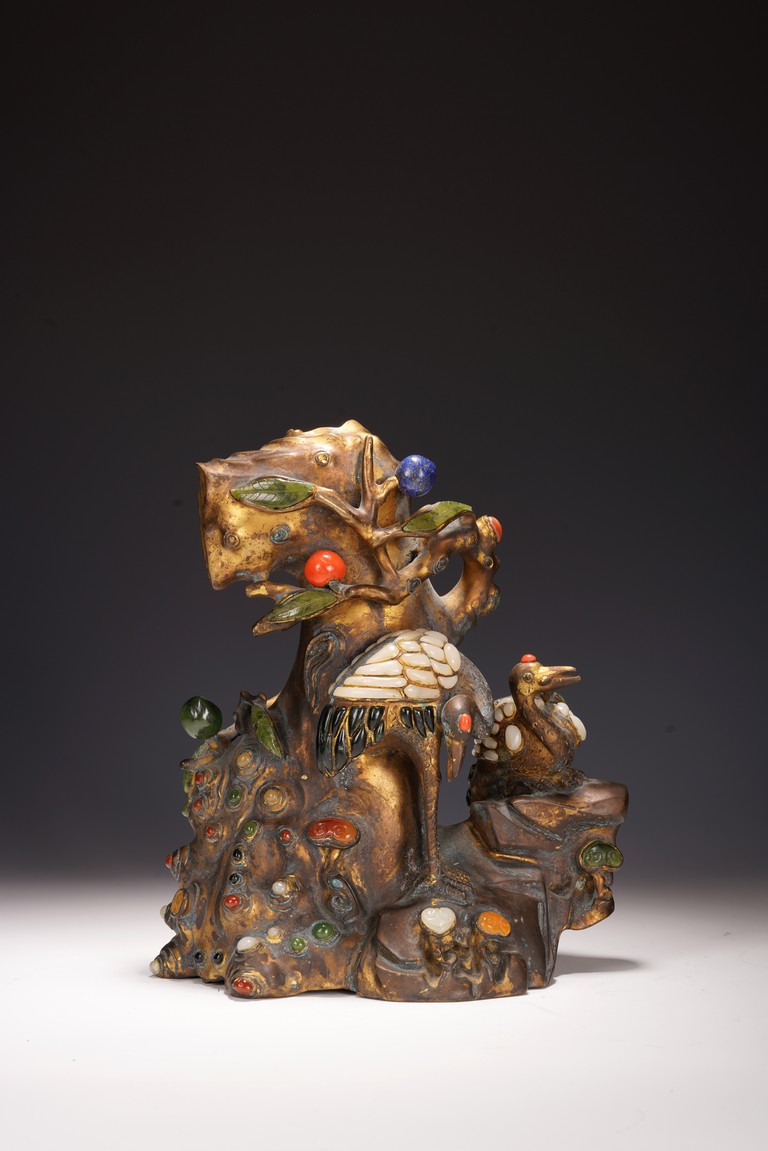 此擺件以整塑幹枝山石造型,山石旁兩隻仙鶴依偎,幾枝桃枝蜿蜒而上,小小的靈芝依石而生,仙鶴、桃、靈芝等以各種寶石鑲嵌,顏色豐富。整體造型別緻,工藝精湛,古樸而不施華麗,包漿自然,設計巧妙,文房精緻擺件,值得收藏。