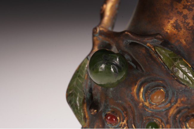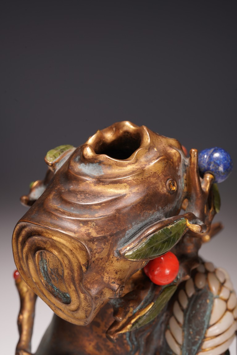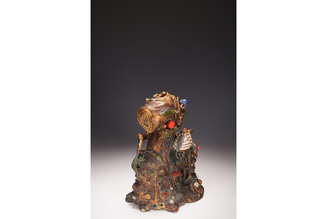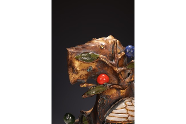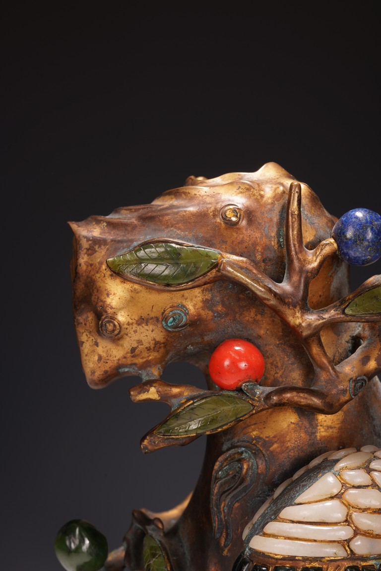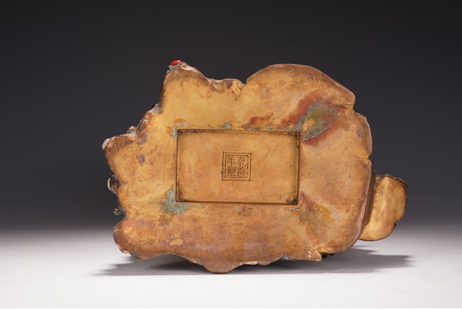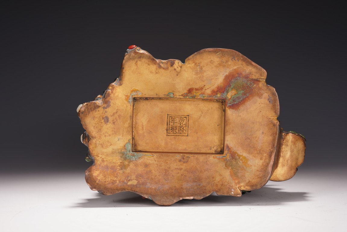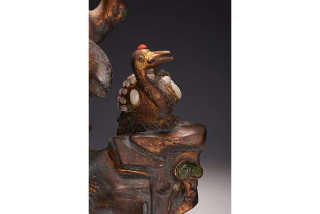 此擺件以整塑幹枝山石造型,山石旁兩隻仙鶴依偎,幾枝桃枝蜿蜒而上,小小的靈芝依石而生,仙鶴、桃、靈芝等以各種寶石鑲嵌,顏色豐富。整體造型別緻,工藝精湛,古樸而不施華麗,包漿自然,設計巧妙,文房精緻擺件,值得收藏。