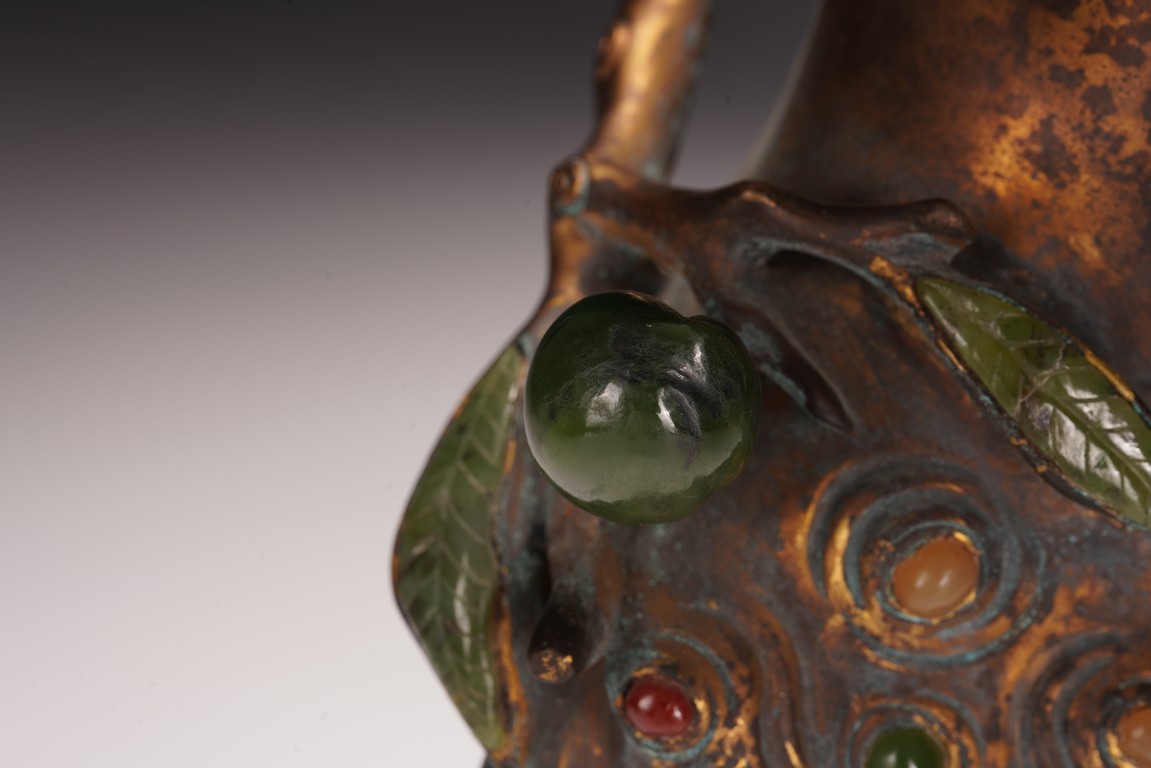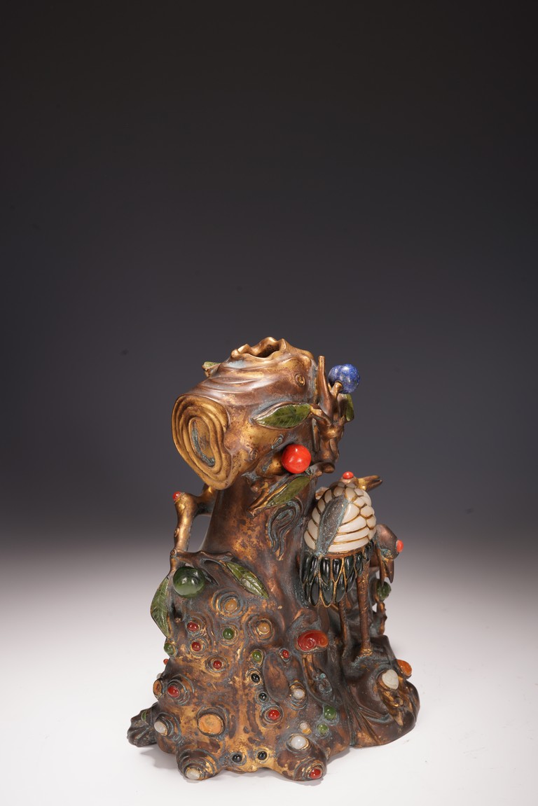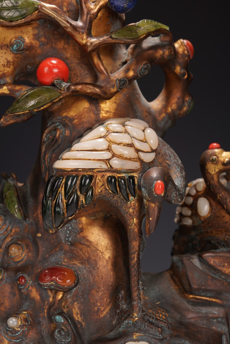 Inlaid with various semi precious gems and depicting cranes next to trunk.