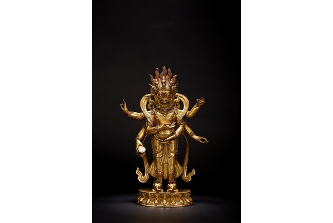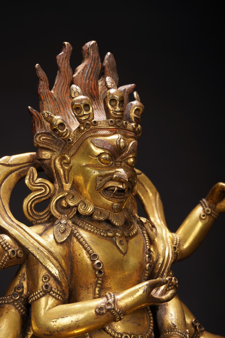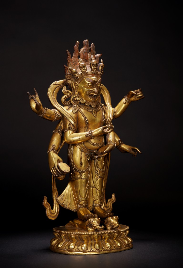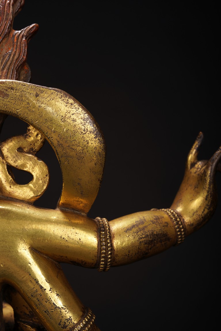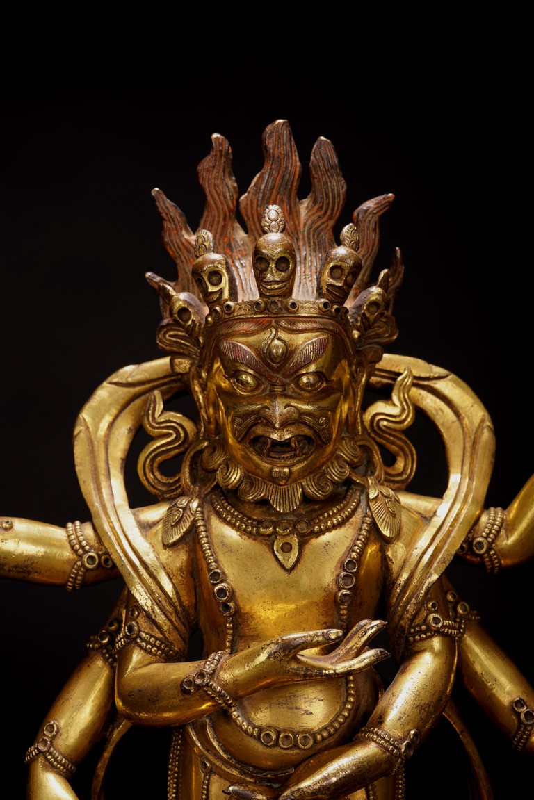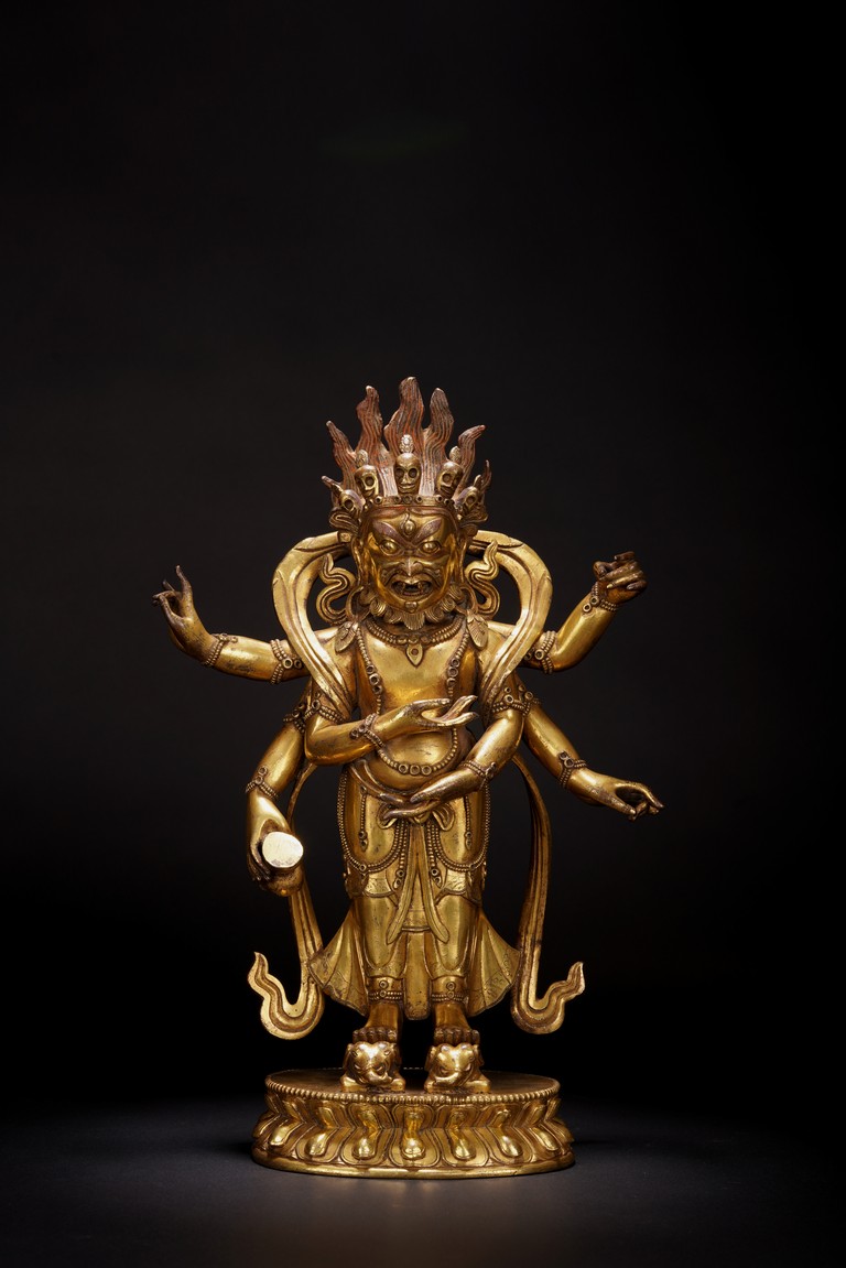 白瑪哈嘎拉是藏傳佛教中一尊重要護法神,在密教中廣受尊崇,從元代開始便受到歷代帝王的信奉。此尊頭戴寶冠,紅色怒髮上沖。三目圓睜,閃舌咧口,相容兇忿。身披寶繒,隨風飄揚,項掛瓔珞。主臂一上一下施無畏印,其餘三臂施說法印,一臂持寶物。足踏邪引天,下承仰覆蓮台。整體造型飽滿生動,鑄造工藝精湛,鎏金華美,殊為難得。 來源:紐約重要私人藏家收藏 Provenance: Property from an important collection, New York