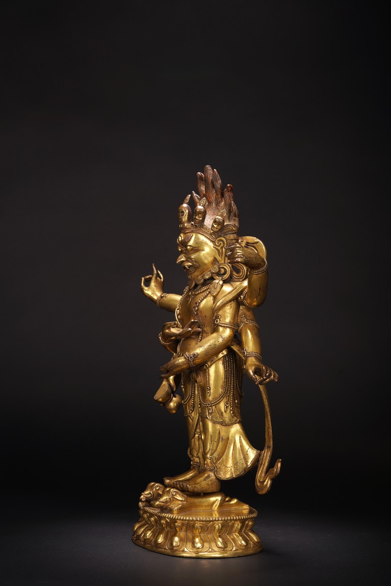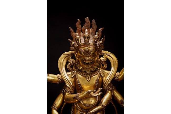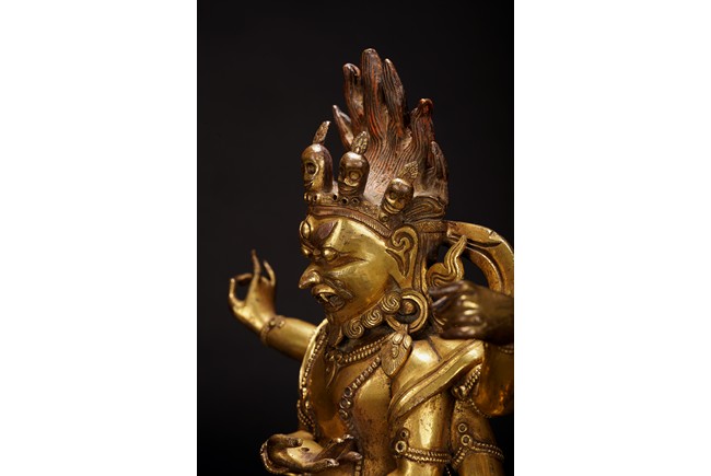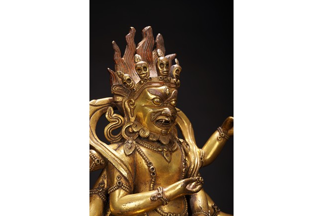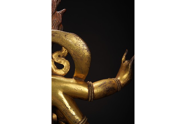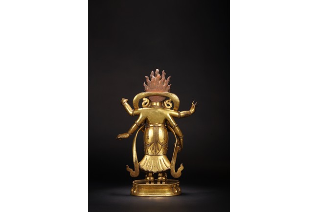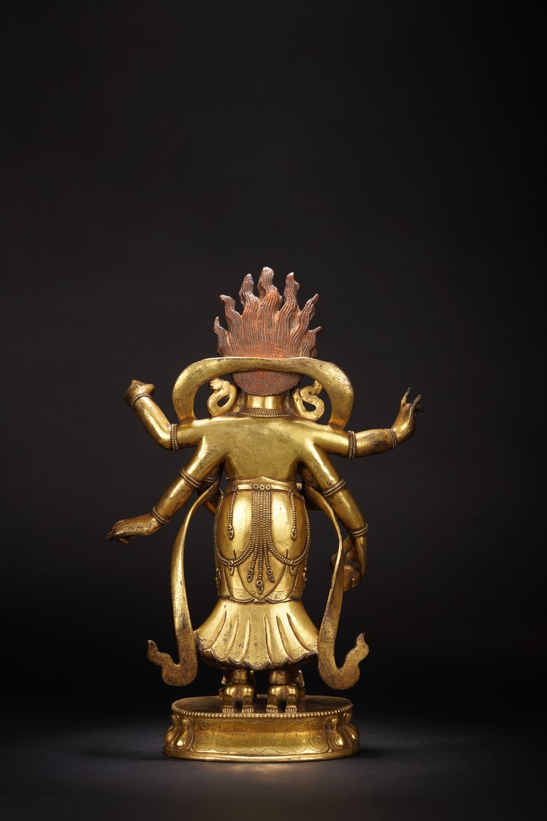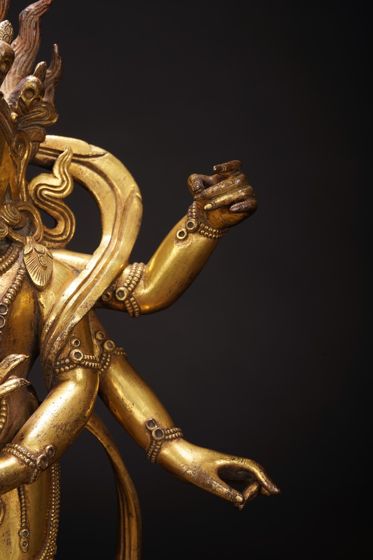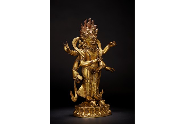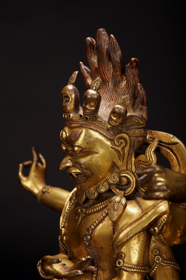白瑪哈嘎拉是藏傳佛教中一尊重要護法神,在密教中廣受尊崇,從元代開始便受到歷代帝王的信奉。此尊頭戴寶冠,紅色怒髮上沖。三目圓睜,閃舌咧口,相容兇忿。身披寶繒,隨風飄揚,項掛瓔珞。主臂一上一下施無畏印,其餘三臂施說法印,一臂持寶物。足踏邪引天,下承仰覆蓮台。整體造型飽滿生動,鑄造工藝精湛,鎏金華美,殊為難得。 來源:紐約重要私人藏家收藏 Provenance: Property from an important collection, New York