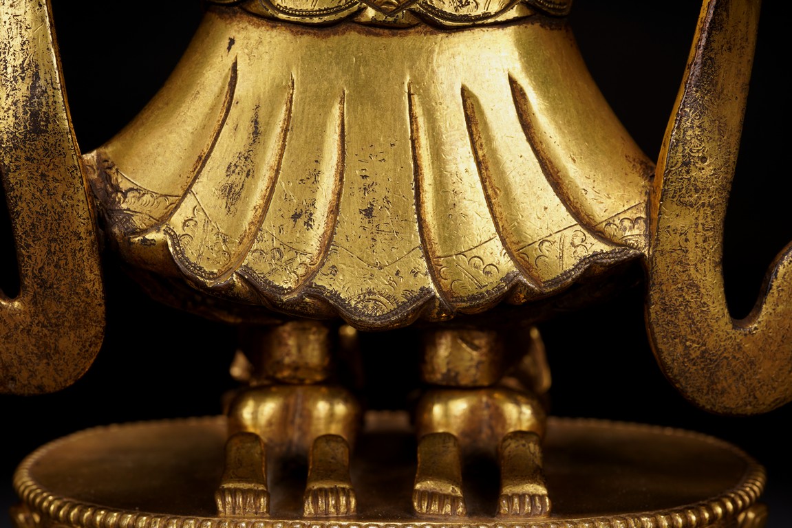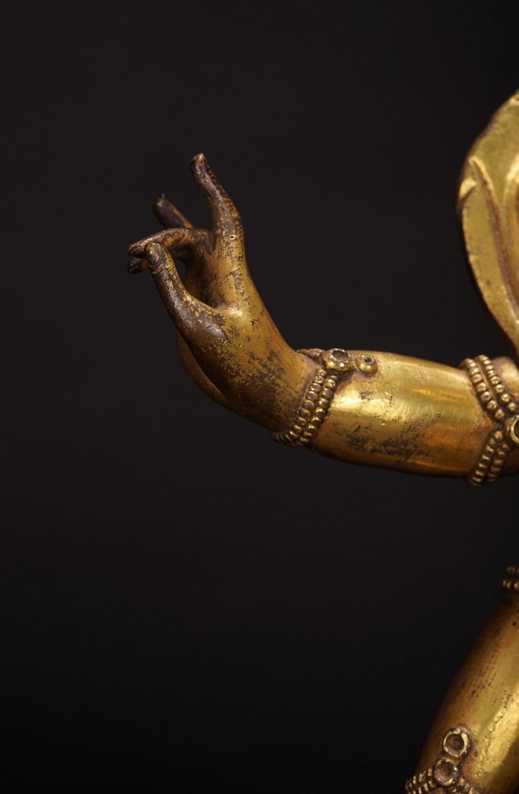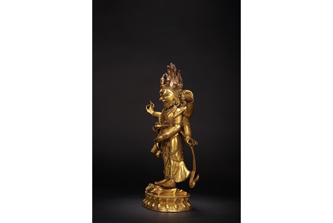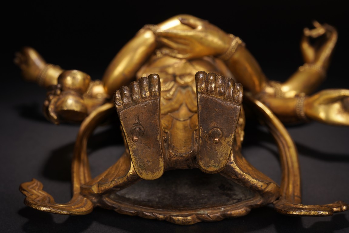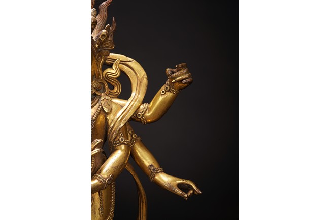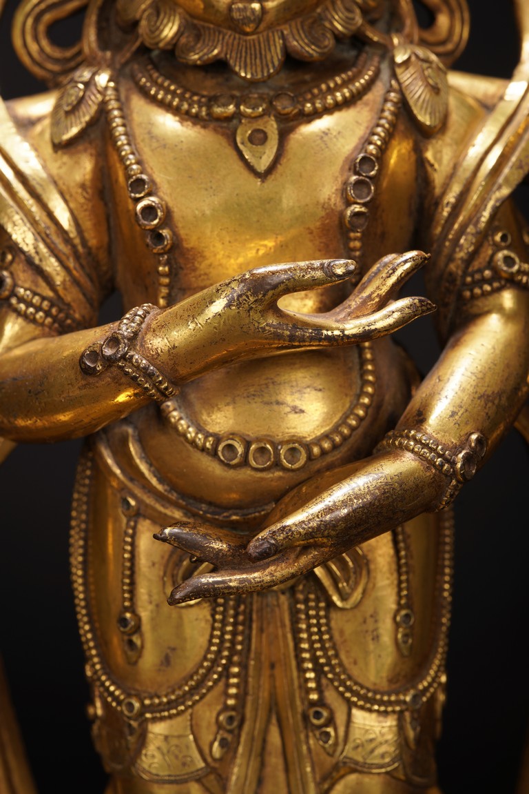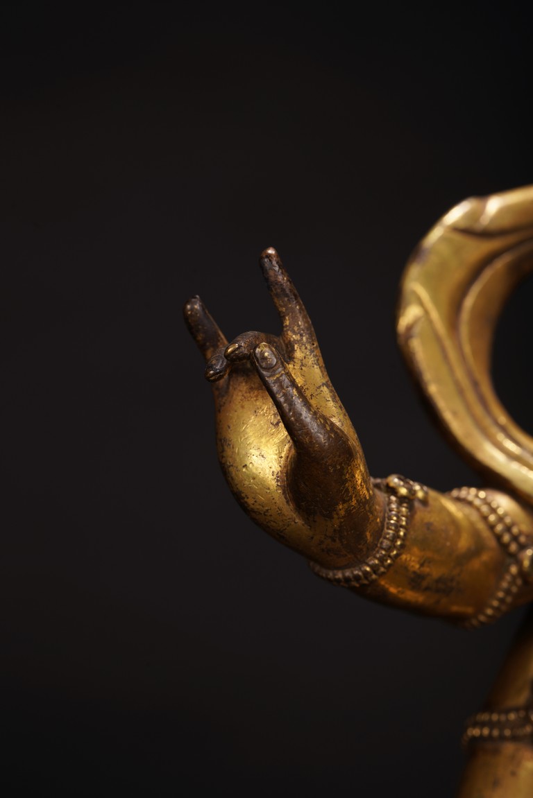白瑪哈嘎拉是藏傳佛教中一尊重要護法神,在密教中廣受尊崇,從元代開始便受到歷代帝王的信奉。此尊頭戴寶冠,紅色怒髮上沖。三目圓睜,閃舌咧口,相容兇忿。身披寶繒,隨風飄揚,項掛瓔珞。主臂一上一下施無畏印,其餘三臂施說法印,一臂持寶物。足踏邪引天,下承仰覆蓮台。整體造型飽滿生動,鑄造工藝精湛,鎏金華美,殊為難得。 來源:紐約重要私人藏家收藏 Provenance: Property from an important collection, New York