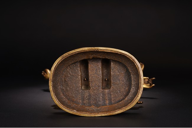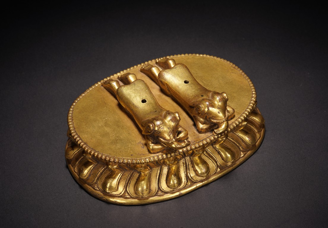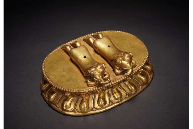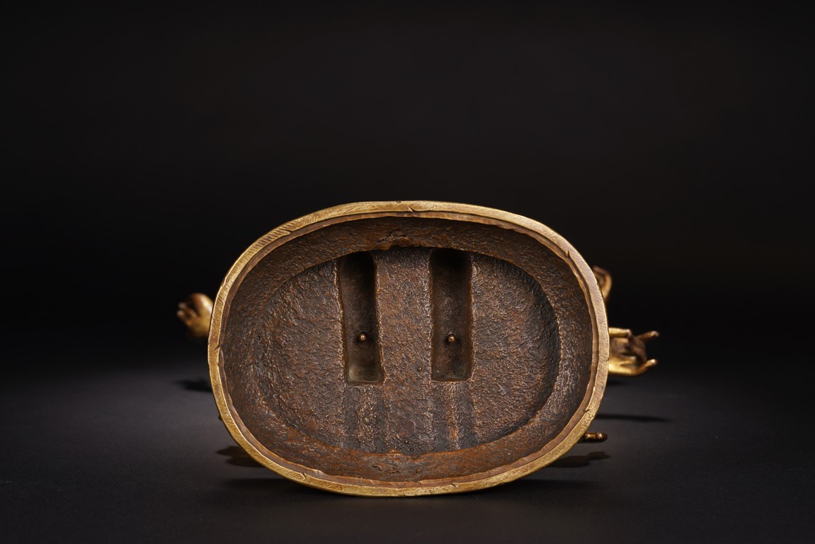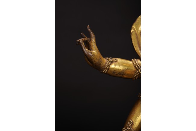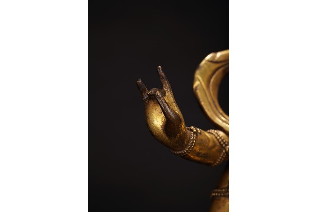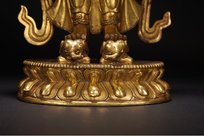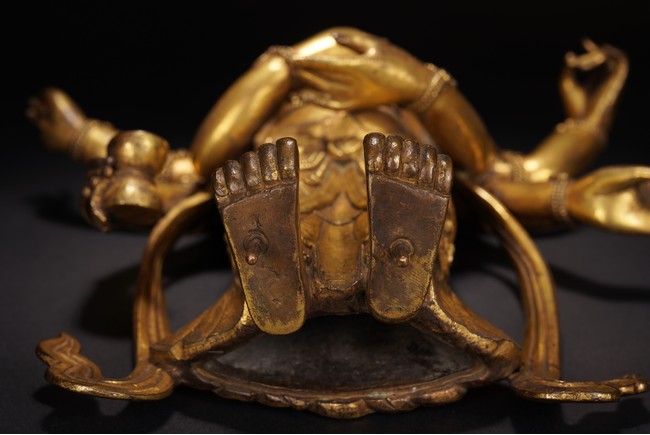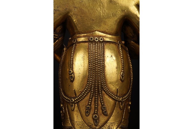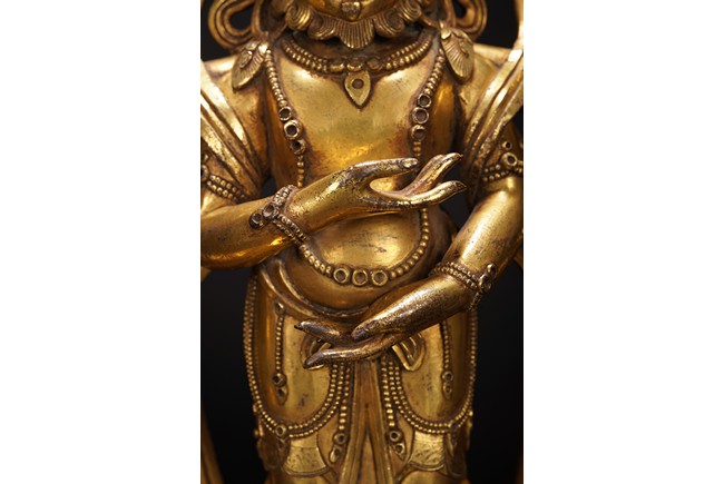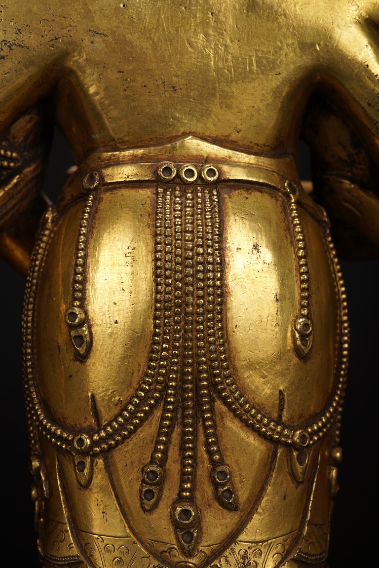 白瑪哈嘎拉是藏傳佛教中一尊重要護法神,在密教中廣受尊崇,從元代開始便受到歷代帝王的信奉。此尊頭戴寶冠,紅色怒髮上沖。三目圓睜,閃舌咧口,相容兇忿。身披寶繒,隨風飄揚,項掛瓔珞。主臂一上一下施無畏印,其餘三臂施說法印,一臂持寶物。足踏邪引天,下承仰覆蓮台。整體造型飽滿生動,鑄造工藝精湛,鎏金華美,殊為難得。 來源:紐約重要私人藏家收藏 Provenance: Property from an important collection, New York