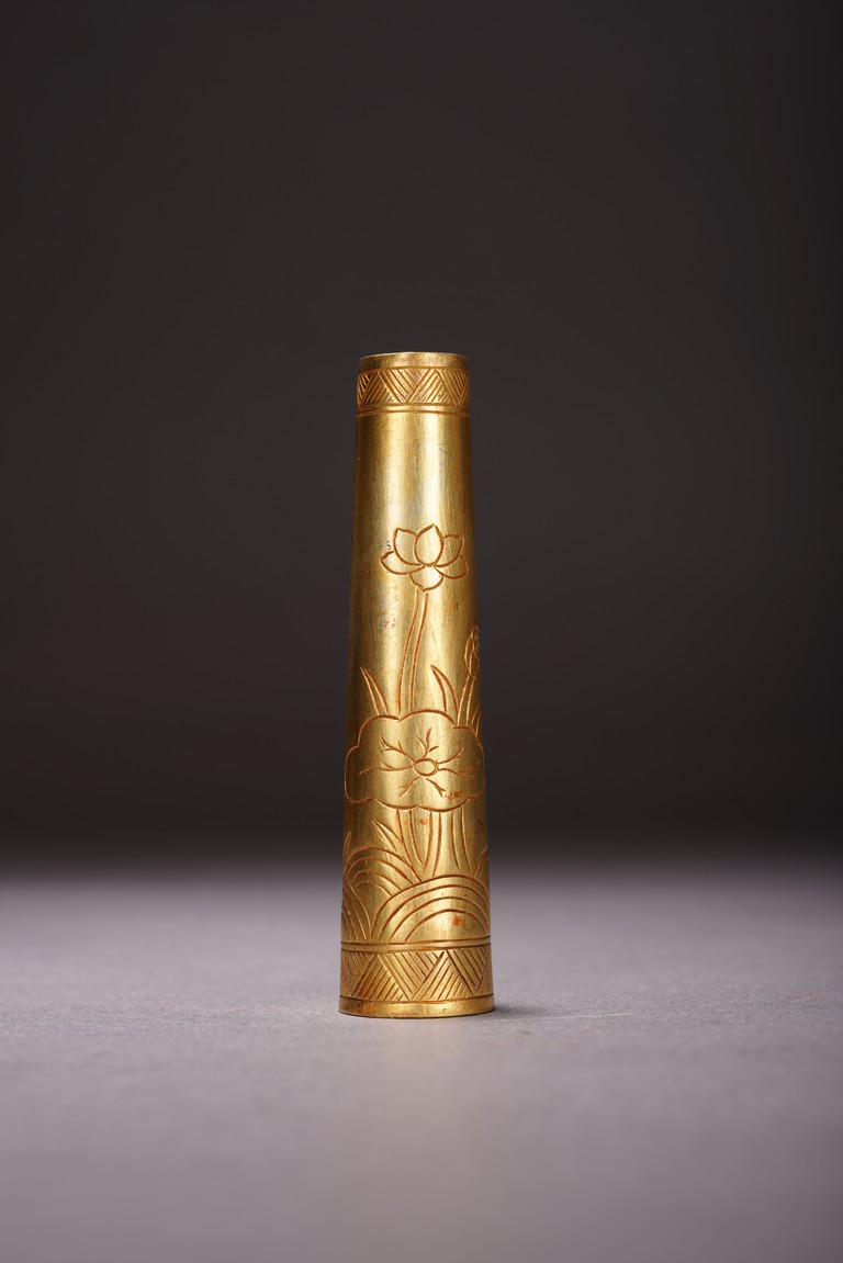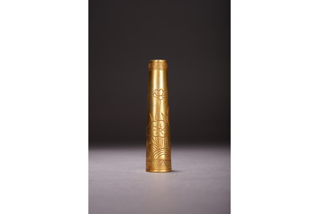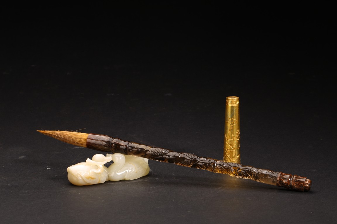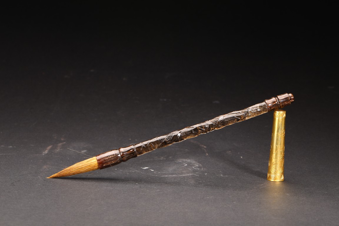 The crystal brush shaft carved with dragon in relief, completed with a gilt bronze brush cover incised with lotus decorations.