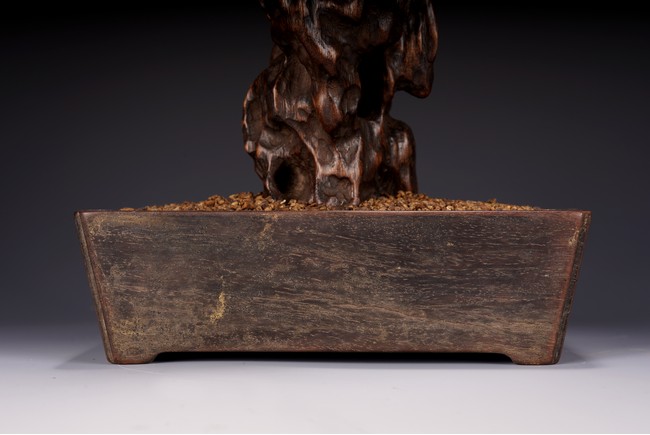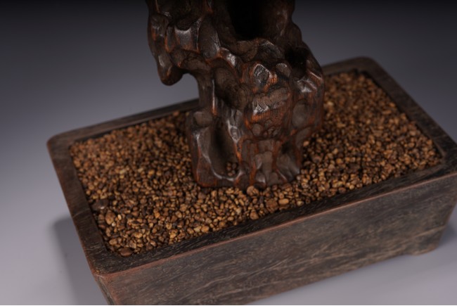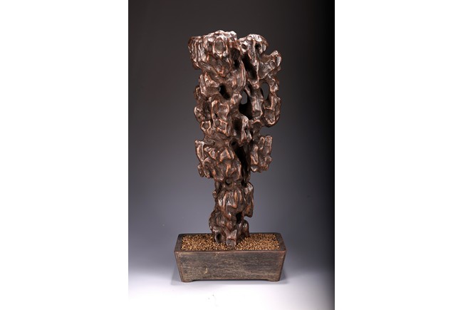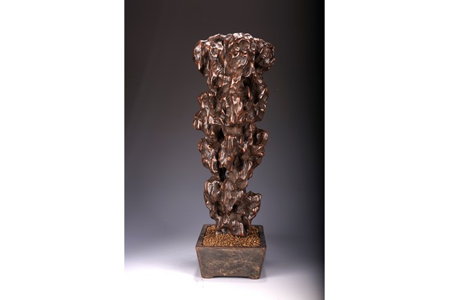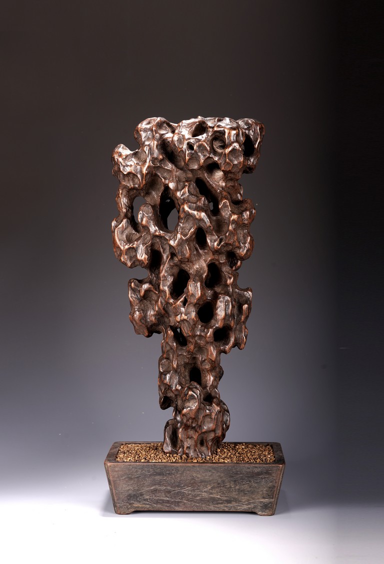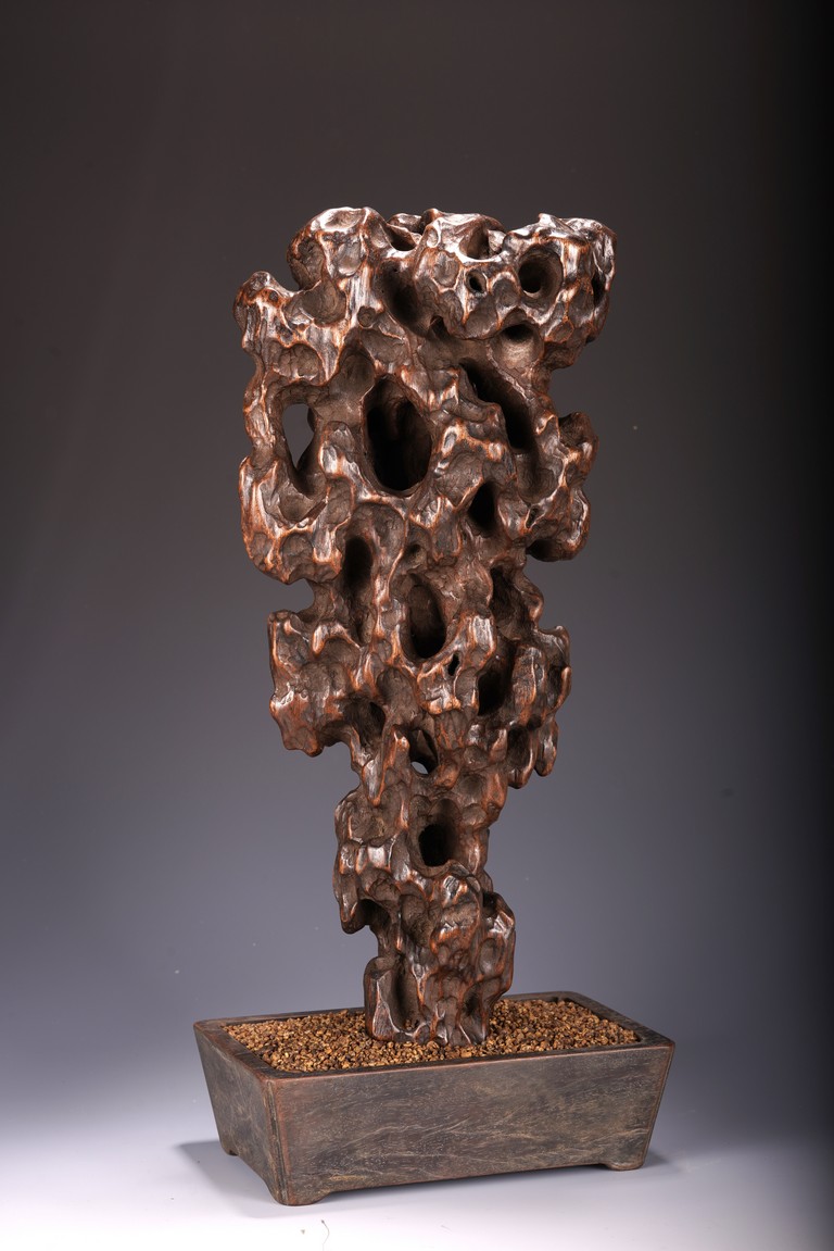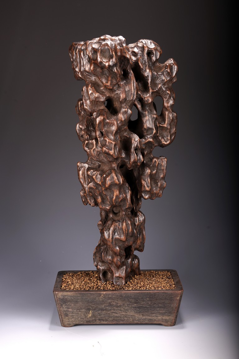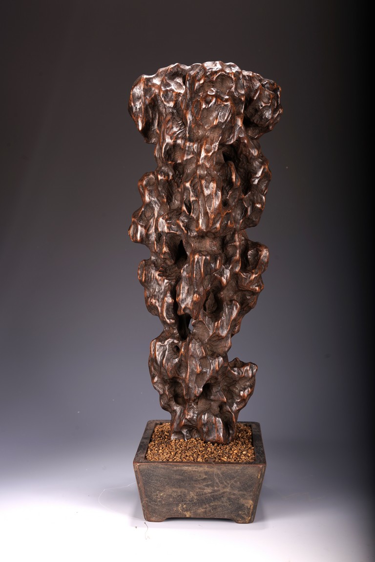 The agarwood carved in the form of a scholar's rock with vertically oriented form accentuated with various crevices, ridges and jagged protrusions, all supported on a rectangular flowerpot.