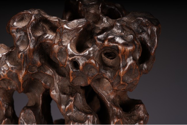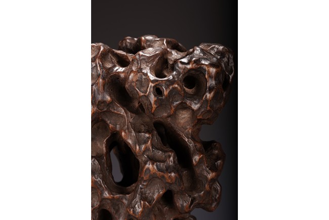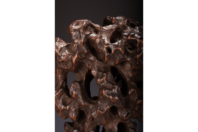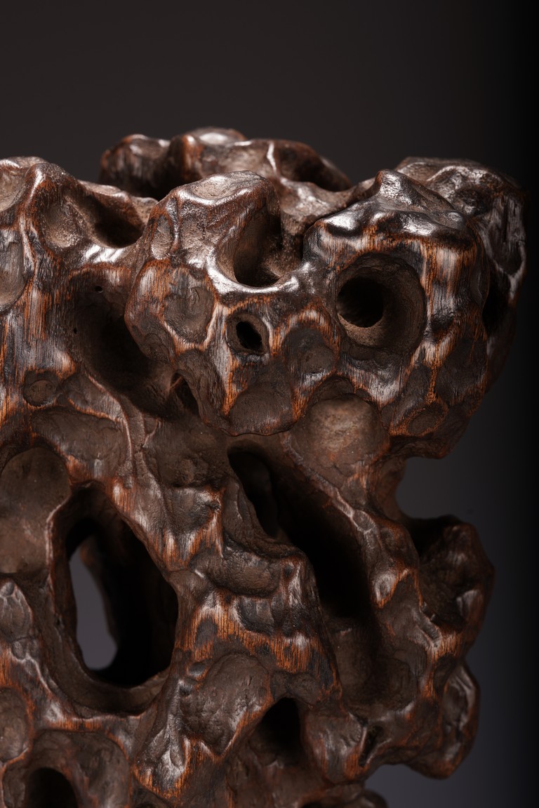 此山子以沉香木為材隨形雕就,仿靈石造型,千奇百態,靈動自然,“皺、漏、瘦、透”之美表現的淋漓盡致。包漿自然,色澤深沉,造型美觀,為難得的文房賞石擺件。