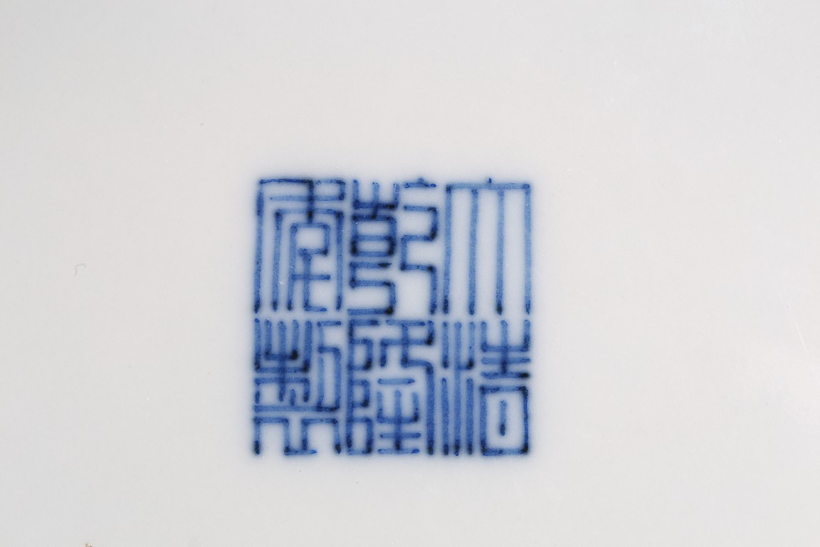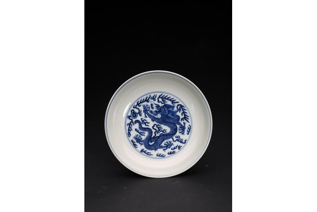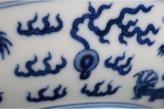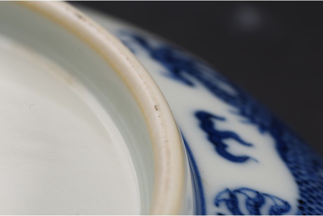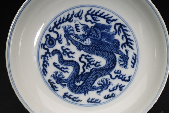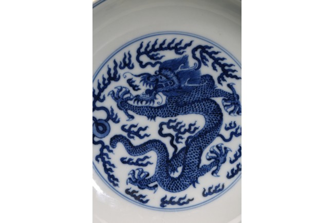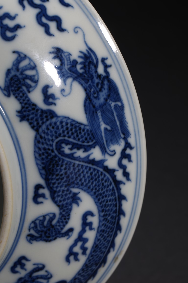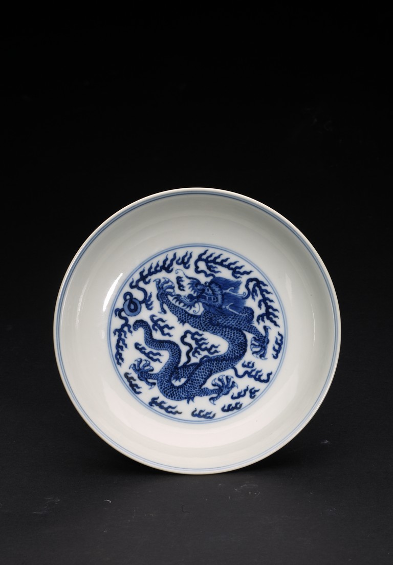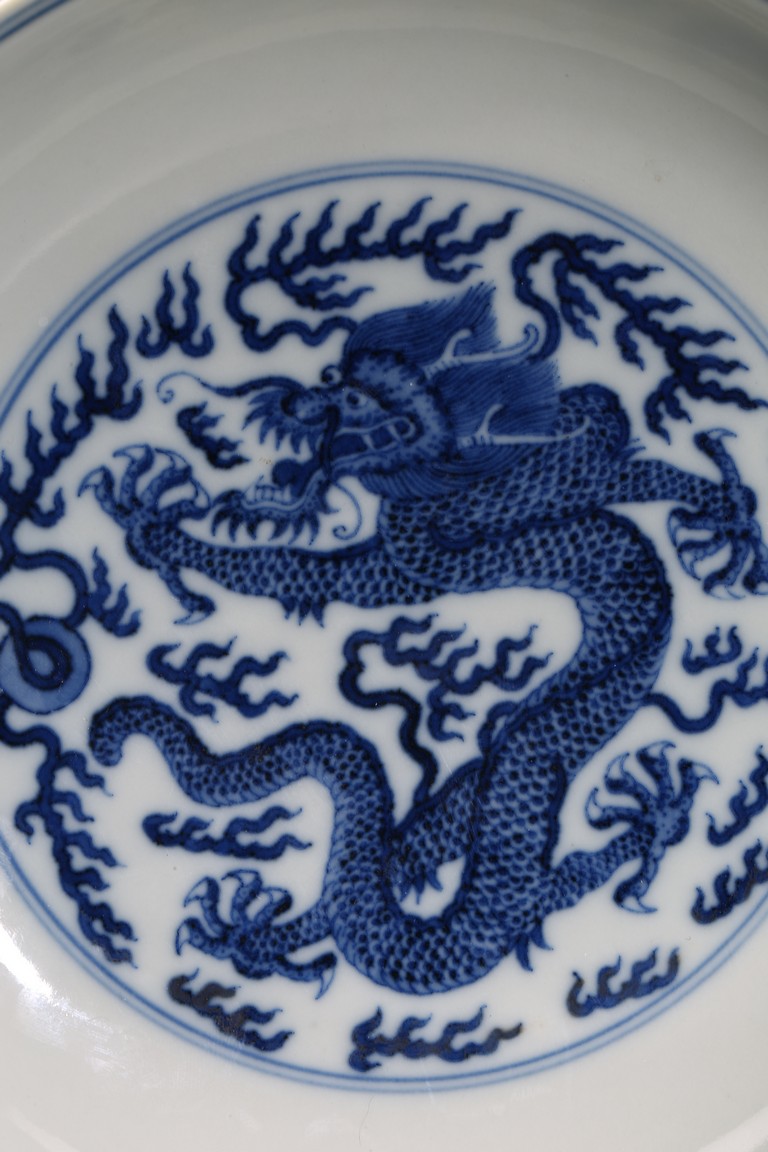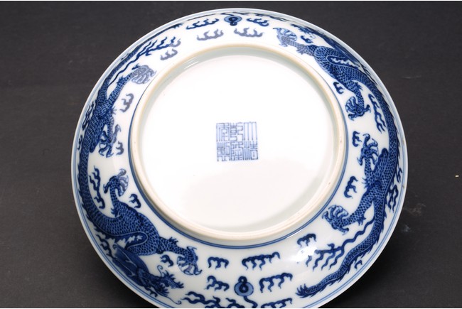 盤口外擴,淺弧腹,底承圈足,青花发色明亮清晰,盤心繪飾一條立舞威龍,趾爪有力,氣勢磅礴,神形兼具,其身著火焰,身前戲火珠,實為精彩。“大清乾隆年制”款識。