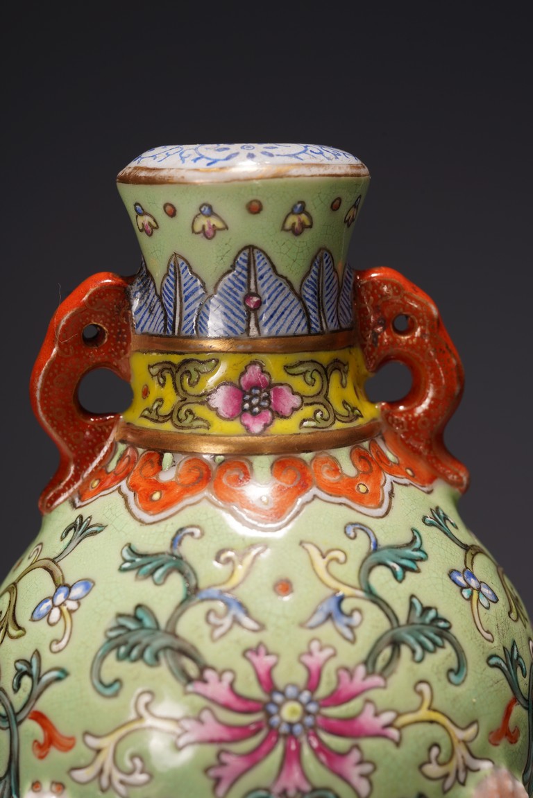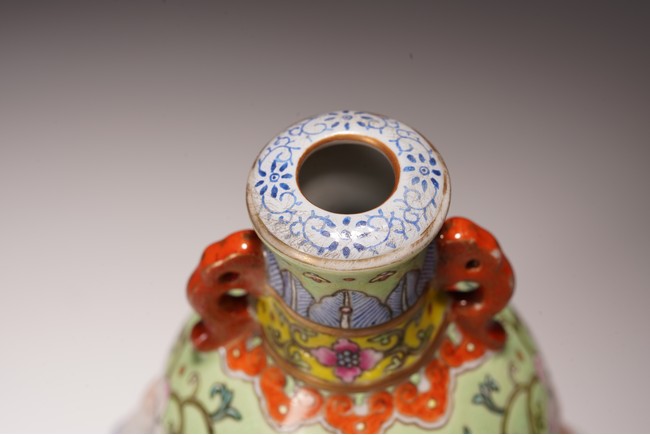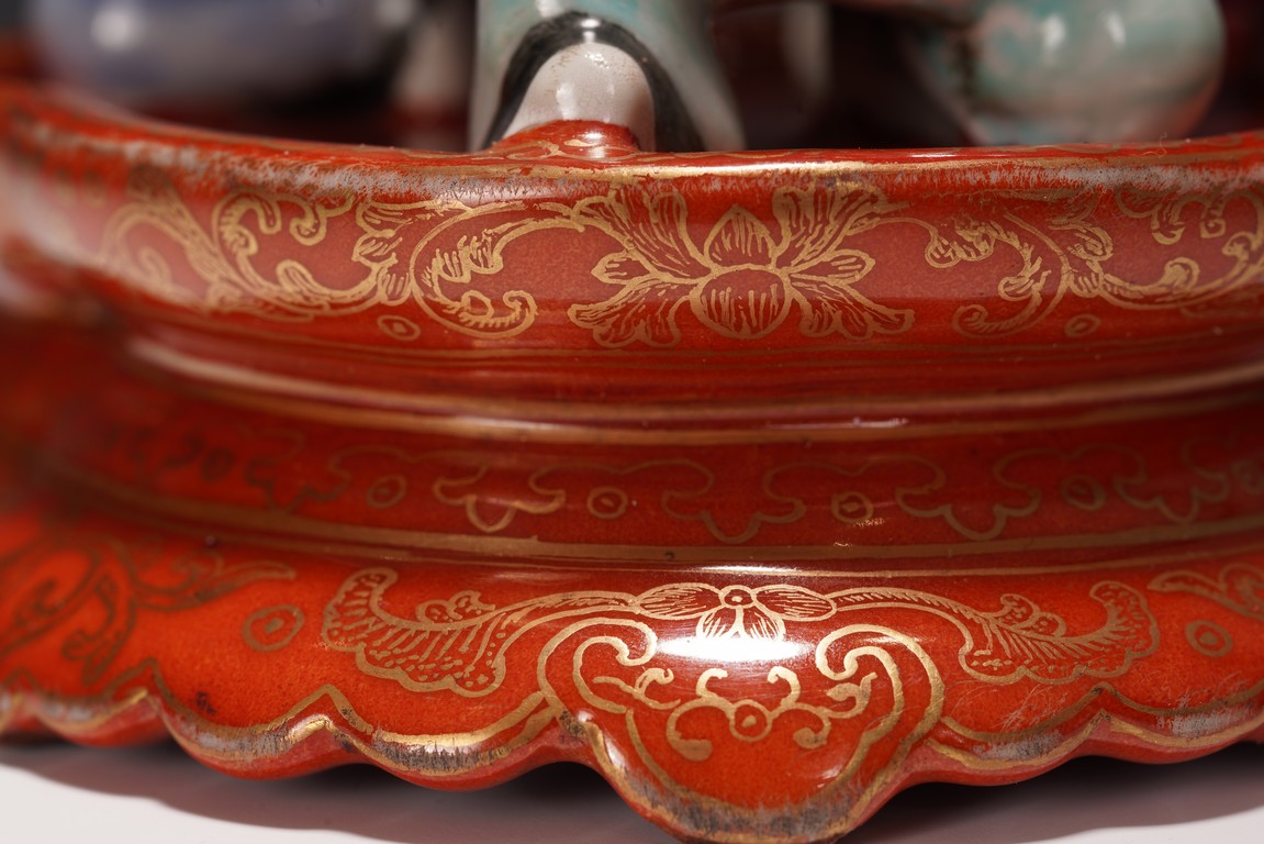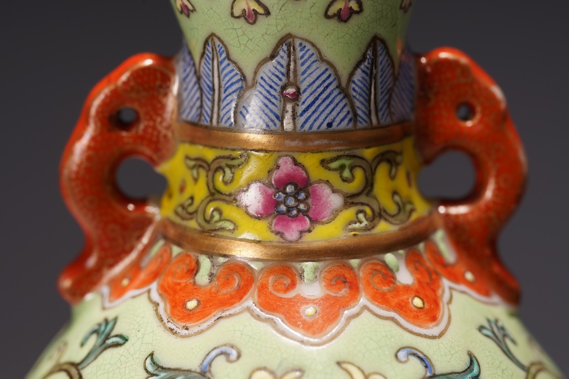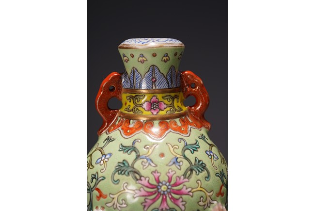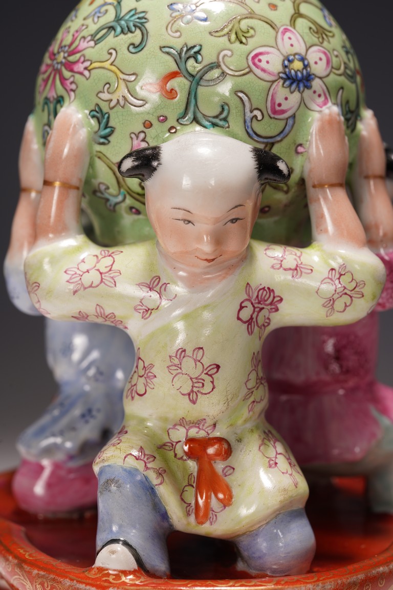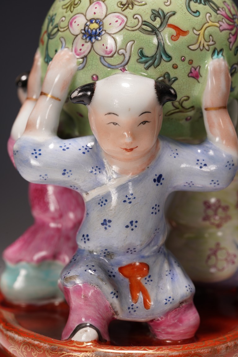 Qing Dynasty period. The vase is finely enamelled with lotus sprays reserved on green ground around the body, the waisted neck flanked by pair of openwork handles decorated in gilt paint, all supported by three kneeled boys, their clothes and facial features finely detailed, all raised on red glazed stand painted with floral scrolls, the underside bearing a six character Qianlong reign mark.