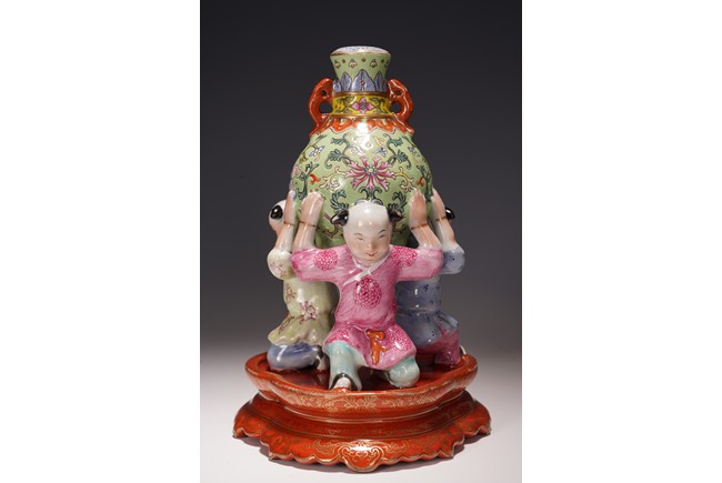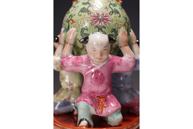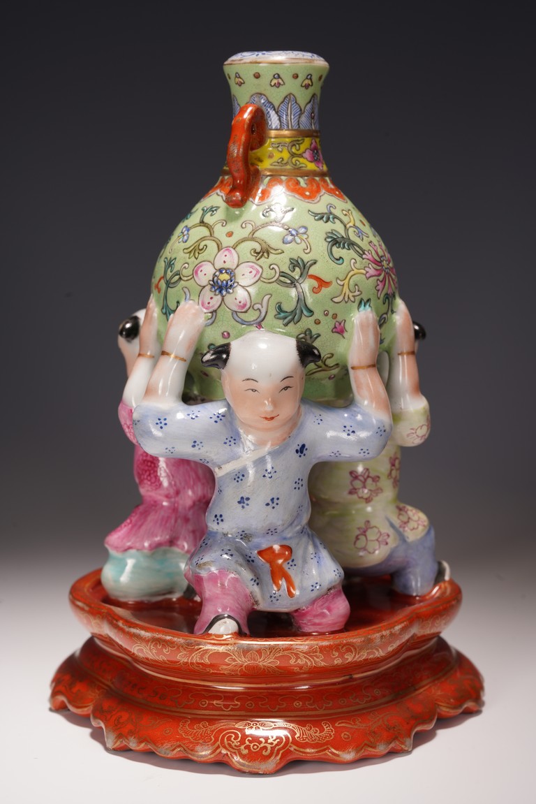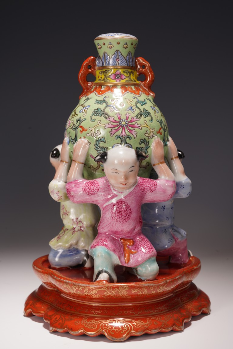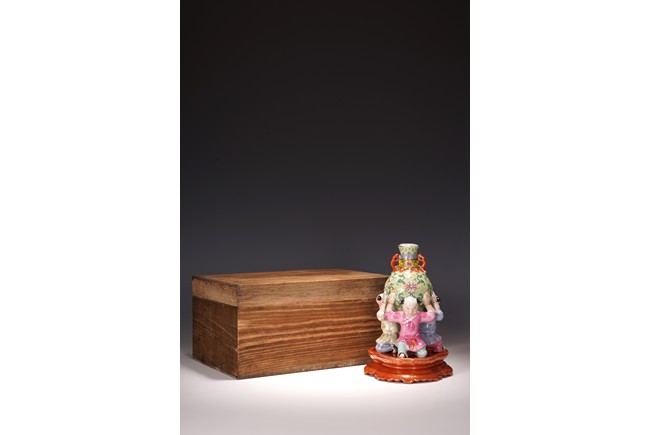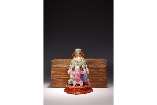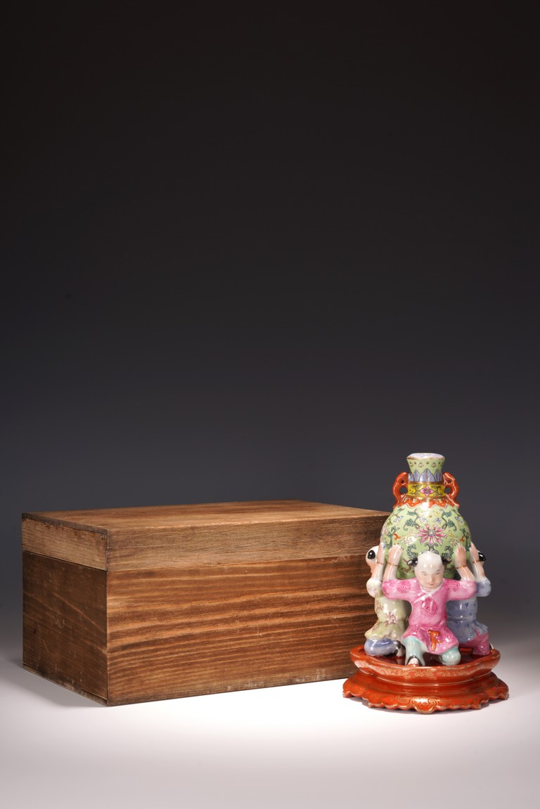 此類瓷瓶,燒製工藝繁複,不論題材,均極為罕稀。清宮檔案雖指高宗曾下旨燒造相類瓷瓶逾五十,但傳世塑貼嬰戲彩瓷更是寥寥可數,且多飾童子攀瓶,底有圈足方便燒造,不必如此支燒,製作相較略簡。據清文件記載,乾隆二十年(1755 年)四月二十六日曾傳旨:「著唐英照從前燒造過三子、五子瓶,並今日所進的瓶等樣款,燒造五十件,要趕七月初一日送到,賞人用。欽此。」此器塑貼三童半蹲、手上托,臉雖朝外,同心共協,獻送寶瓶, 姿態不禁讓人遙想戰國人形器足或唐朝佛教力士。整體比例佈局,雅緻大方,盡顯心思。上部松綠地西番蓮小瓶,雙耳摹古,頸肩華飾,精緻入微,不亞洋彩鉅作。中下部塑貼三子,頭束雙髻,眉清目秀,臉頰飽滿,身穿華衣,袍服圖案各異,粉紅的是牡丹、淡綠的是瑞果、淺藍的是小花,以顏色不同的褲子搭配,醒目鮮明。加添仿漆器描金蓮紋座,工藝之精,讓人嘆為觀止,整體人物表現細膩生動,佈局合理,器型大方、穩重,童子呼應和諧、相映成趣、妙不可言。底部描金書“大清乾隆年制”款識。 (配木盒) 來源:南加州聖地亞哥藏家收藏 。類似浮雕三童子瓶,可參考紐約蘇富比2008年3月拍品號117,成交價361,000 USD Provenance: Property from a San Diego collection, California. For a related vase with three boys applied to the exterior, please refer to Lot 117, sold in Christie's New York on MARCH 18 2008, for 361,000 USD