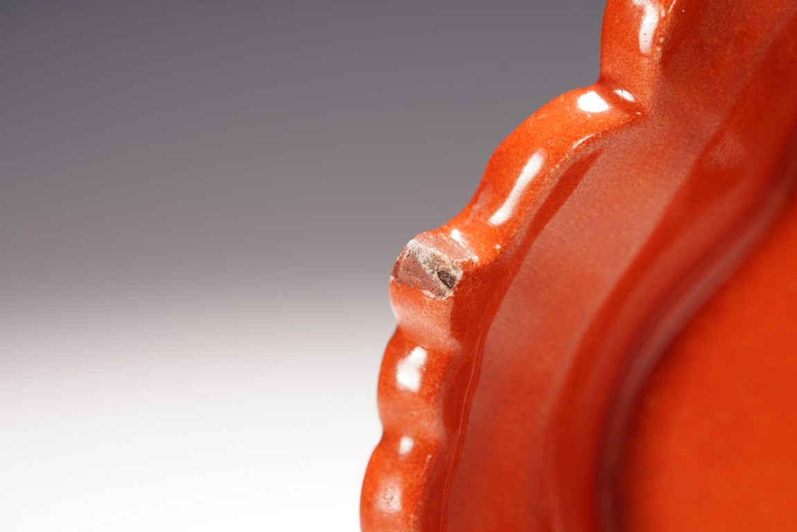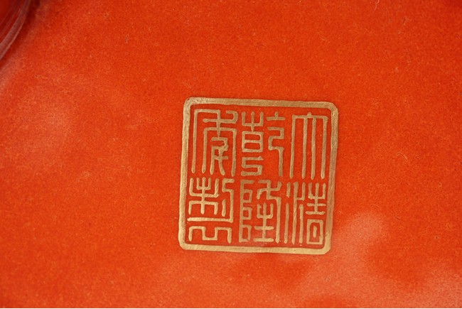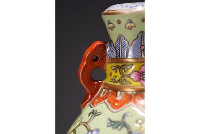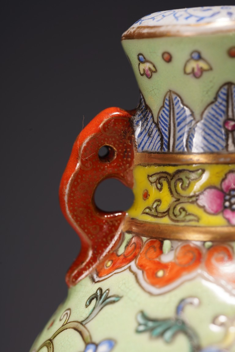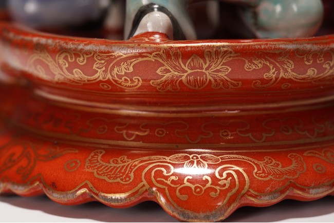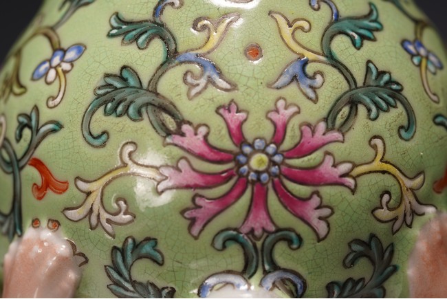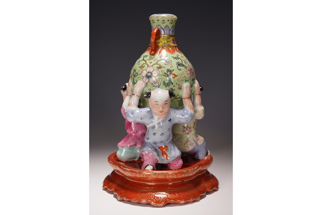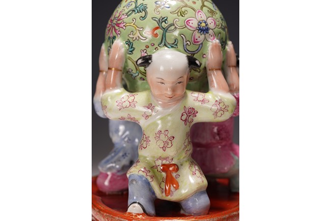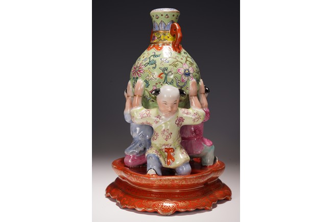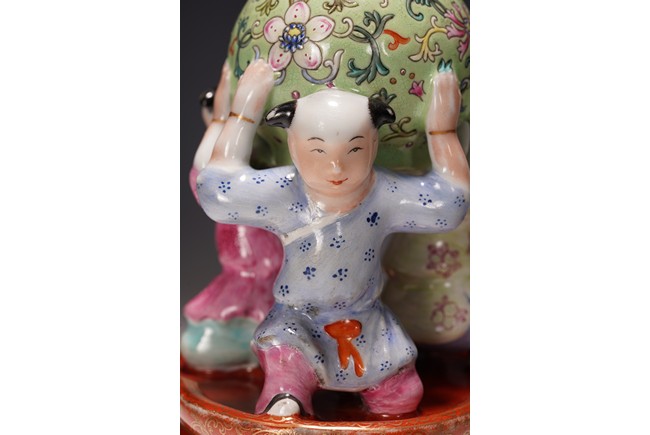 此類瓷瓶,燒製工藝繁複,不論題材,均極為罕稀。清宮檔案雖指高宗曾下旨燒造相類瓷瓶逾五十,但傳世塑貼嬰戲彩瓷更是寥寥可數,且多飾童子攀瓶,底有圈足方便燒造,不必如此支燒,製作相較略簡。據清文件記載,乾隆二十年(1755 年)四月二十六日曾傳旨:「著唐英照從前燒造過三子、五子瓶,並今日所進的瓶等樣款,燒造五十件,要趕七月初一日送到,賞人用。欽此。」此器塑貼三童半蹲、手上托,臉雖朝外,同心共協,獻送寶瓶, 姿態不禁讓人遙想戰國人形器足或唐朝佛教力士。整體比例佈局,雅緻大方,盡顯心思。上部松綠地西番蓮小瓶,雙耳摹古,頸肩華飾,精緻入微,不亞洋彩鉅作。中下部塑貼三子,頭束雙髻,眉清目秀,臉頰飽滿,身穿華衣,袍服圖案各異,粉紅的是牡丹、淡綠的是瑞果、淺藍的是小花,以顏色不同的褲子搭配,醒目鮮明。加添仿漆器描金蓮紋座,工藝之精,讓人嘆為觀止,整體人物表現細膩生動,佈局合理,器型大方、穩重,童子呼應和諧、相映成趣、妙不可言。底部描金書“大清乾隆年制”款識。 (配木盒) 來源:南加州聖地亞哥藏家收藏 。類似浮雕三童子瓶,可參考紐約蘇富比2008年3月拍品號117,成交價361,000 USD Provenance: Property from a San Diego collection, California. For a related vase with three boys applied to the exterior, please refer to Lot 117, sold in Christie's New York on MARCH 18 2008, for 361,000 USD