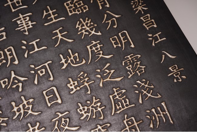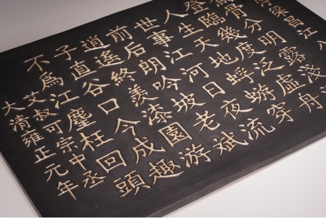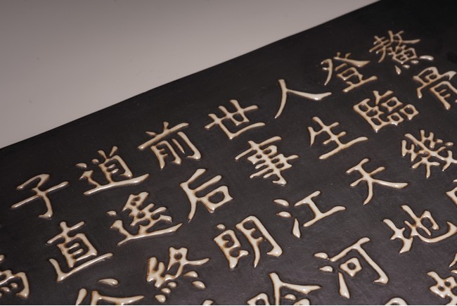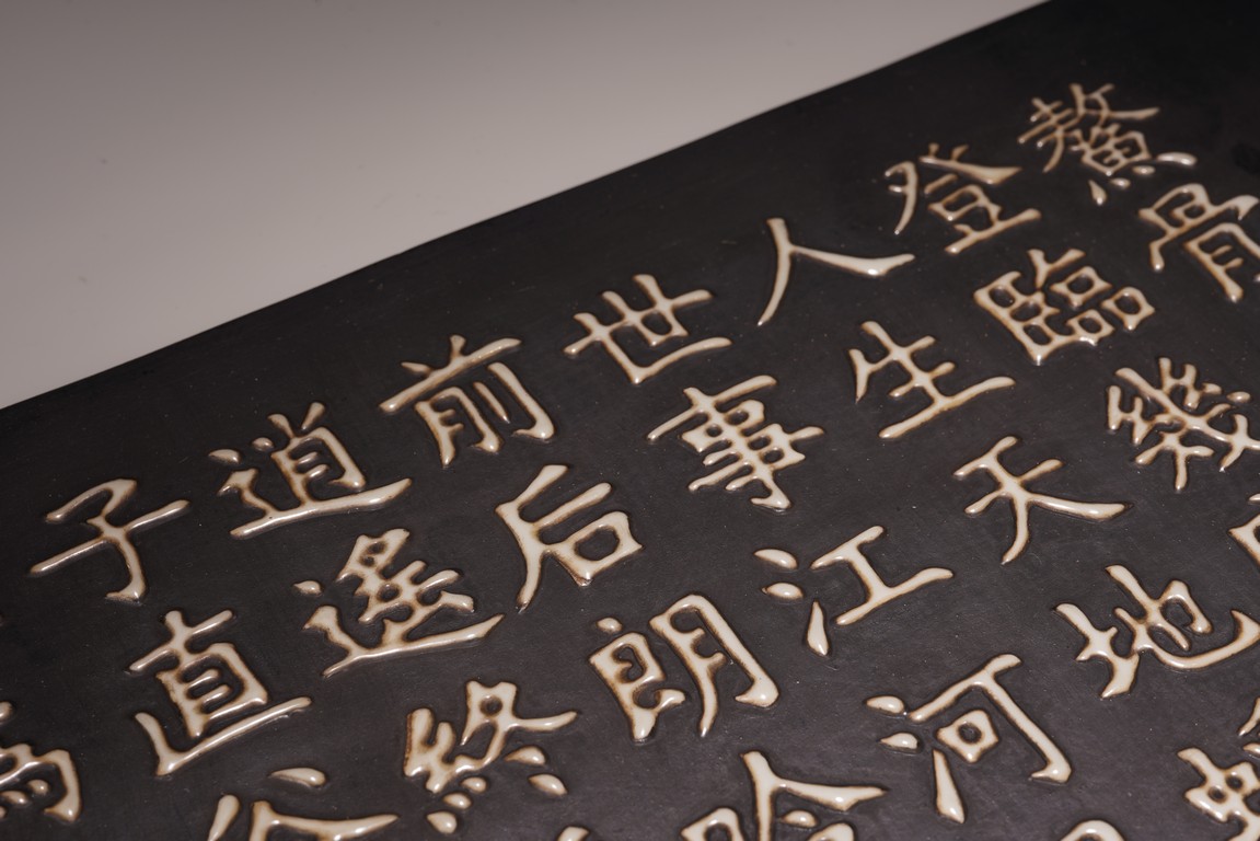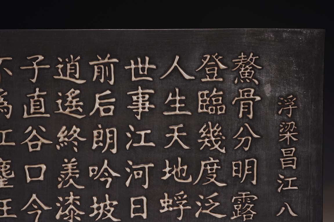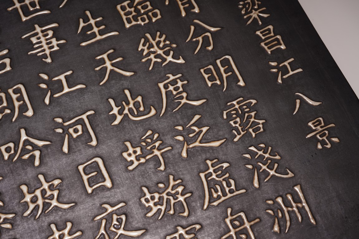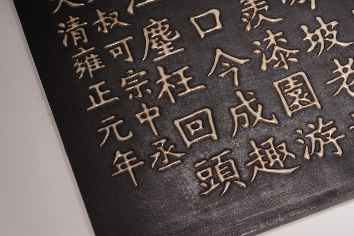 The wall panel is of rectangular form, with a black tone ground, applied in eleven vertical lines with the regular script inscription, each character cast in white glaze ceramic, signature dated to first year of Yongzheng reign.