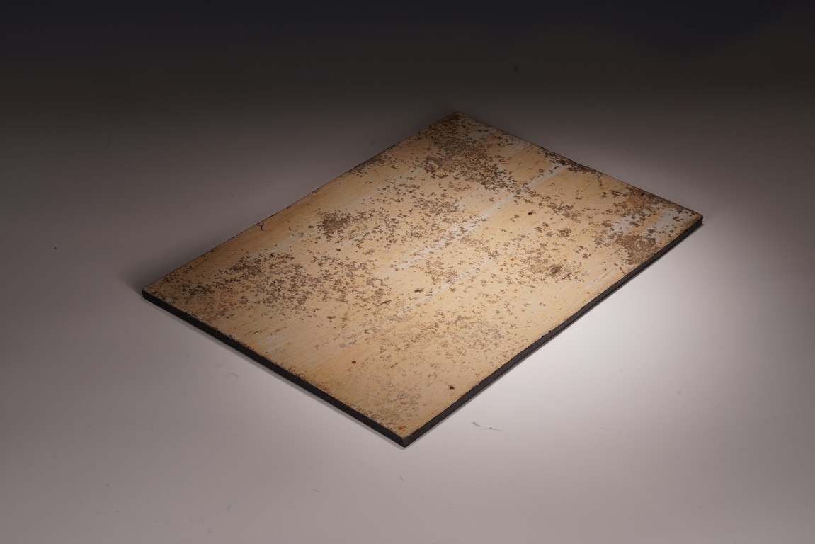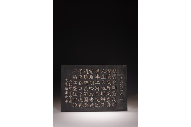 瓷板以黑漆為地,用白釉雕寫詩句,其製作之奇特,常人知之甚少。白釉溫潤如玉,與之形成鮮明對比,更能凸顯主題。由於字形結構不一,寬窄厚薄不均,燒成過程極容易變形窯裂,本品卻十分完好。本器字體規整,行筆遒勁灑脫,文氣十足。 “鰲骨分明露淺洲,登臨幾度泛虛舟。人生天地蜉蝣穿,世事江河日夜流。前後朗吟坡老賦,逍遙終羨漆園遊。子真谷口今成趣,不為紅塵枉回頭。 ”“艾叔可宗中丞”“大清雍正元年”。