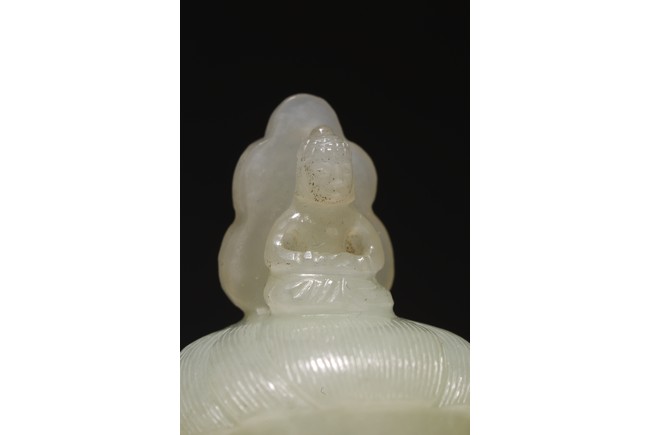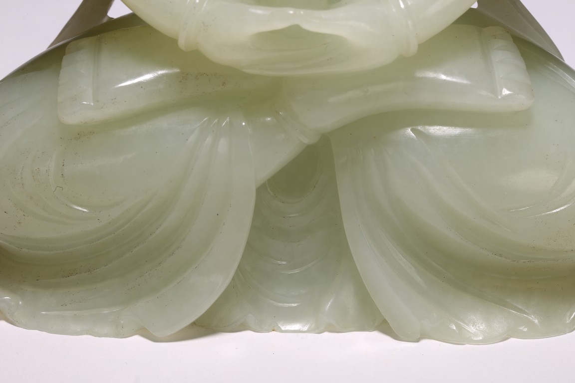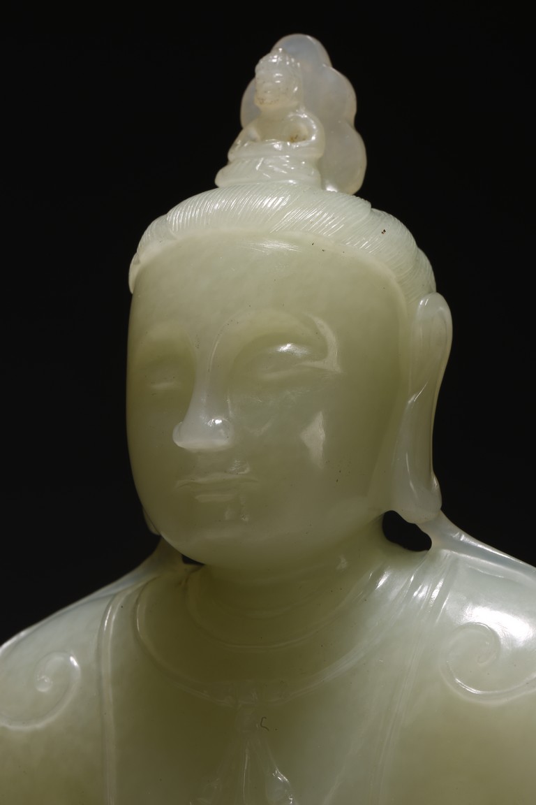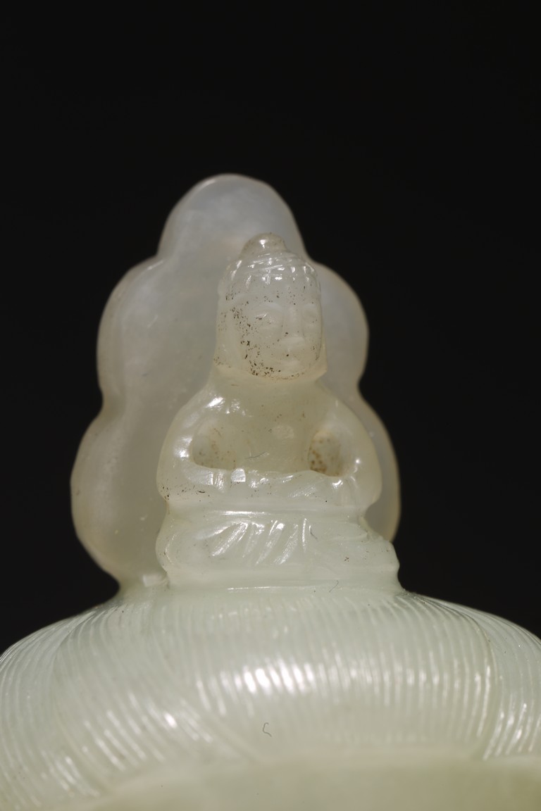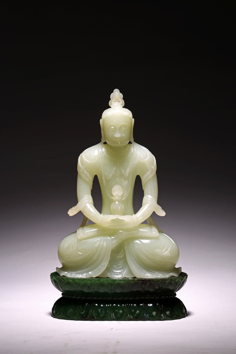 Qing Dynasty period. The white jade smoothed and polished in the form of Amitayus seated in dhyanasana with hands placed together in front of belly holding a vase, the face with serene expression and topped with a small statue of amitabha, all supported on a double lotus spinach green jade stand.