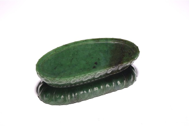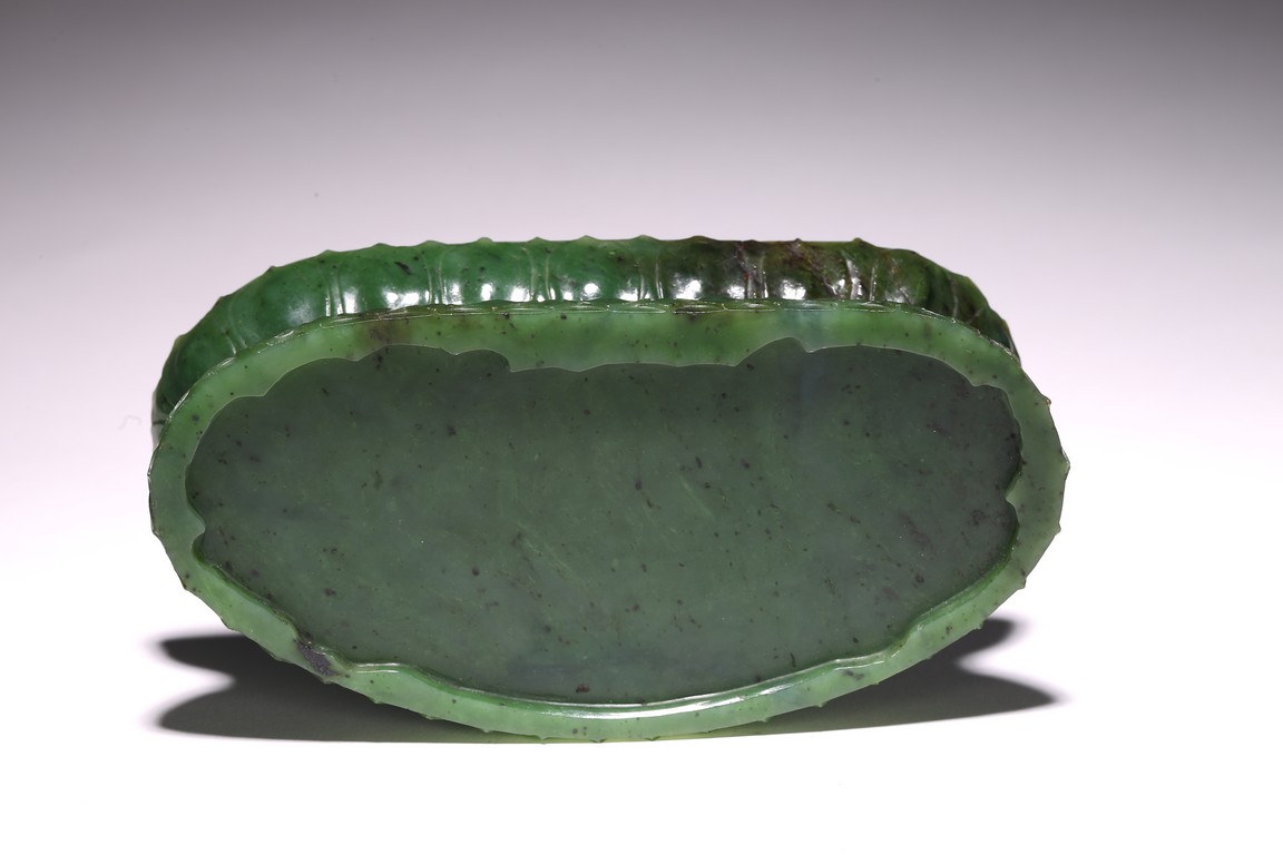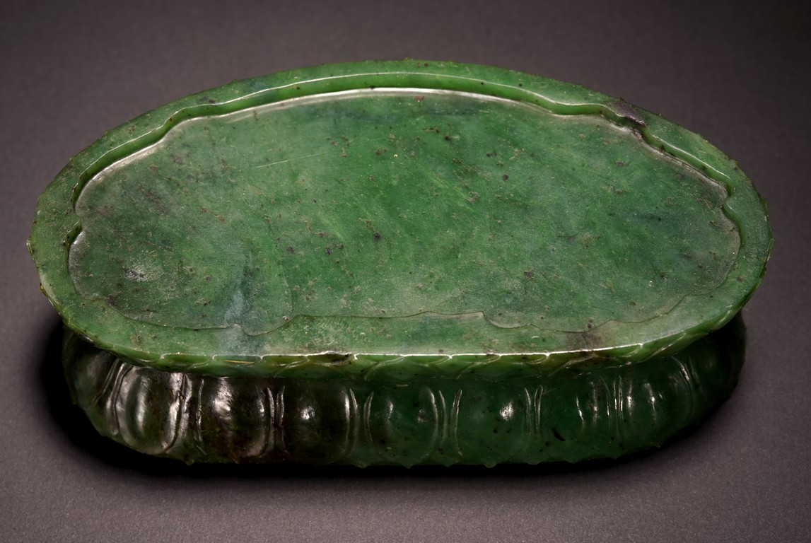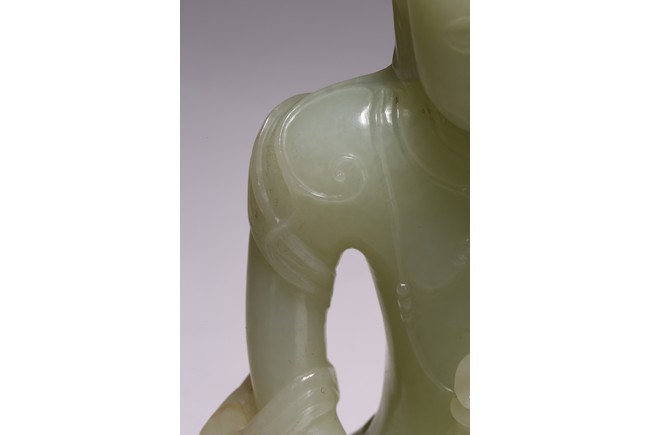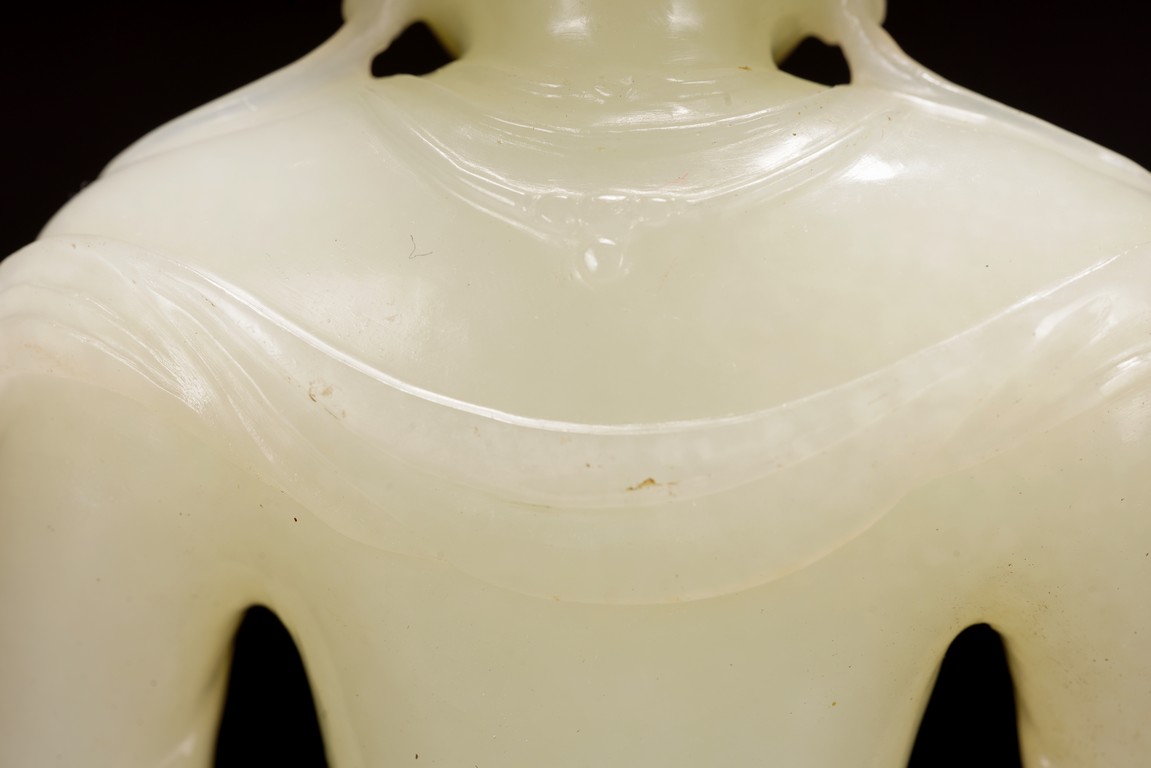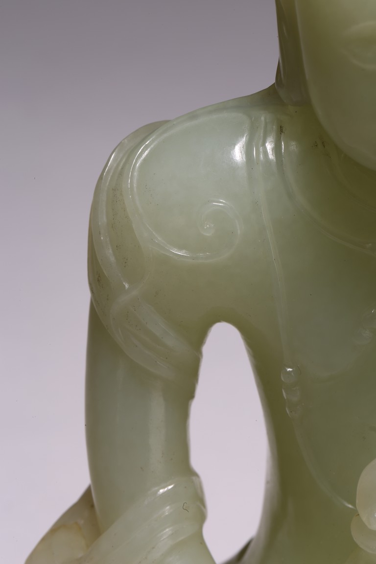 Qing Dynasty period. The white jade smoothed and polished in the form of Amitayus seated in dhyanasana with hands placed together in front of belly holding a vase, the face with serene expression and topped with a small statue of amitabha, all supported on a double lotus spinach green jade stand.