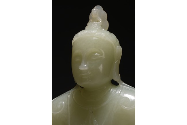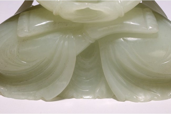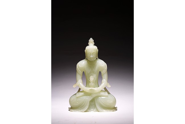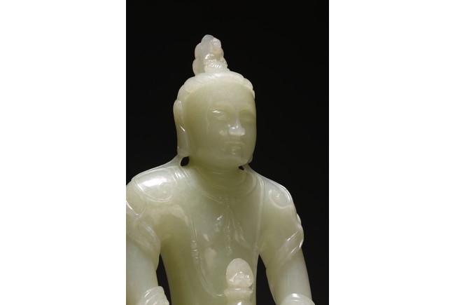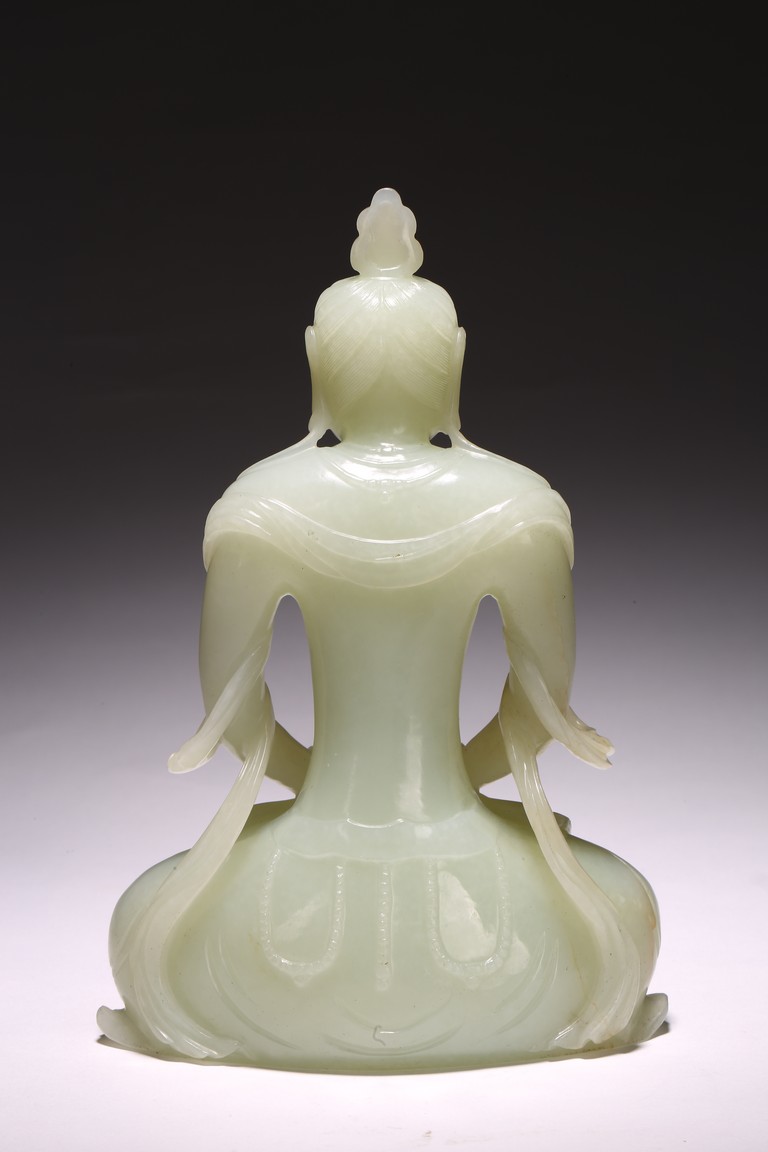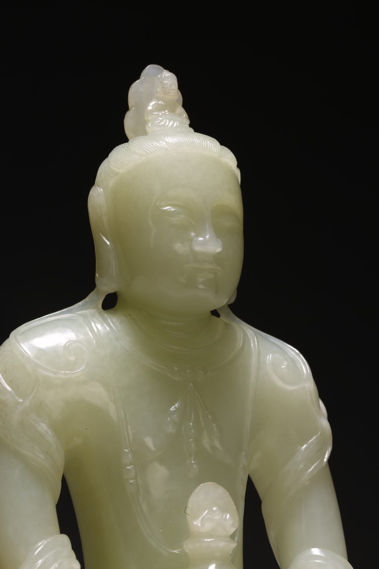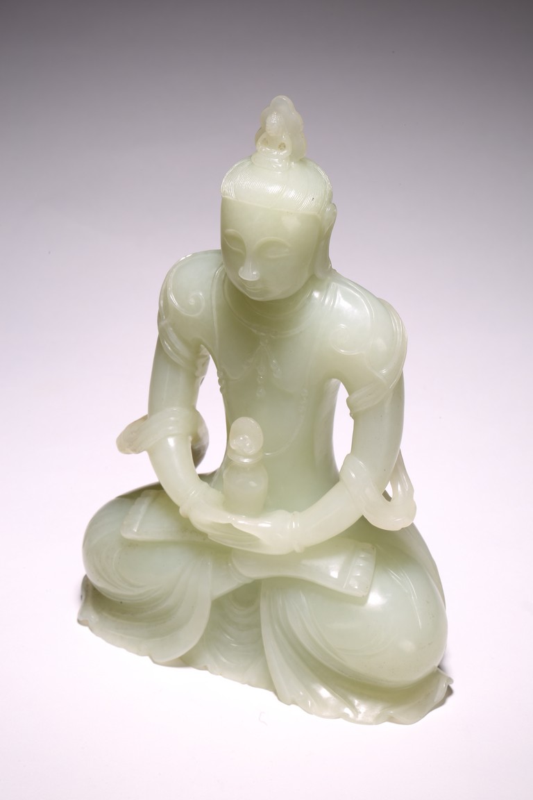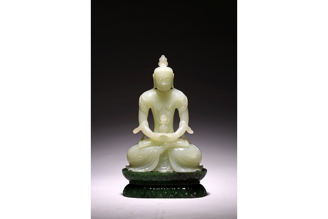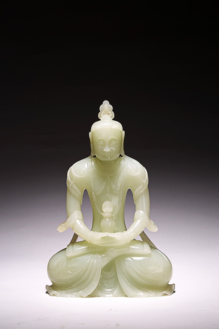 康熙帝曾受長壽佛灌頂,被視為無量壽佛化身之轉輪聖王,宮廷以供奉無量壽佛為主。製造佛像的材質愈珍貴則愈顯虔誠,價值連城的美玉無疑是上佳之選。此件無量壽佛不惜用料,以大塊和田白玉精心琢磨而成,玉色甜糯溫潤,質地溫潤細膩。其法相莊嚴,髮髻高聳,頂部雕有帶背光的小阿彌陀佛,極其註重細節。面相莊嚴,彎眉垂目,雙耳垂肩,耳垂碩大,下頷圓尖,顯露飽滿中猶帶修長的臉型,身著及胸長裙,袒露胸膛,胸前長裙並結有穗飾,雙臂自然下垂,雙手持寶瓶結禪定印,下半身雙腳交足,全跏趺坐,惟因長裙及地, 只露出交迭的跣足。下承和田碧玉雕仰覆蓮座,蓮瓣寬厚飽滿。整器拋光精細,運刀嫻熟,為玉器中之秀品。 來源:紐約重要私人藏家收藏。可參考一件較小白玉佛像(高11.1cm)及銅鎏金底座,藏於哈佛大學博物館, 館藏號1942.185.373.A-B Provenance: Property from an important collection, New York. Compare a smaller white jade buddha with gilt bronze stand in the collection of Harvard Museum, accession no. 1942.185.373.A-B