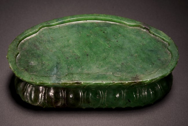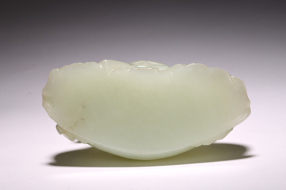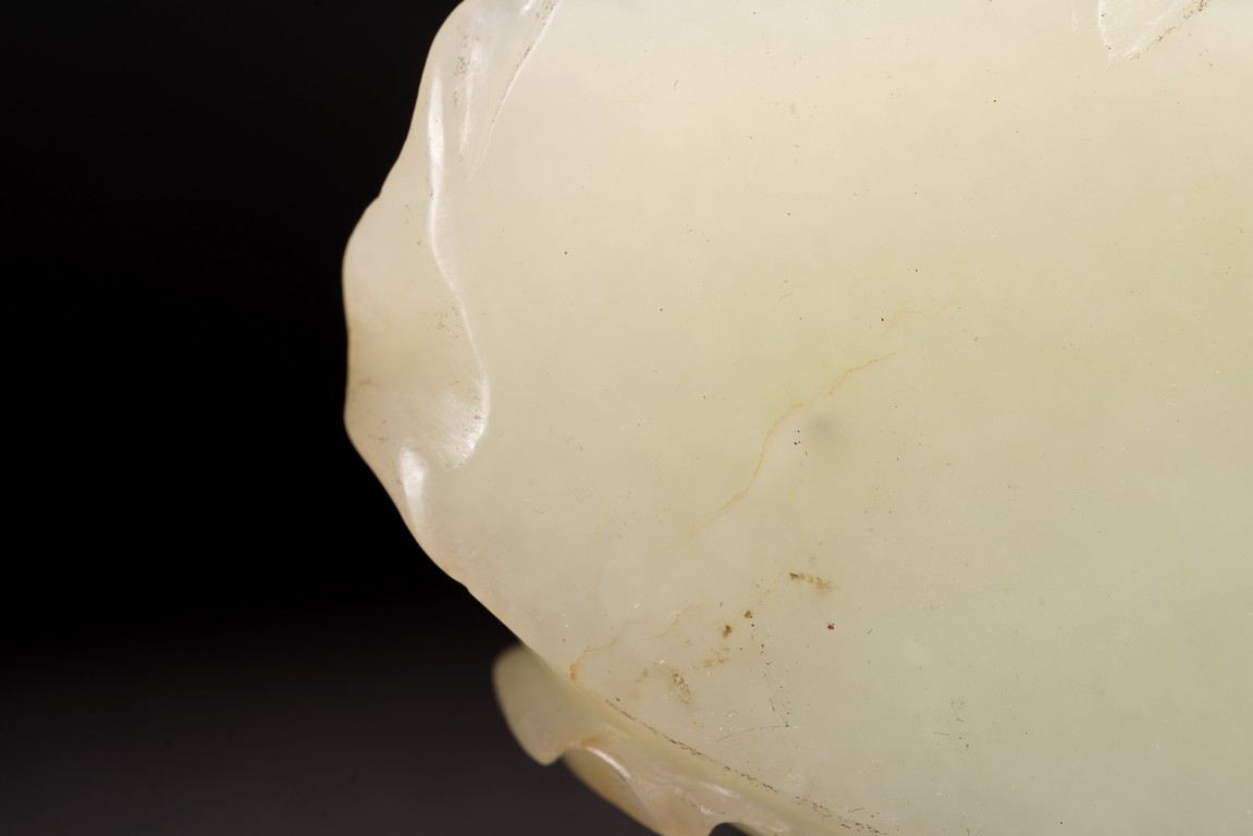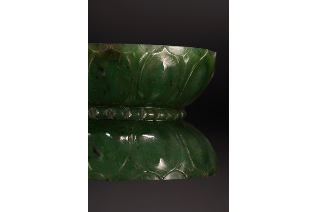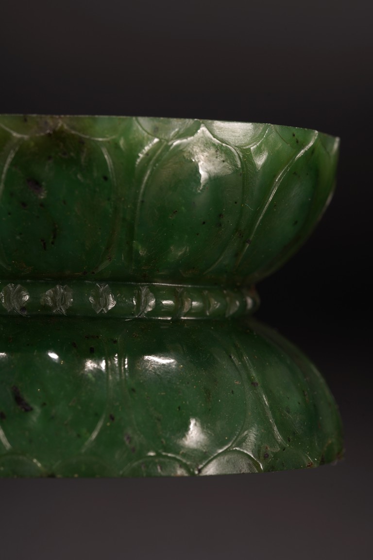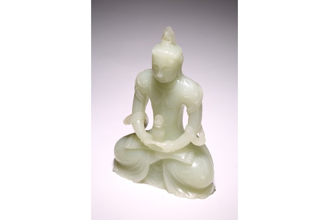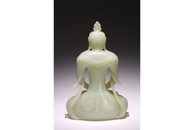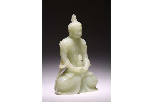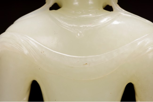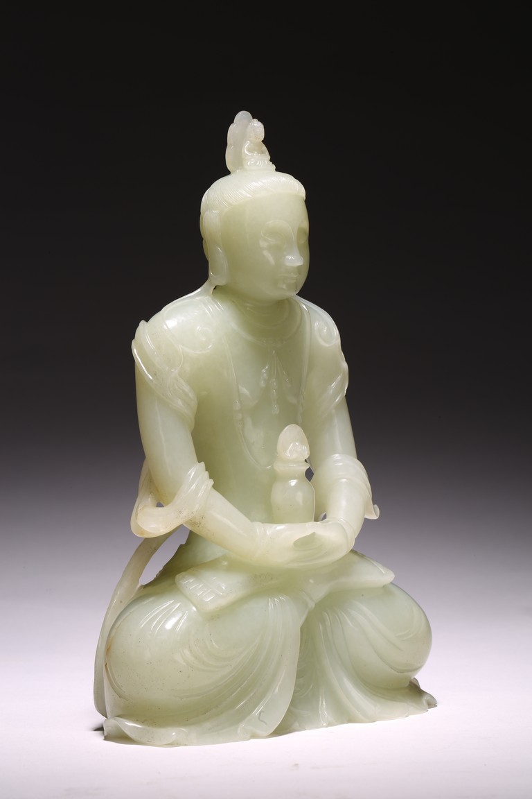 康熙帝曾受長壽佛灌頂,被視為無量壽佛化身之轉輪聖王,宮廷以供奉無量壽佛為主。製造佛像的材質愈珍貴則愈顯虔誠,價值連城的美玉無疑是上佳之選。此件無量壽佛不惜用料,以大塊和田白玉精心琢磨而成,玉色甜糯溫潤,質地溫潤細膩。其法相莊嚴,髮髻高聳,頂部雕有帶背光的小阿彌陀佛,極其註重細節。面相莊嚴,彎眉垂目,雙耳垂肩,耳垂碩大,下頷圓尖,顯露飽滿中猶帶修長的臉型,身著及胸長裙,袒露胸膛,胸前長裙並結有穗飾,雙臂自然下垂,雙手持寶瓶結禪定印,下半身雙腳交足,全跏趺坐,惟因長裙及地, 只露出交迭的跣足。下承和田碧玉雕仰覆蓮座,蓮瓣寬厚飽滿。整器拋光精細,運刀嫻熟,為玉器中之秀品。 來源:紐約重要私人藏家收藏。可參考一件較小白玉佛像(高11.1cm)及銅鎏金底座,藏於哈佛大學博物館, 館藏號1942.185.373.A-B Provenance: Property from an important collection, New York. Compare a smaller white jade buddha with gilt bronze stand in the collection of Harvard Museum, accession no. 1942.185.373.A-B