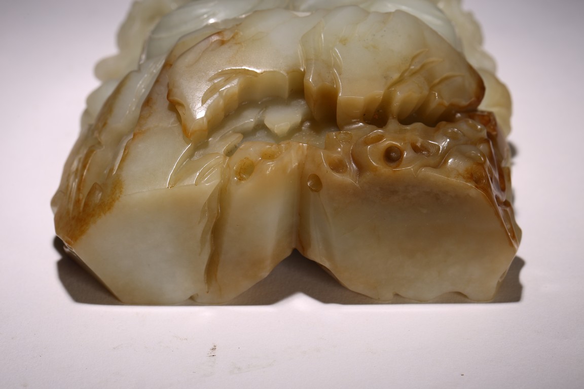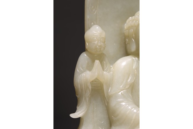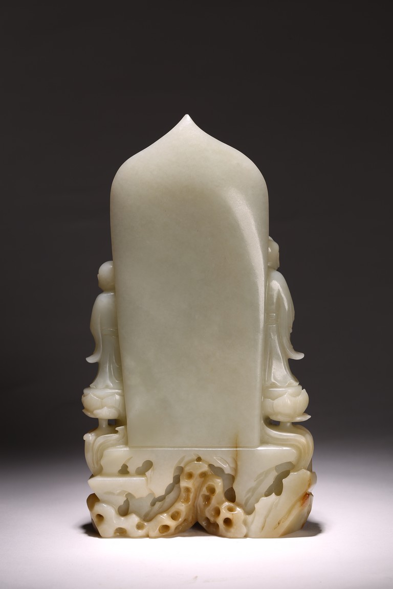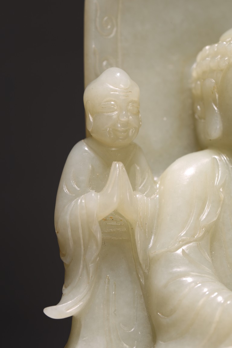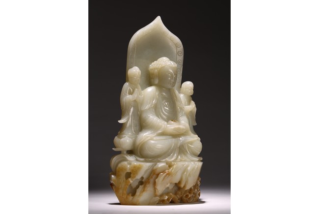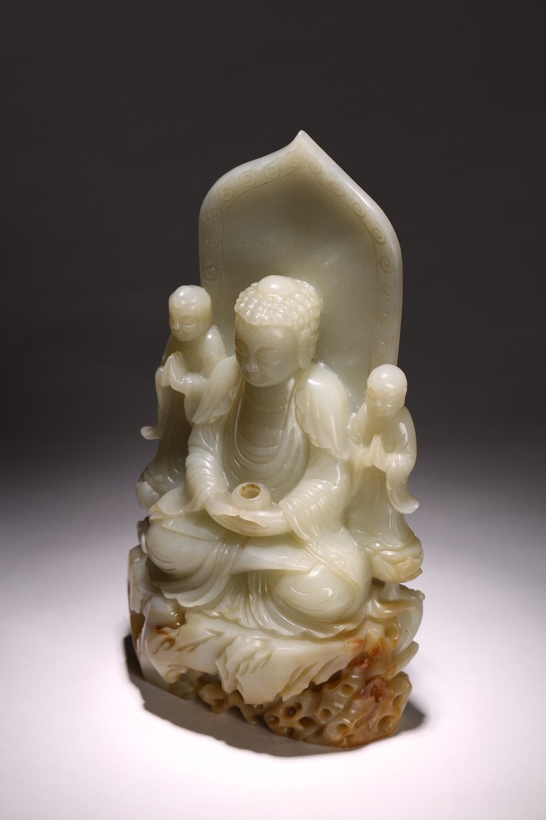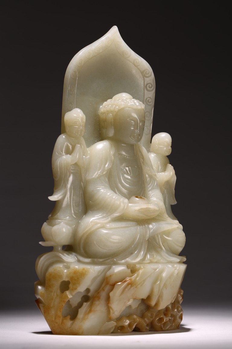 此坐像以精美大料和田玉精琢而成。玉質細膩溫潤,光澤瑩亮,油潤度極佳。造型豐盈飽滿,包漿細膩溫潤。跏趺坐於山石之上,兩手平放於腿上持缽,面相表情安祥,和藹可親。身後兩小彌僧筆直站立於蓮花台上,雙手合十。身後背光高聳,邊緣雕色連紋。整體造型端莊,神態安祥,給人肅穆之感。材質珍稀,包漿自然,尺寸碩大,非常難得。