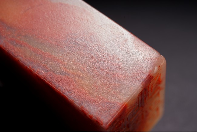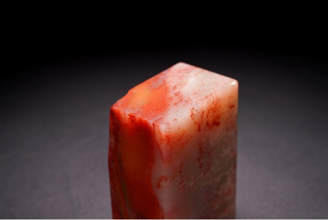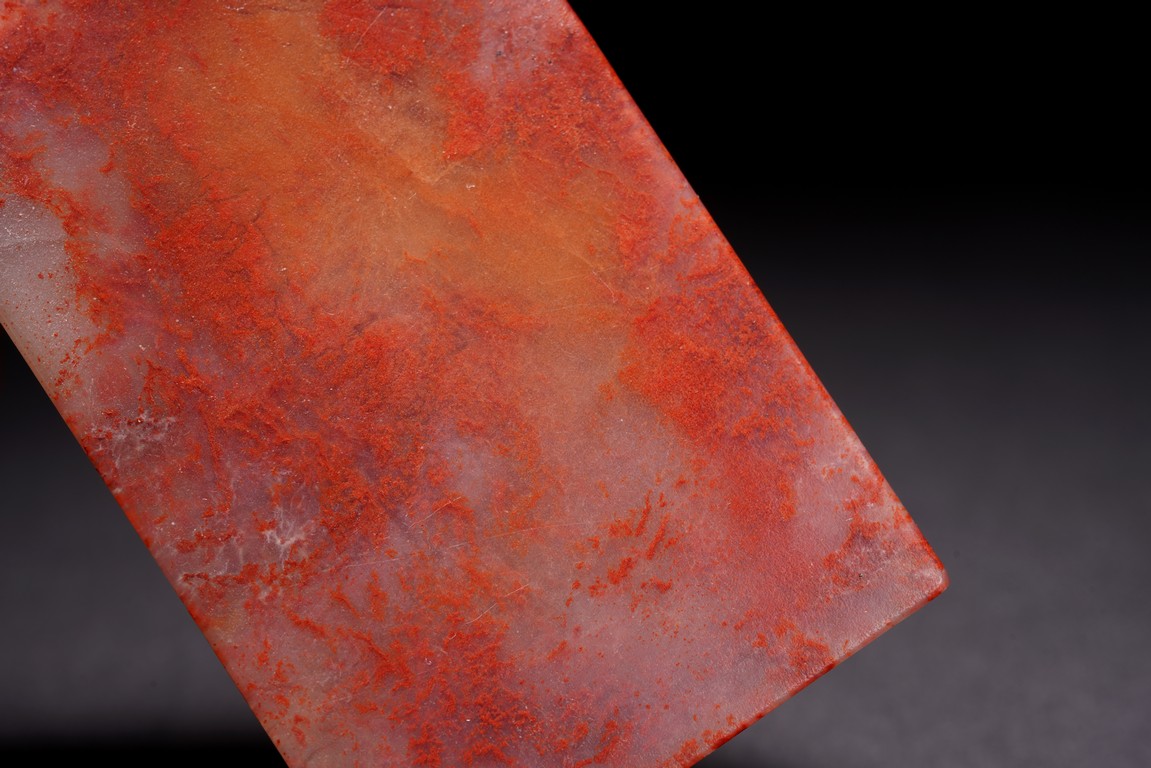 The vermillion-streaked stone likely from Changhua, seal face carved with six characters.