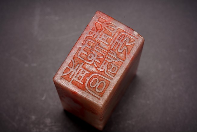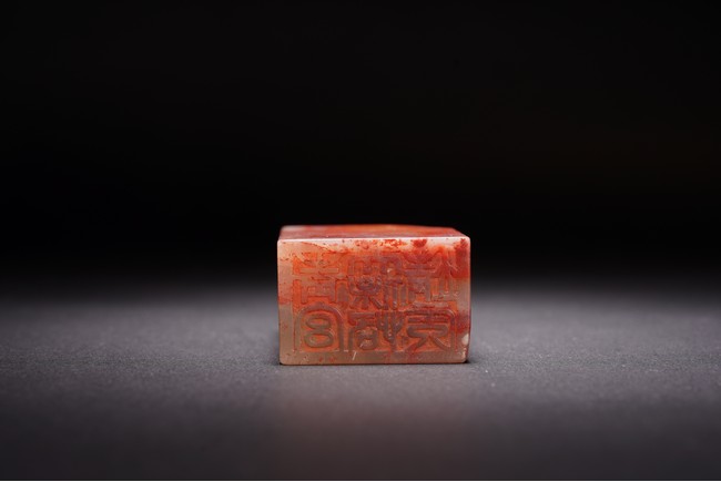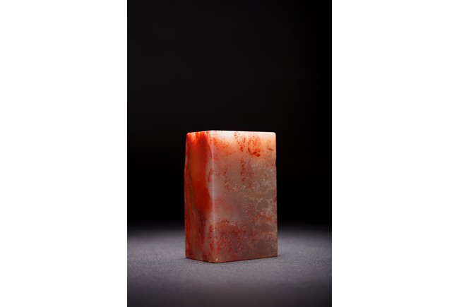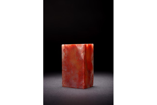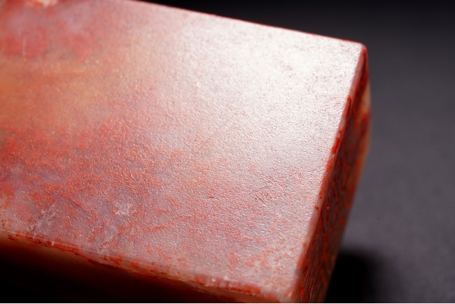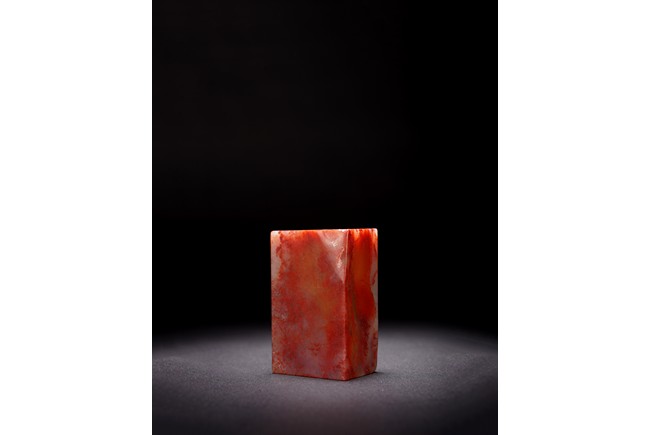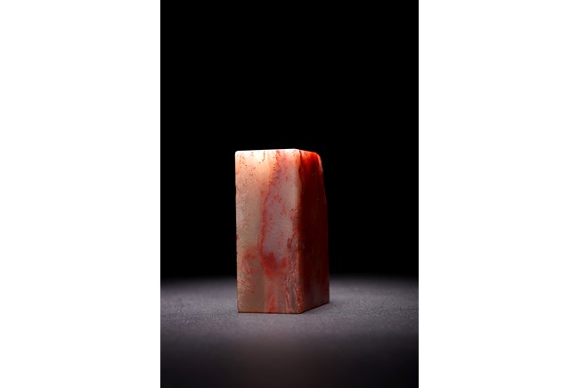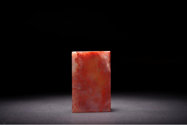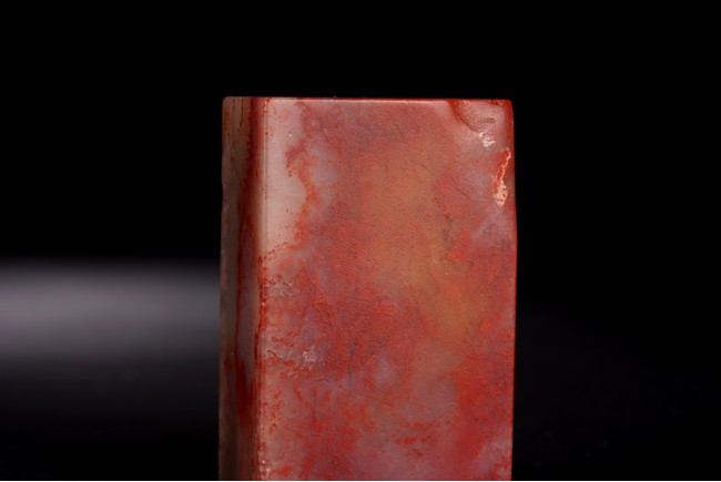 此印章以壽山雞血石為材,呈扁方形,質地細膩,光澤瑩潤,似雞血紅色遍布其身,鮮豔飽滿,為雞血石中的上等品,形制規整周正,下有印文,文房佳器,值得收藏。