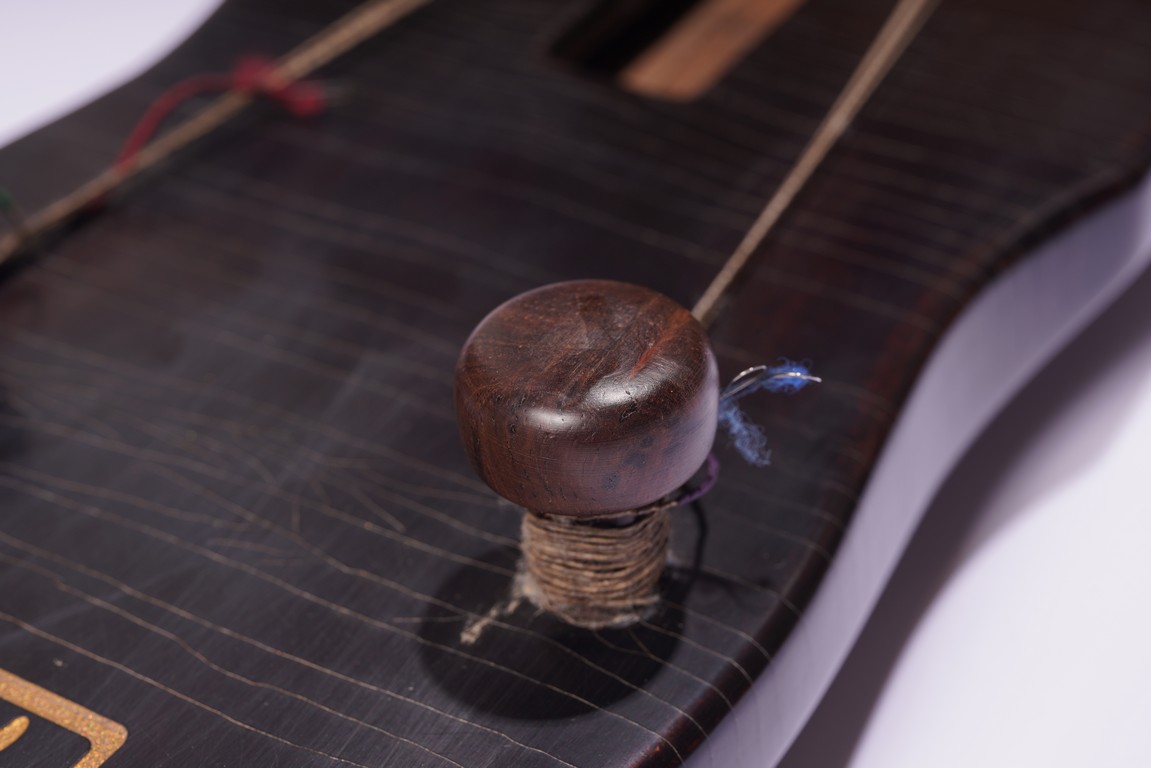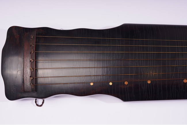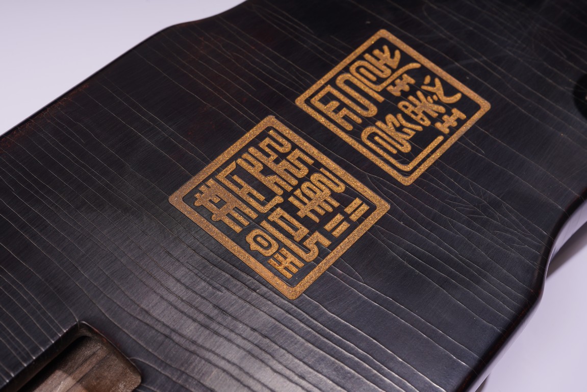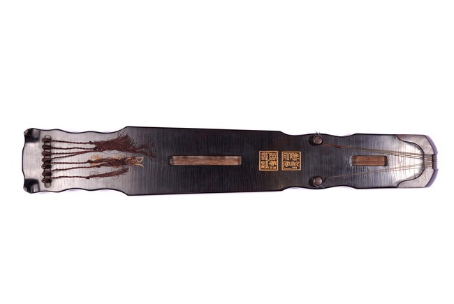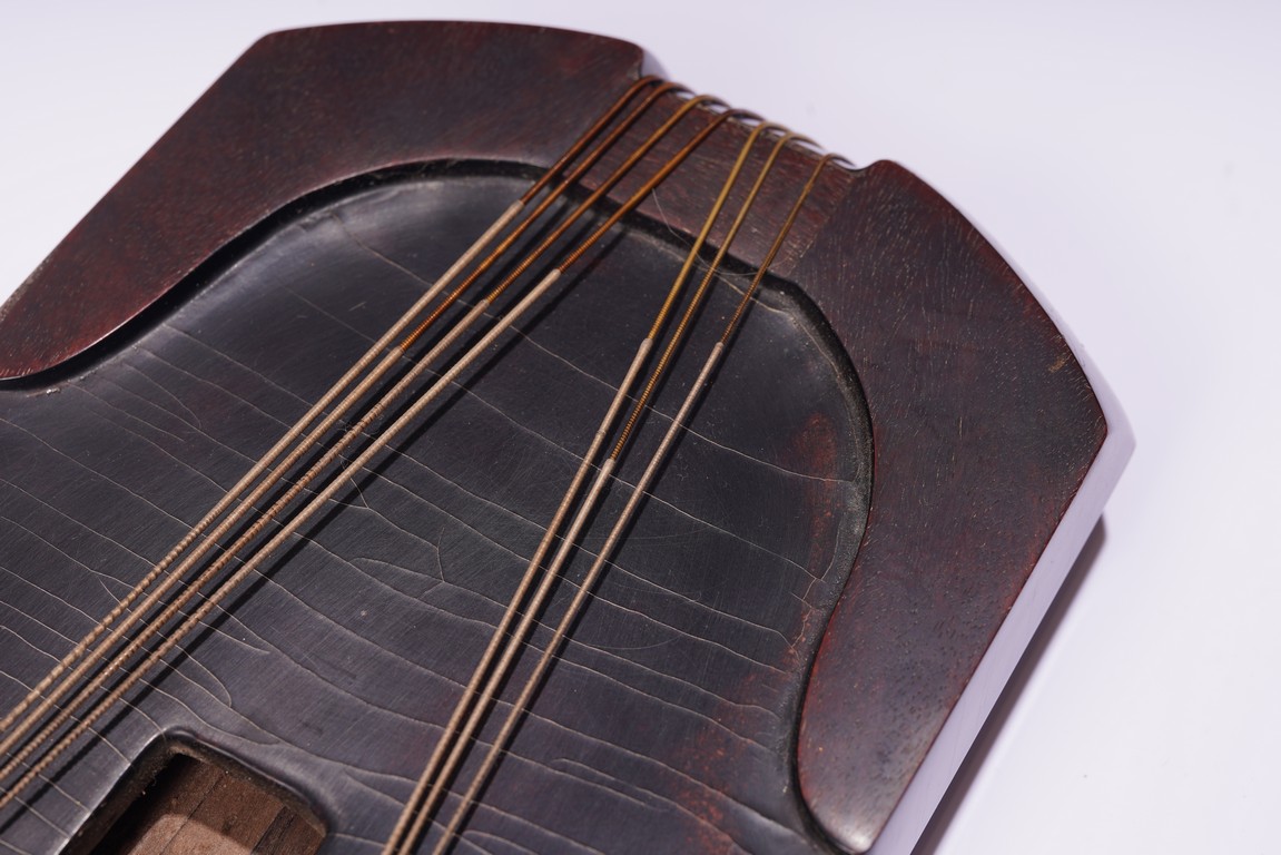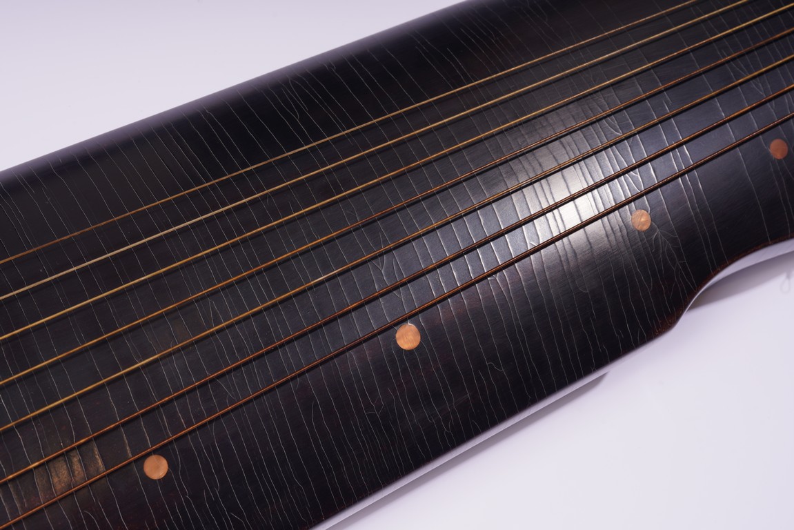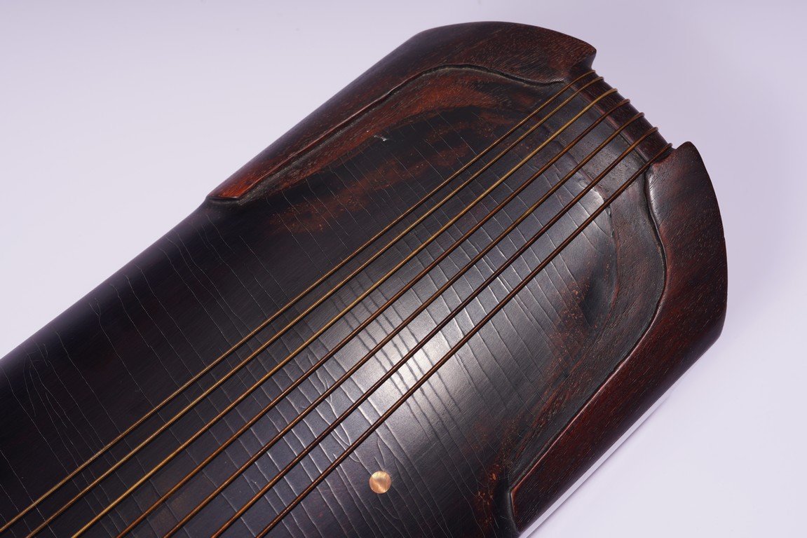 Qing Dynasty period. The flat elongated body with two waisted sections on both sides, lacquered with red paint underneath and black as the top layer, the surface ice-cracked and worn due to age, the top with thirteen inlaid studs, seven strings running over the top and tied to either of the two pegs on the back, the underside bearing a three character inscriptions and two seal marks.