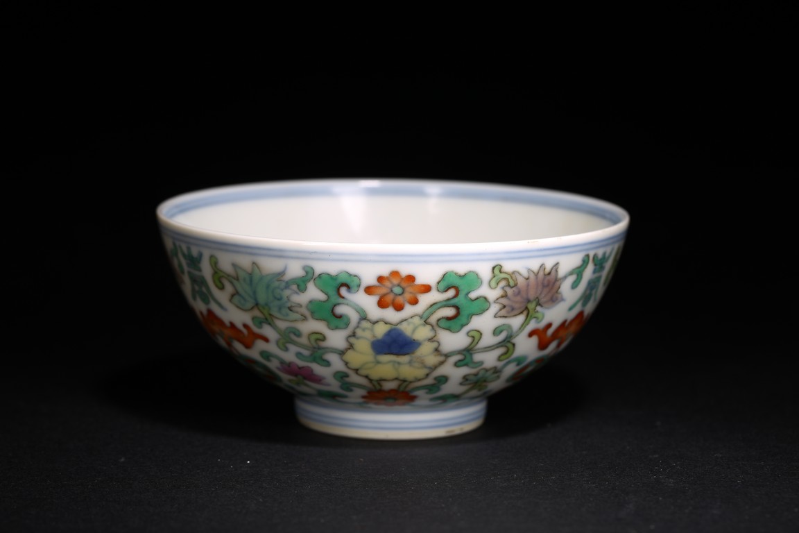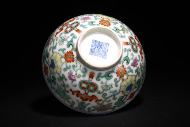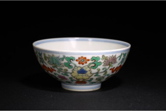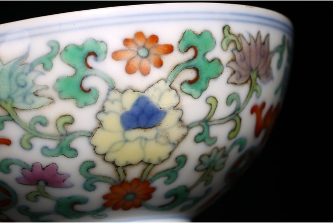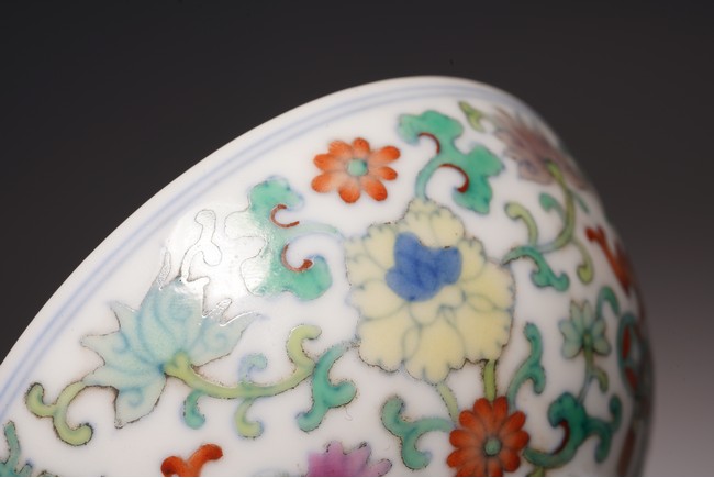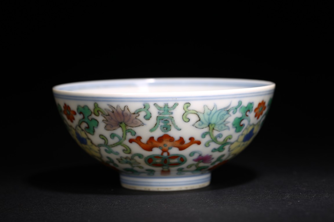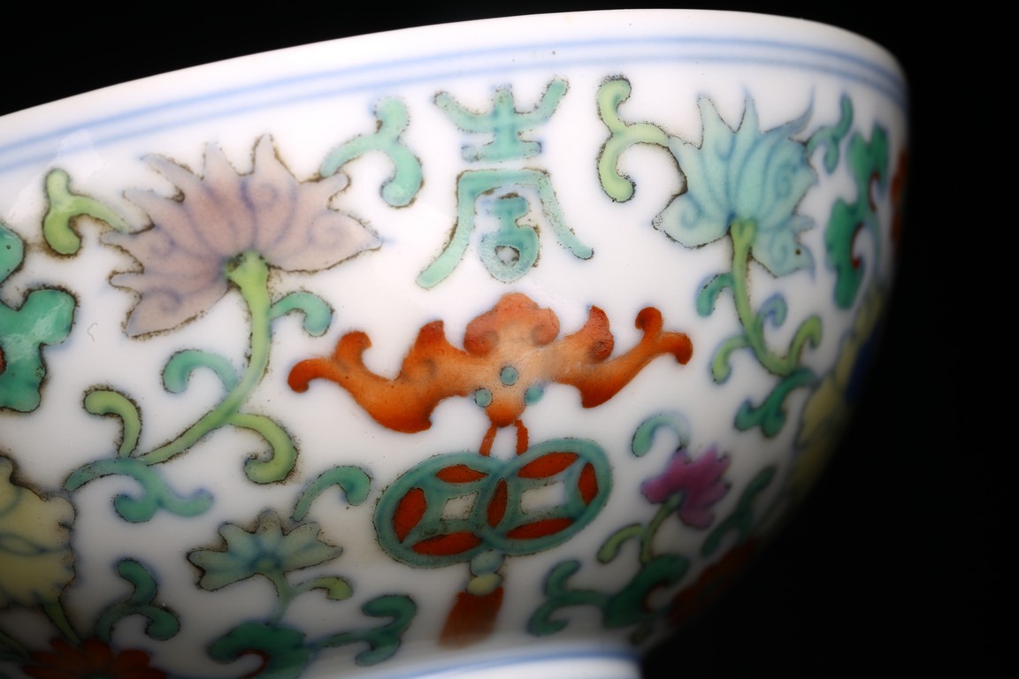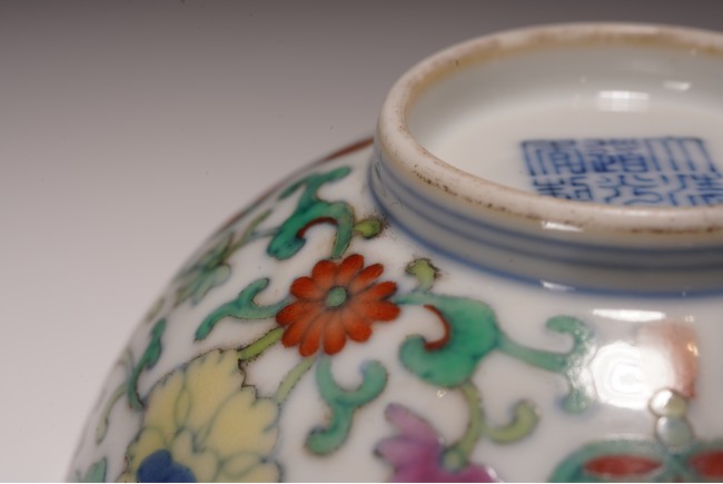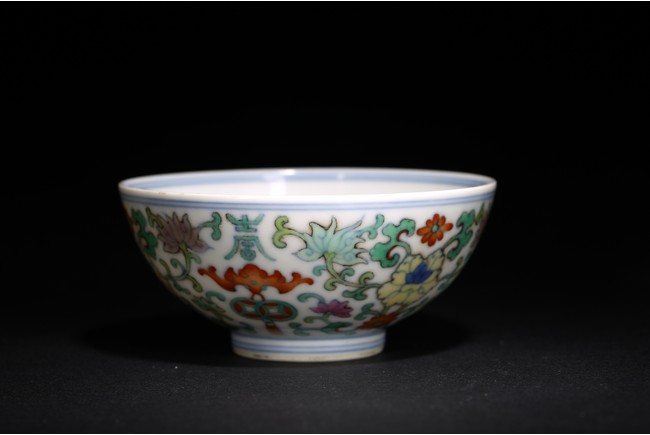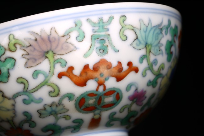 侈口,弧腹圓收,圈足,胎質細潤,白釉瑩亮,釉汁潤澤,宛若凝脂。外壁以青花勾勒邊線,用黃、綠、紅等彩料,繪“纏枝花卉紋”“壽字紋”“福在眼前紋”,碗心繪“如意紋”。所繪線條紋飾流暢細緻,色調絢麗多彩,紋樣優雅,寓意吉祥如意,顯得富麗華貴。 “大清道光年制”款識。