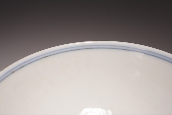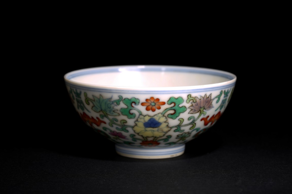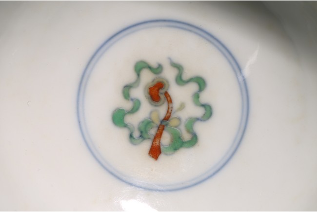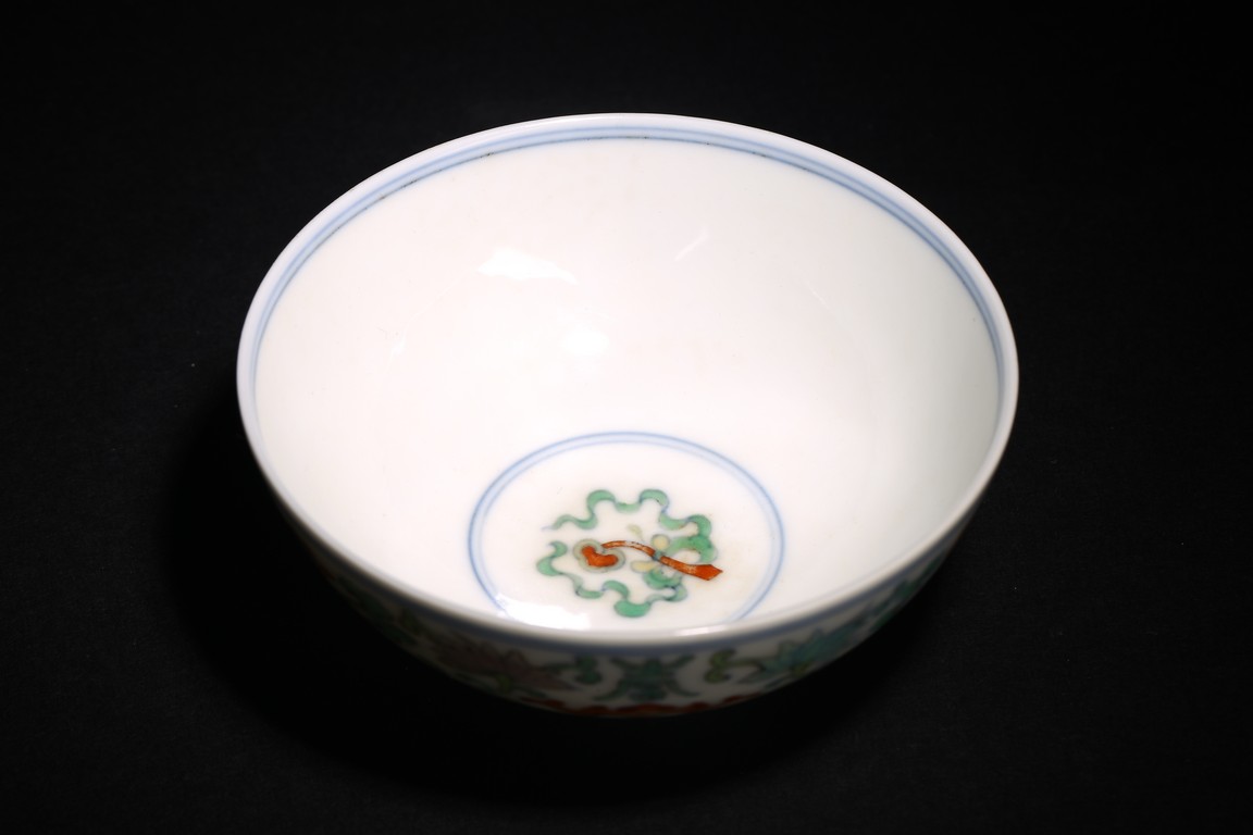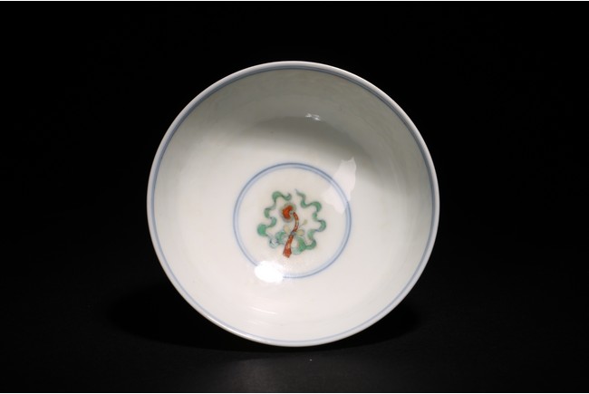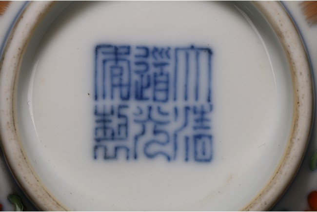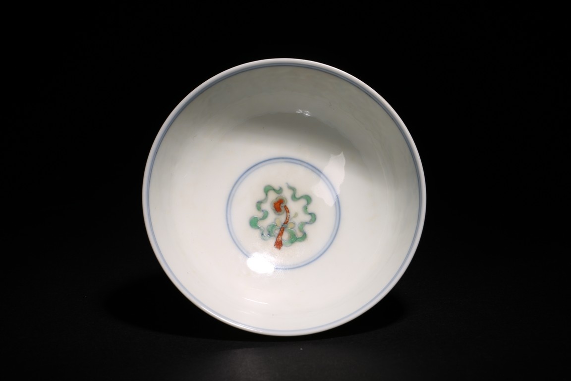 侈口,弧腹圓收,圈足,胎質細潤,白釉瑩亮,釉汁潤澤,宛若凝脂。外壁以青花勾勒邊線,用黃、綠、紅等彩料,繪“纏枝花卉紋”“壽字紋”“福在眼前紋”,碗心繪“如意紋”。所繪線條紋飾流暢細緻,色調絢麗多彩,紋樣優雅,寓意吉祥如意,顯得富麗華貴。 “大清道光年制”款識。
