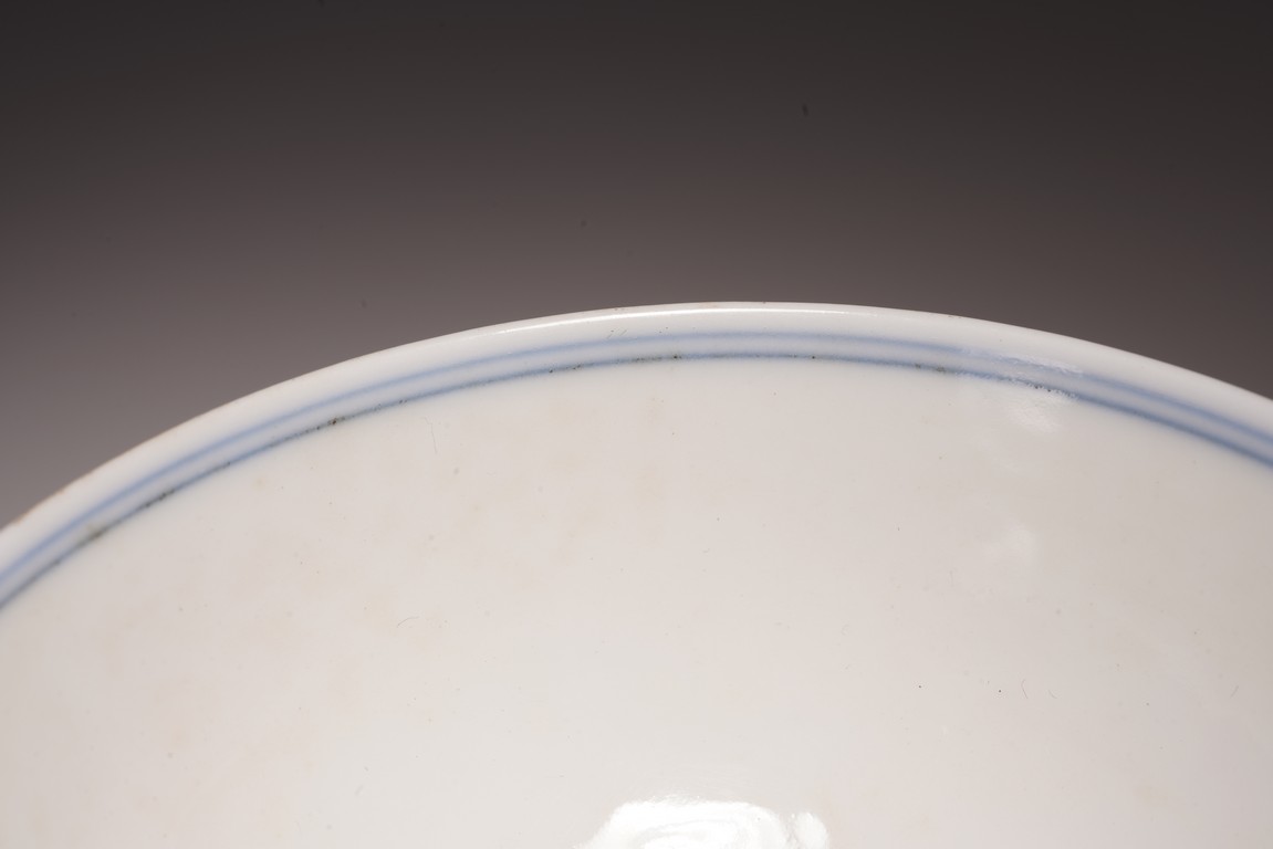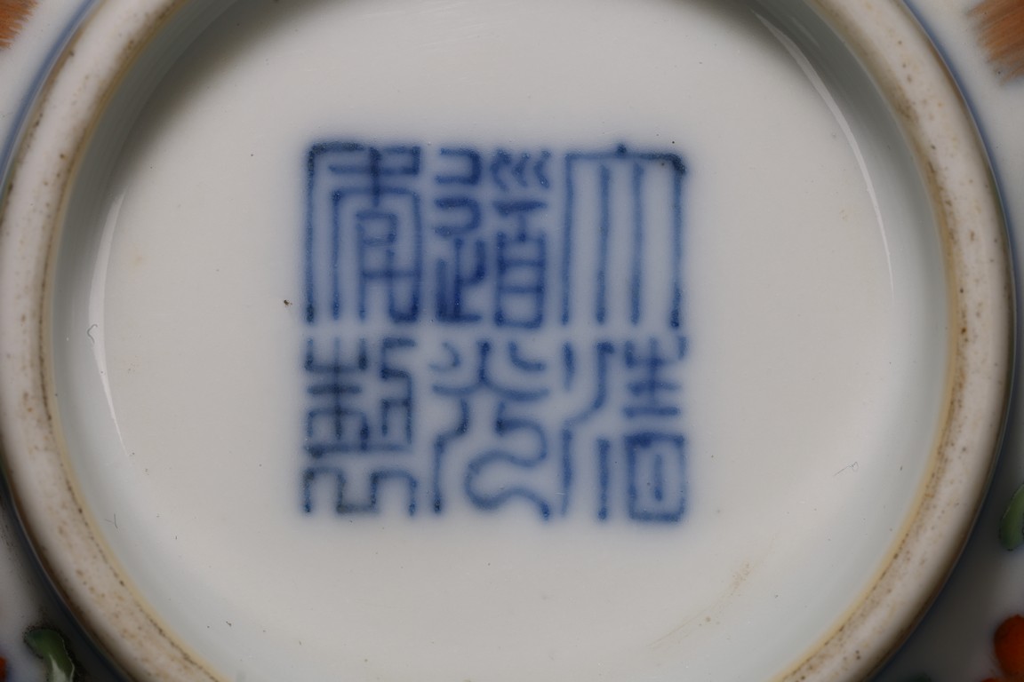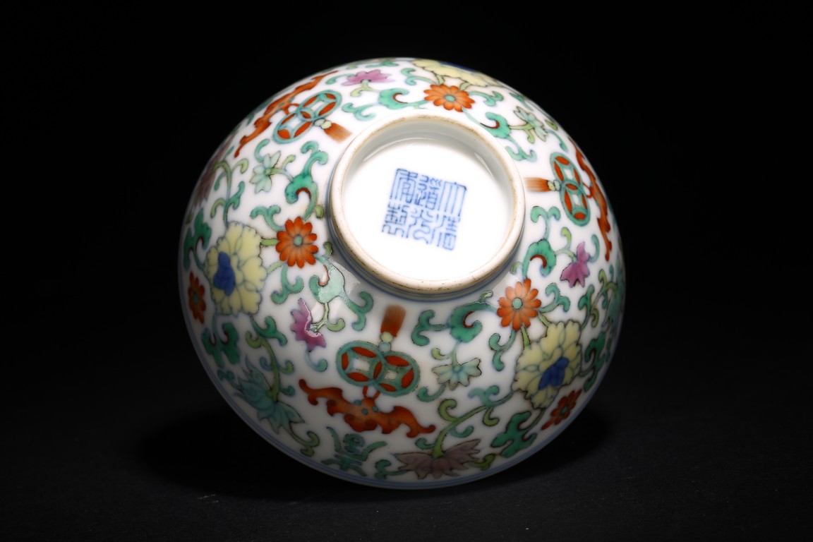 Qing Dynasty period. Of deep rounded sides supported on short foot, the body decorated with scrolled lotus blooms alternated by stylized shou character above auspicious bat suspending coins, interior enamelled with a ruyi motif, base inscribed with Daoguang reign mark.