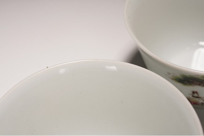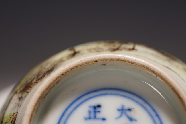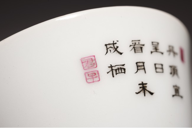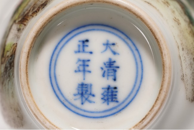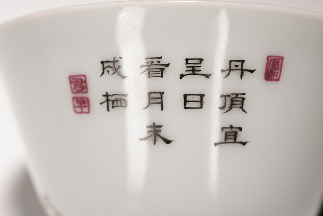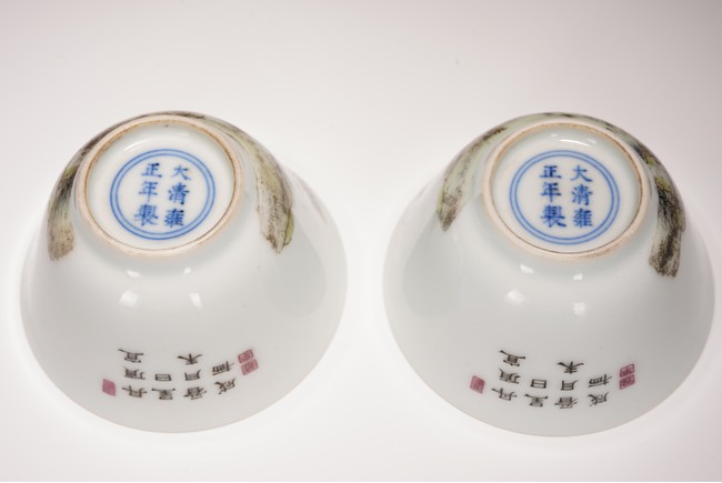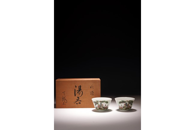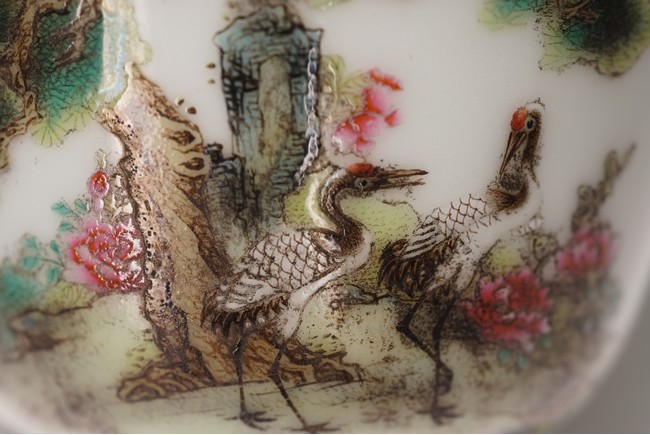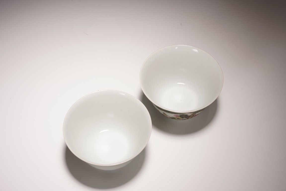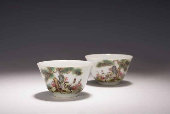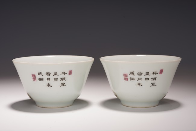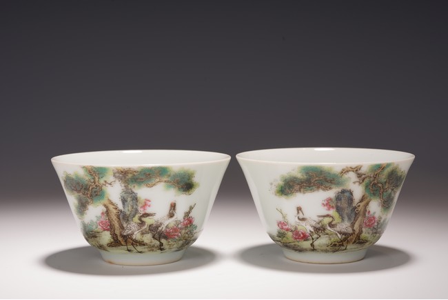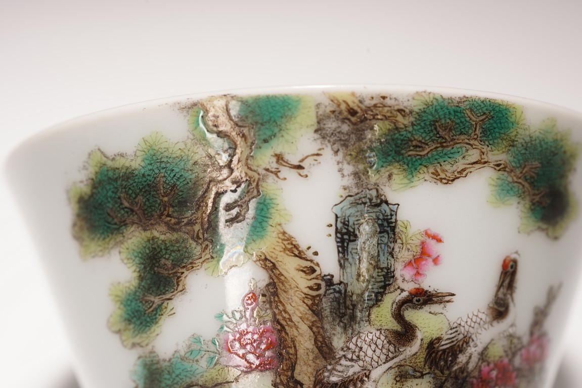 杯敞口,斜壁,深腹,圈足,胎質堅致細膩,白釉清透,外壁以粉彩繪松鶴延年紋,松樹虯枝曲折盤旋,層次有條不紊,佈置得當,樹身鱗節密布,蒼勁高古。松下仙鶴,結伴對立, 斂翅舒頸,俯仰自得。松樹終年長綠,經冬而不凋,以此來比喻生命力旺盛不衰。丹頂鶴壽可至八十年,為鳥中之長壽者。因此松鶴延年具有深遠之喻意,後人常以鬆鶴為祝壽之吉祥圖案。反面題詩“丹頂宜承日,看月未成棲“是出自唐·劉禹錫《鶴嘆》,仙鶴的丹頂宜於上承紅日,因為仰頭望月故至深夜尚未棲息。 “大清雍正年制”款識,成對保存,實屬不易,(配木盒)