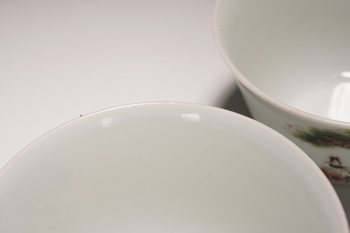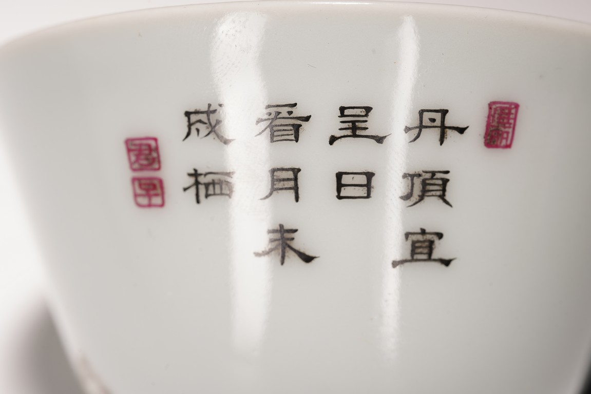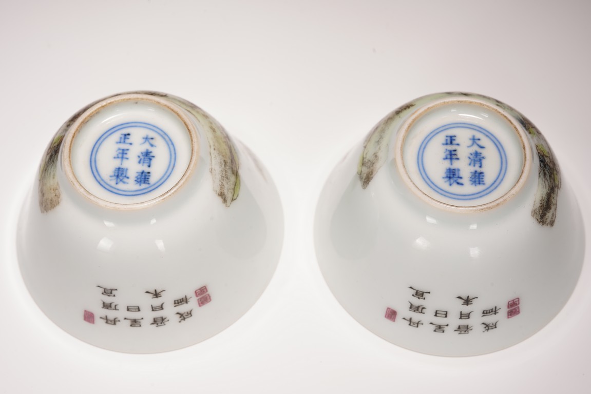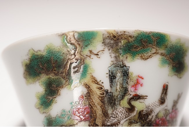 Each cup exterior finely enamelled to depict two standing cranes next to large pine within a mountain setting, the reverse inscribed with poem with seal marks, the base inscribed with reign mark.