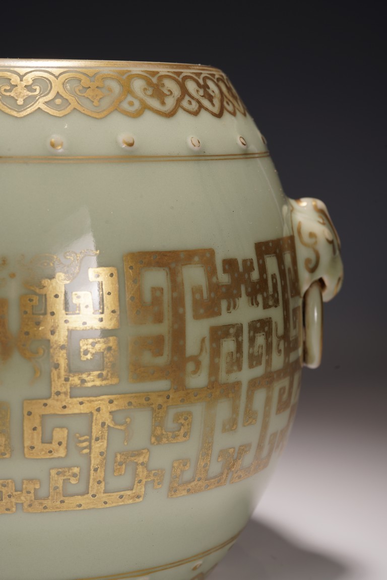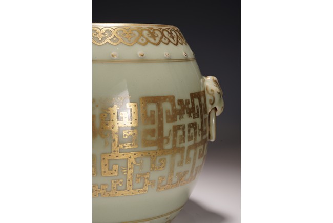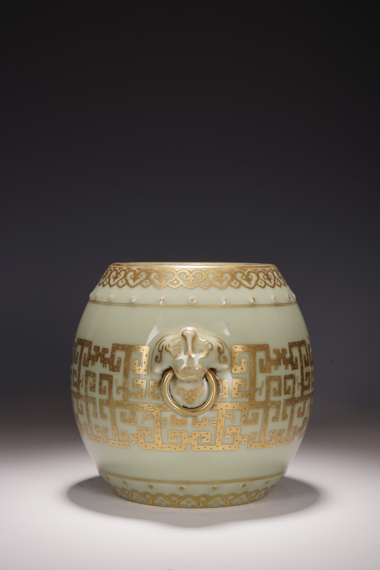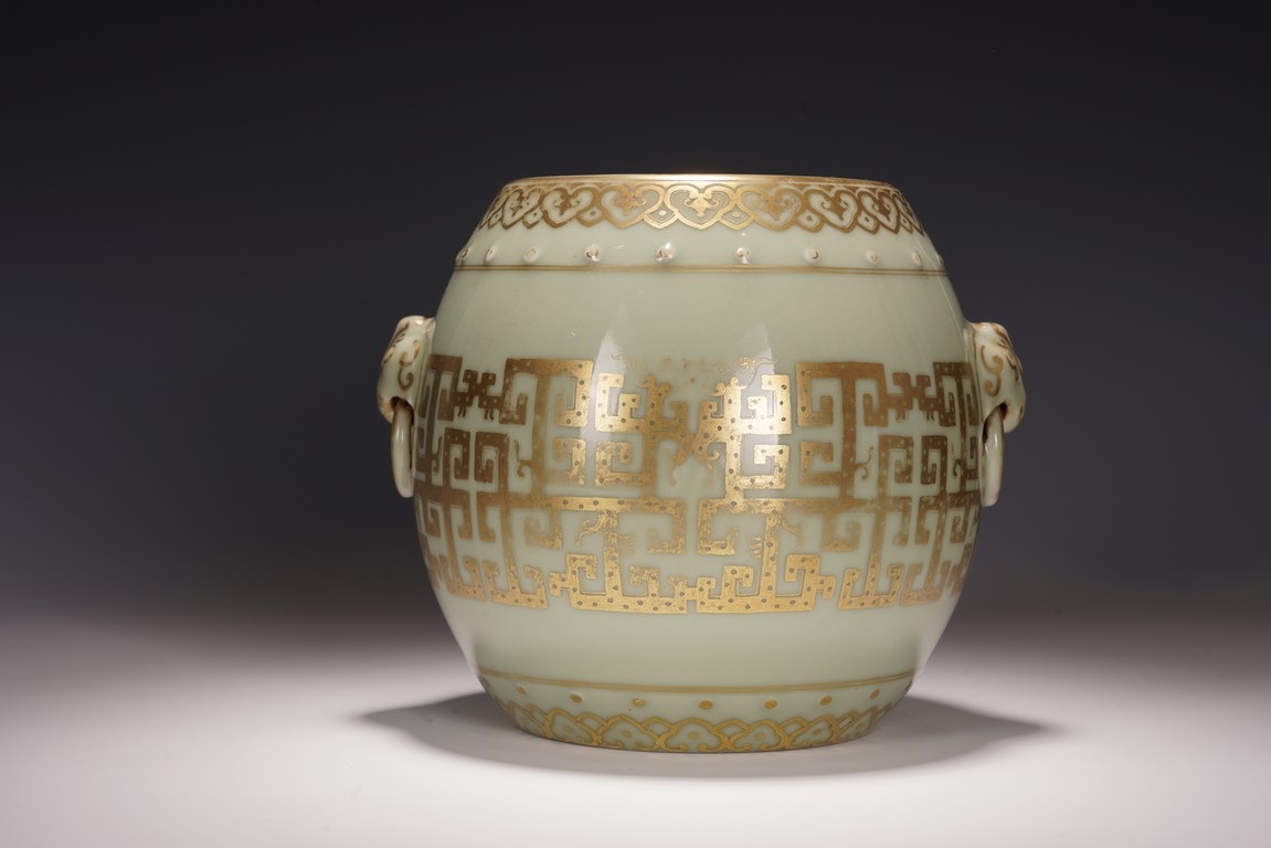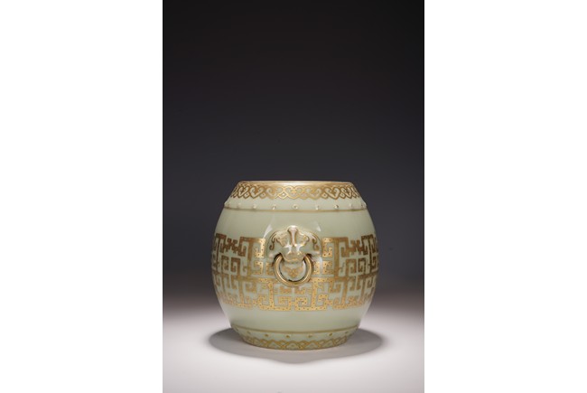 鼓墩又名“繡墩”,“坐墩”。鼓墩造型秀美端莊,無墩面,弧腹中空,上下各有凸起鼓釘一周,雙獅銜環耳,細節處見精巧。通體施粉青釉,釉色沉靜滋潤,青翠盈潤,美不勝收,上繪金彩輝煌奪目,淡雅之底色結合鮮明張揚之金色,使得整器清爽而不乏雍容,淡雅而更顯高貴。口沿上方描金繪“迴紋”一周,器身上下皆描金繪“如意云紋”,器身描金繪相對式“夔龍紋”,構圖清晰,紋飾整齊規矩,雕塑雙獅耳銜環,獅子威猛又憨態可掬,活環高突,整體逼真生動。 “大清乾隆年制”款識。