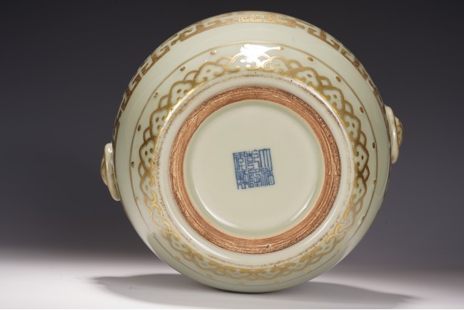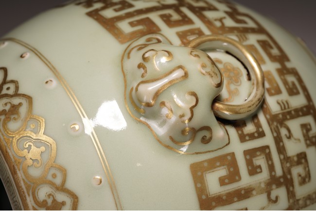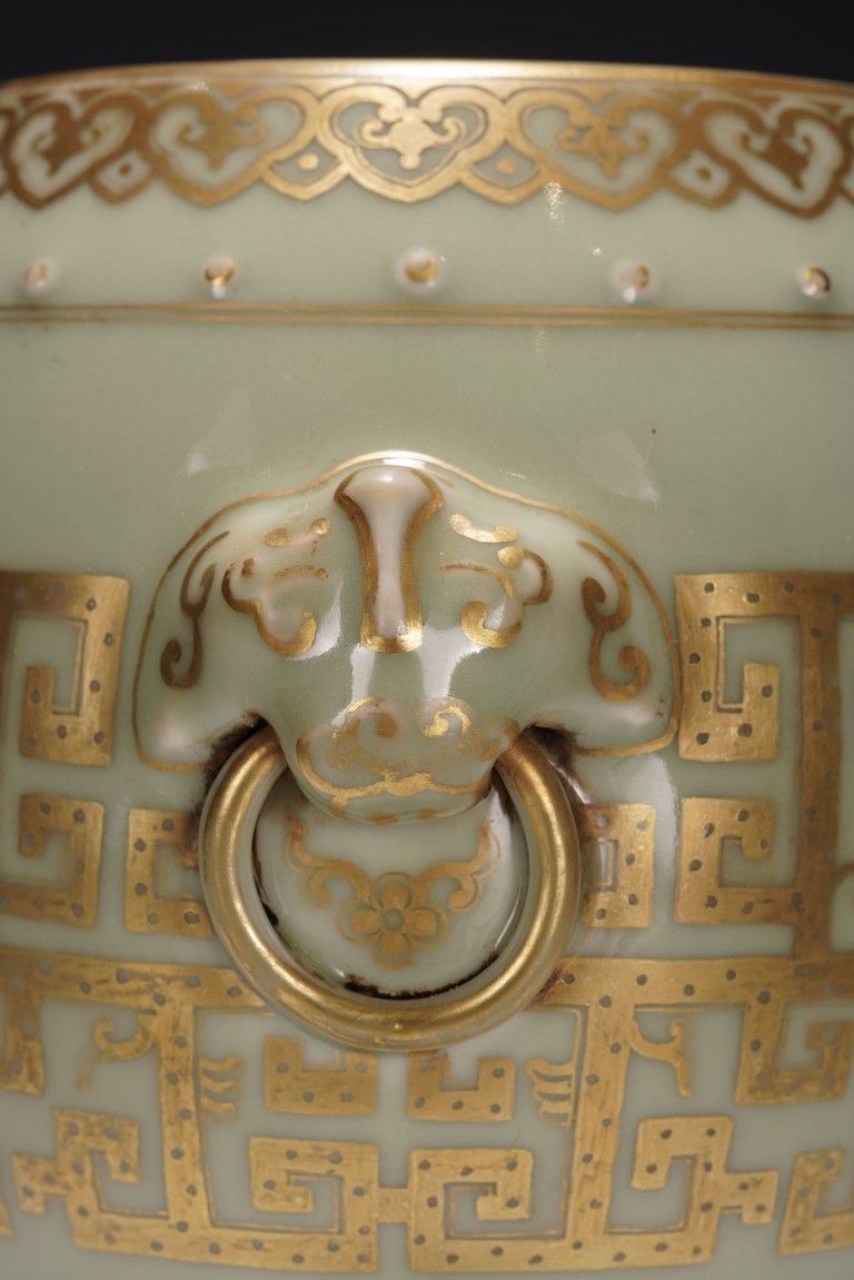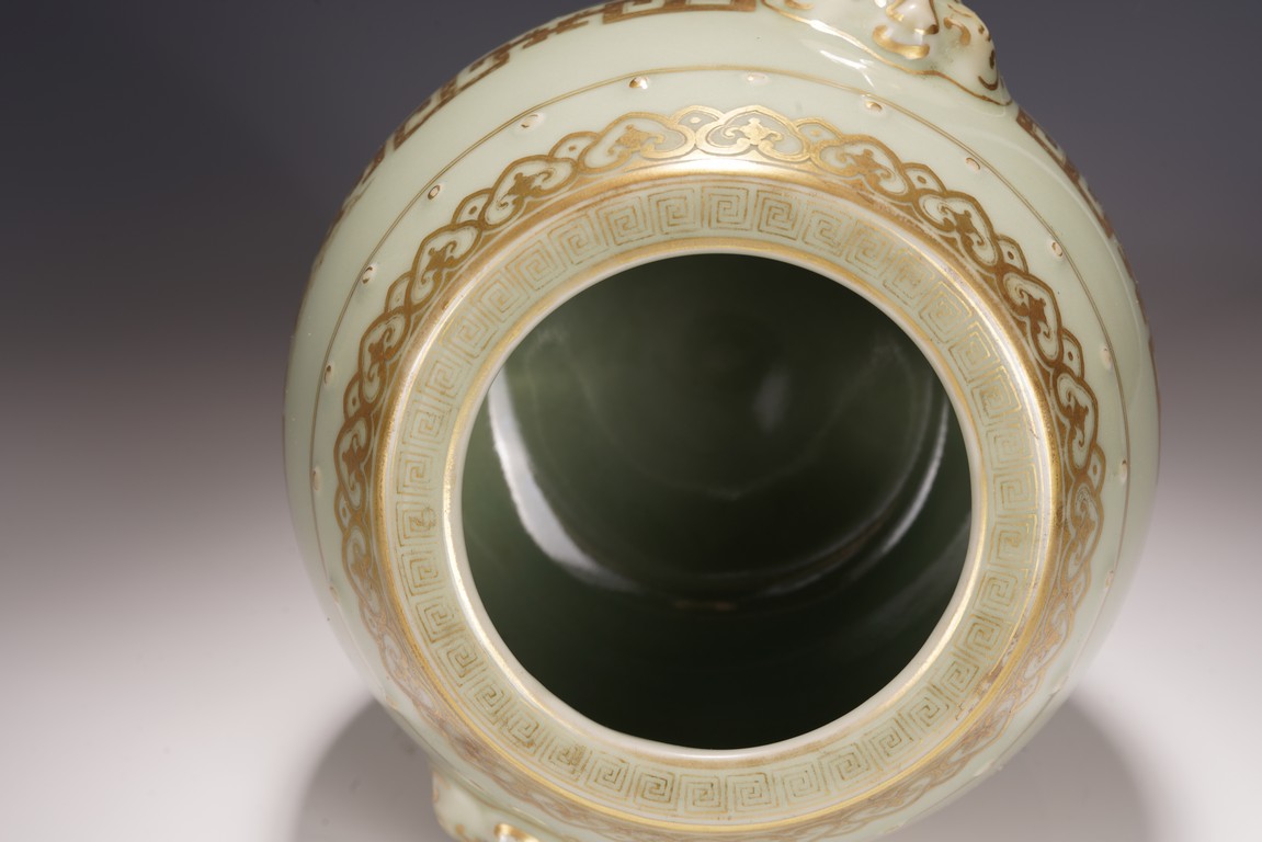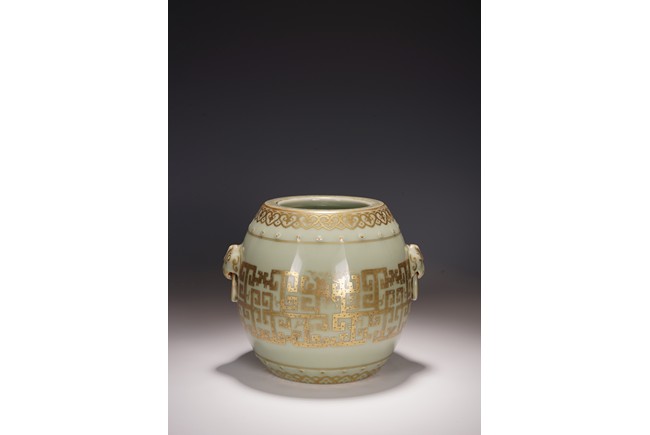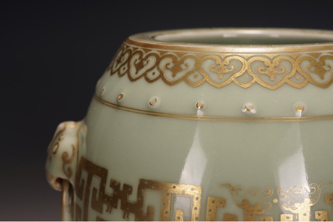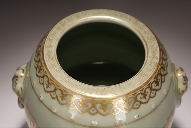 鼓墩又名“繡墩”,“坐墩”。鼓墩造型秀美端莊,無墩面,弧腹中空,上下各有凸起鼓釘一周,雙獅銜環耳,細節處見精巧。通體施粉青釉,釉色沉靜滋潤,青翠盈潤,美不勝收,上繪金彩輝煌奪目,淡雅之底色結合鮮明張揚之金色,使得整器清爽而不乏雍容,淡雅而更顯高貴。口沿上方描金繪“迴紋”一周,器身上下皆描金繪“如意云紋”,器身描金繪相對式“夔龍紋”,構圖清晰,紋飾整齊規矩,雕塑雙獅耳銜環,獅子威猛又憨態可掬,活環高突,整體逼真生動。 “大清乾隆年制”款識。