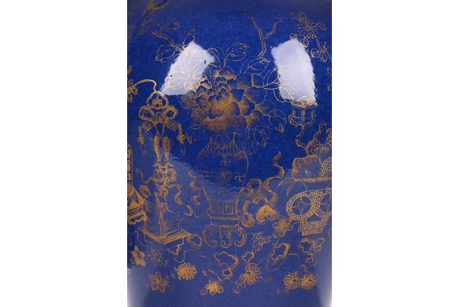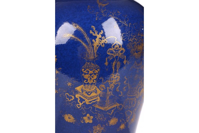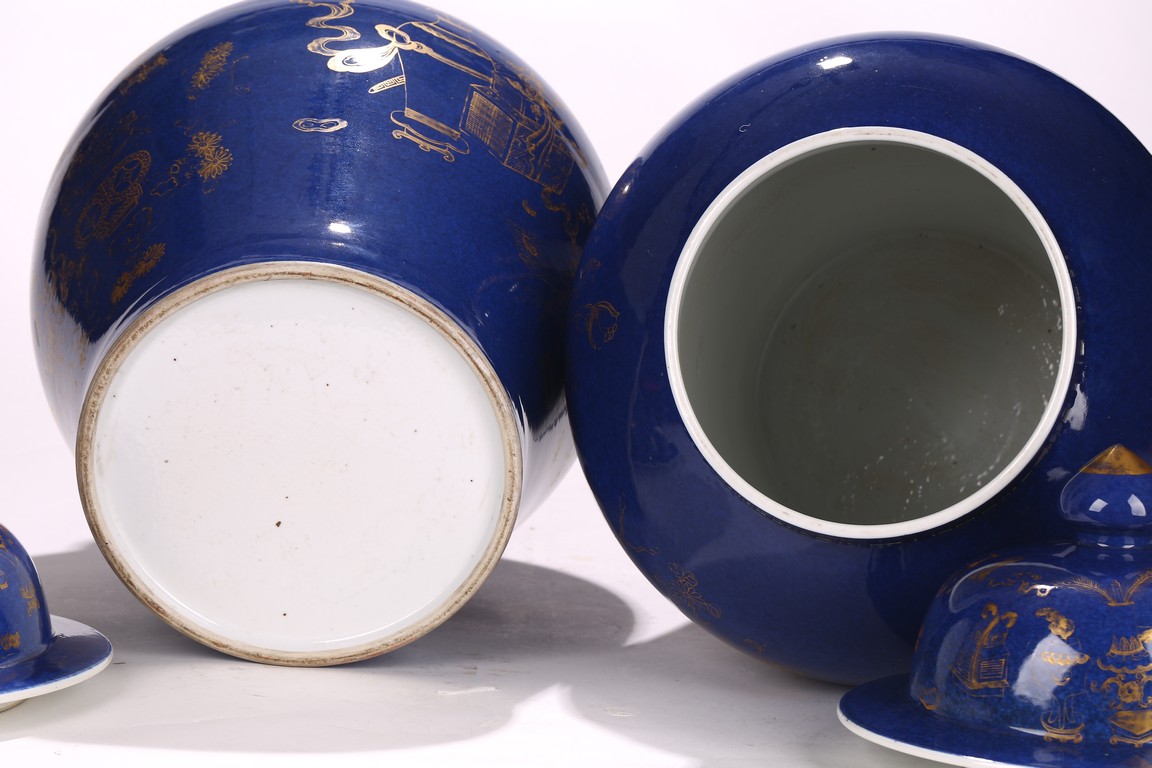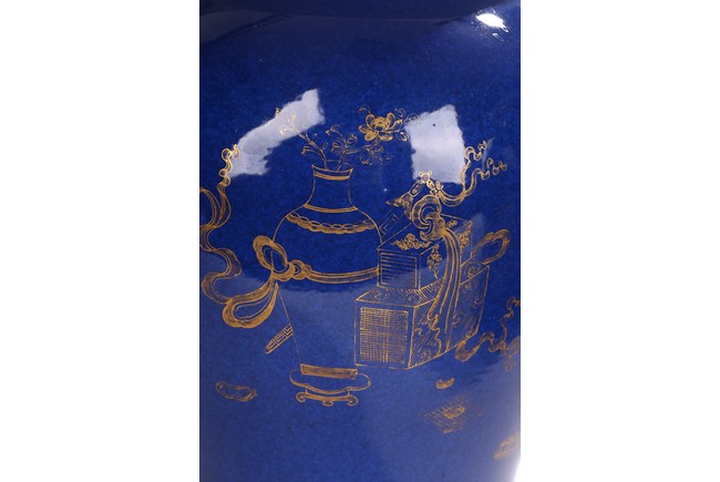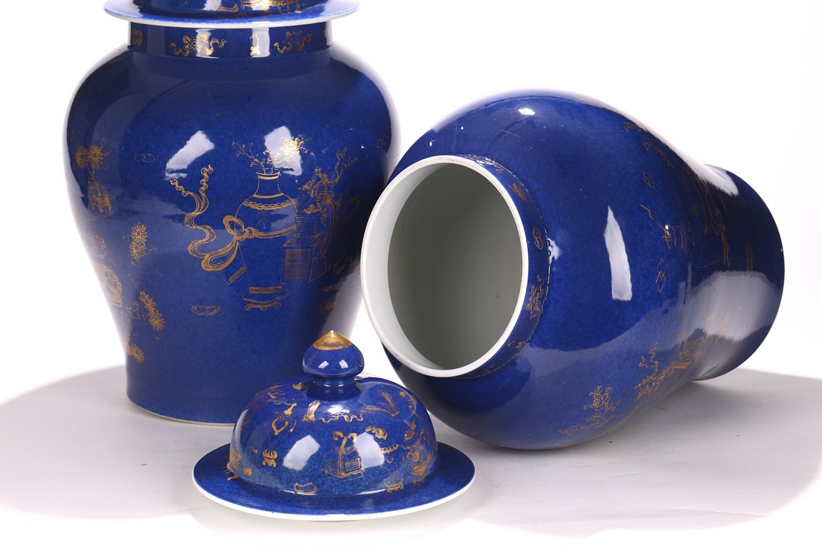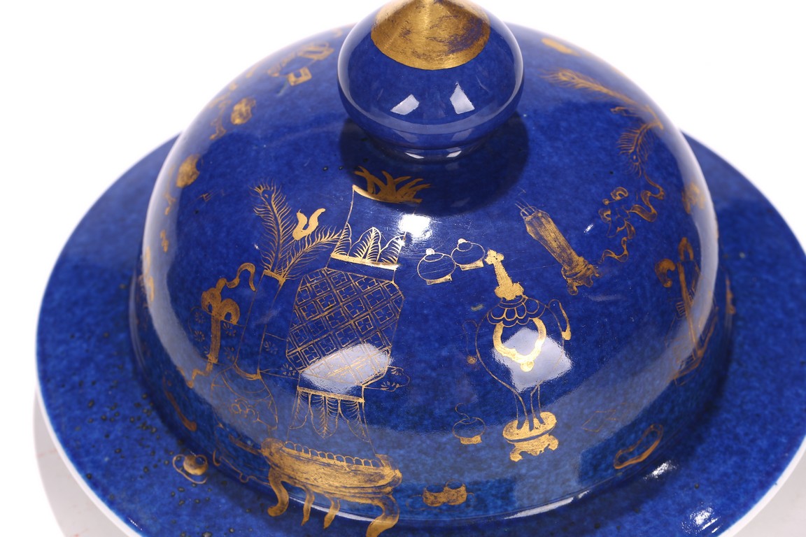 Mid Qing Dynasty period. Of baluster form, the body finely decorated in gilt with scenes of various scholar's objects and antiques, the domed cover painted in similar pattern, surmounted with a lotus bud-form knop, all reserved on an attractive blue ground, the base covered in white glaze.