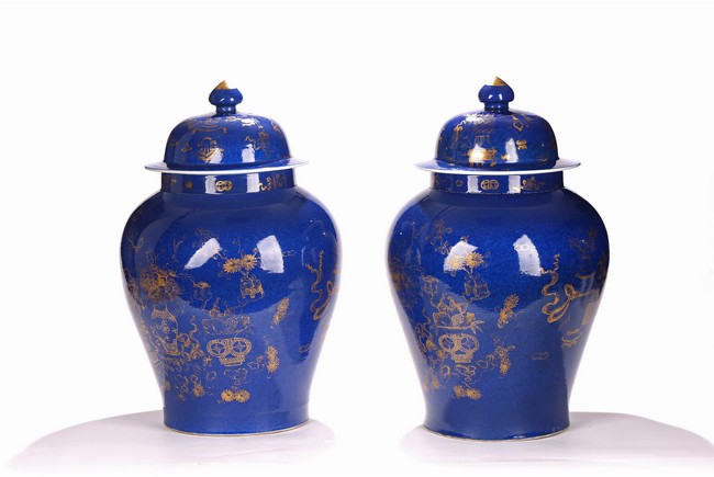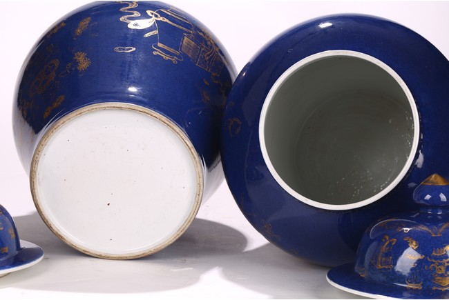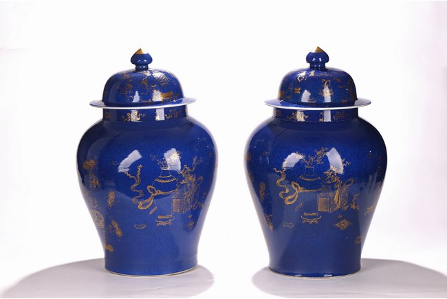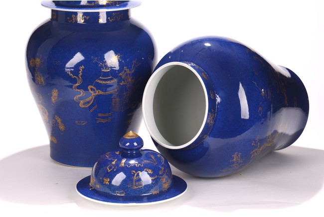 直口短頸,豐肩,鼓腹下收,罐蓋凸起,上飾寶珠形鈕,因整體造型似戰將頭盔,故俗稱“將軍罐”。器物胎體厚重,胎質堅實,瓶身通體施祭藍釉,釉質肥腴,色澤深沉凝重,光亮細膩,尤如藍寶石般璀璨深耀,描金繪清供圖,畫中佈置各式花瓶,瓶內插有四季花卉。整體圖案精美,彰顯華貴之氣,成對保存。