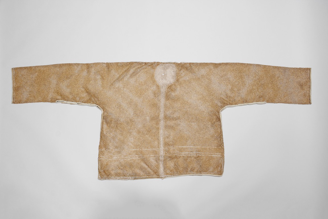 This rare vest is woven with bamboo strands in a cross hatched pattern. The edges were finished with cloth trim. Qing Dynasty period.