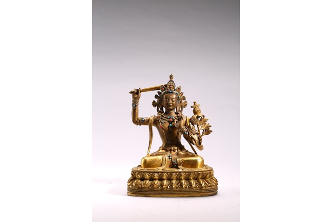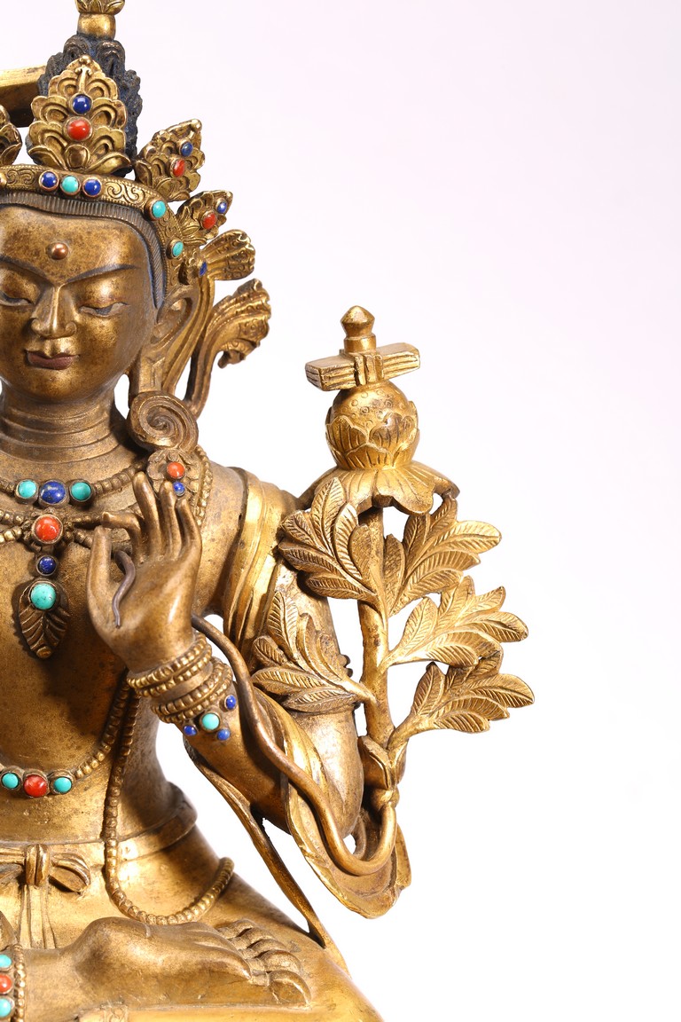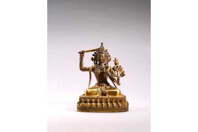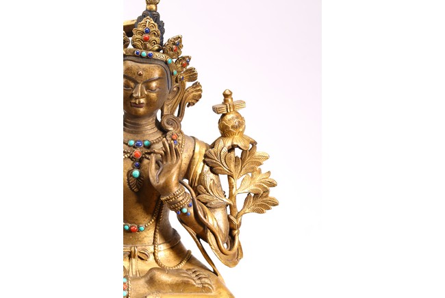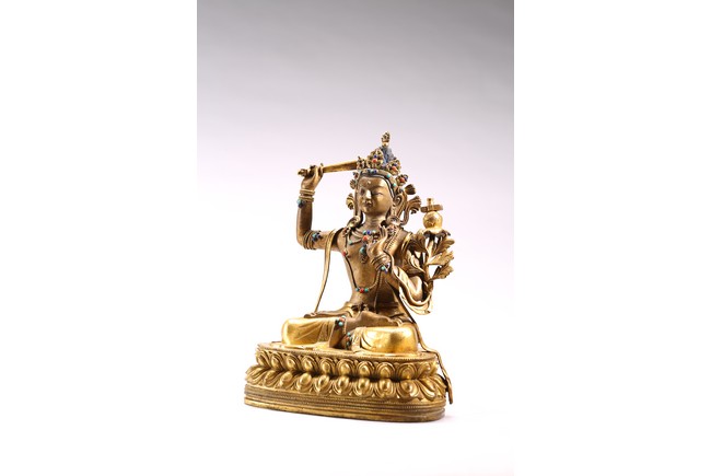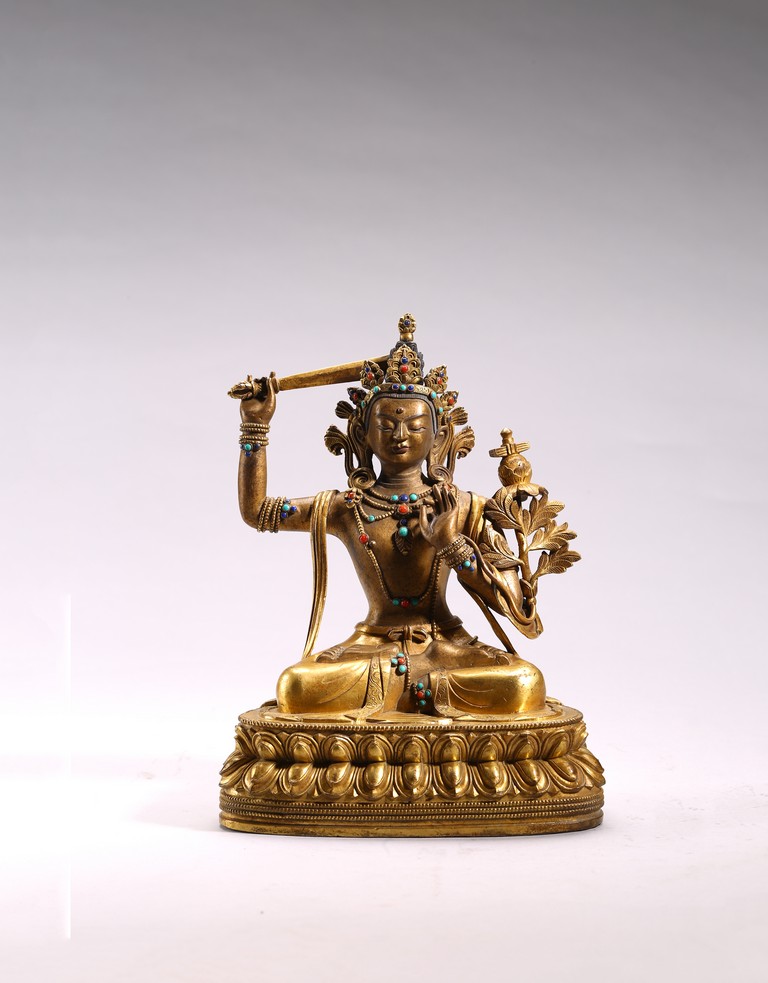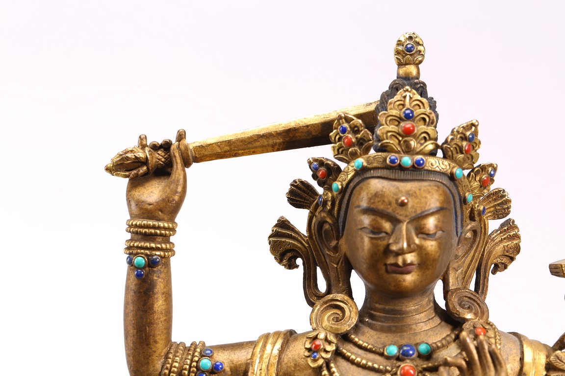 Qing Dynasty period. Cast seated in vajraparyanakasana on a double lotus pedestal, the right arm raised wielding a sword, the left hand raised to the chest holding the curved stem of uptala lotuses, wearing a dhoti falling into neat pleats and incised with foliate scroll borders, the chest adorned with beaded necklaces and draped over with a billowing scarf around the shoulder and arms, the benevolent face surmounted by a diadem before a high chignon.