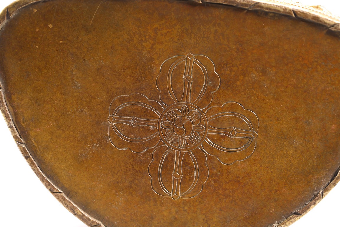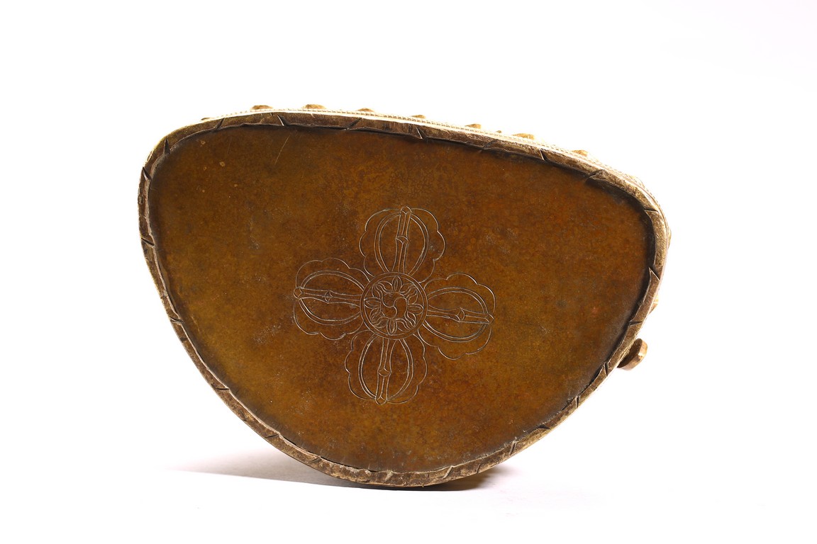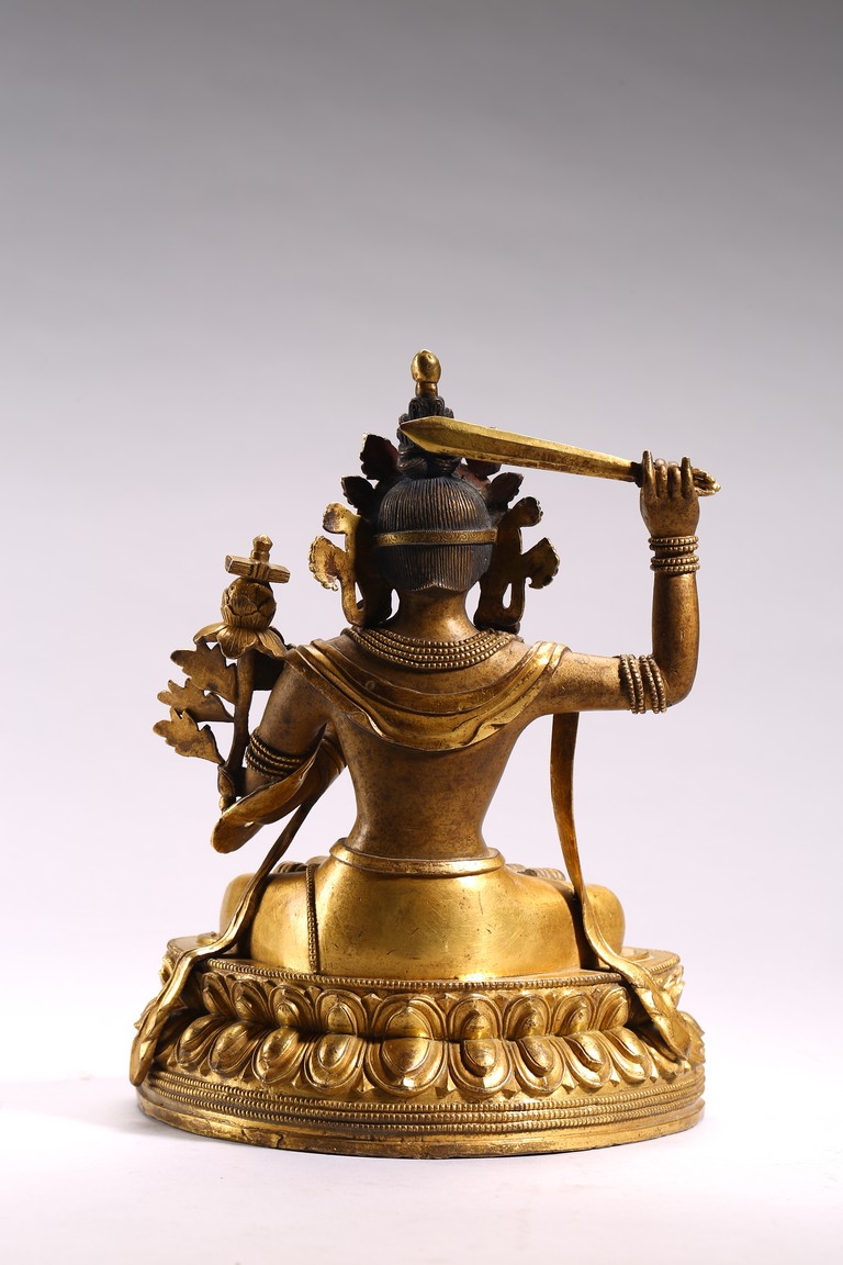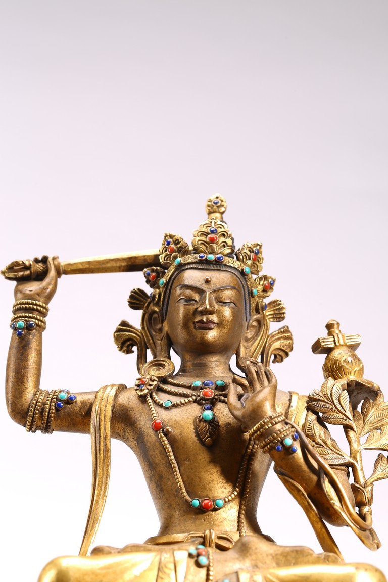 Qing Dynasty period. Cast seated in vajraparyanakasana on a double lotus pedestal, the right arm raised wielding a sword, the left hand raised to the chest holding the curved stem of uptala lotuses, wearing a dhoti falling into neat pleats and incised with foliate scroll borders, the chest adorned with beaded necklaces and draped over with a billowing scarf around the shoulder and arms, the benevolent face surmounted by a diadem before a high chignon.