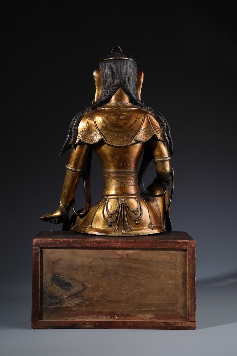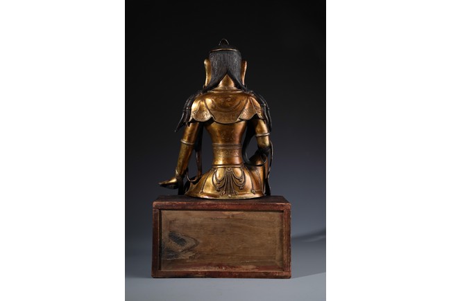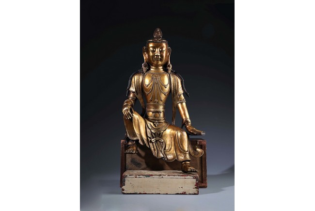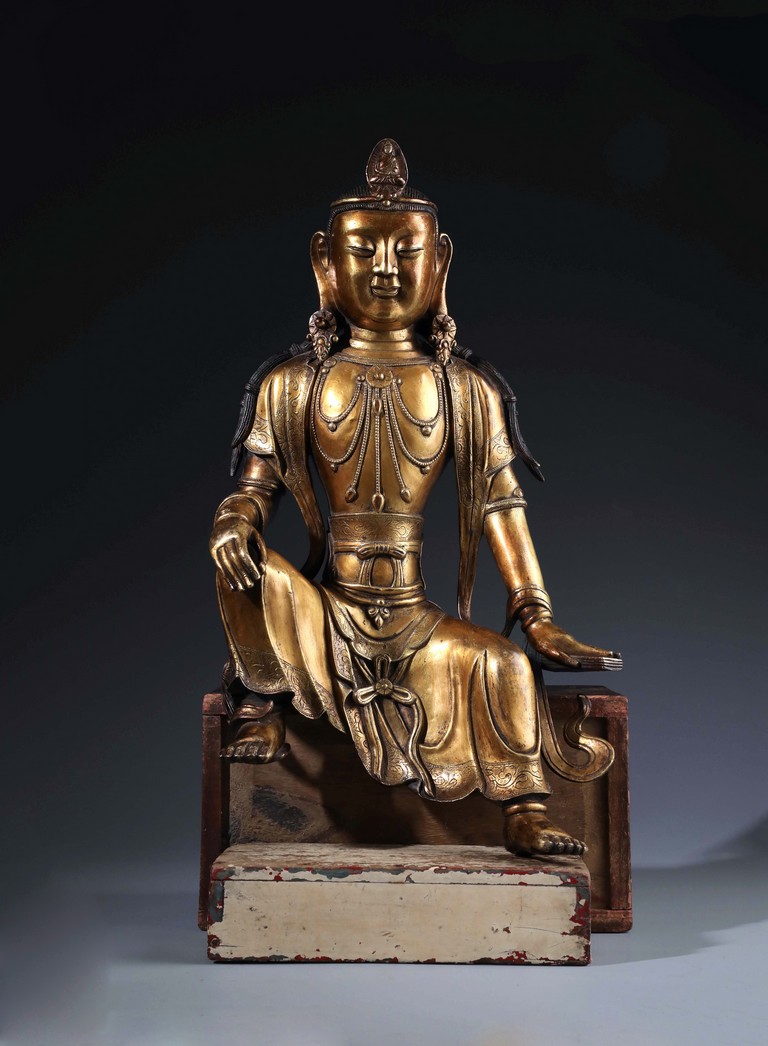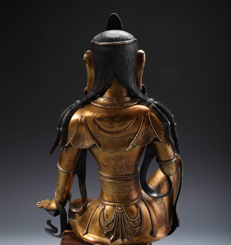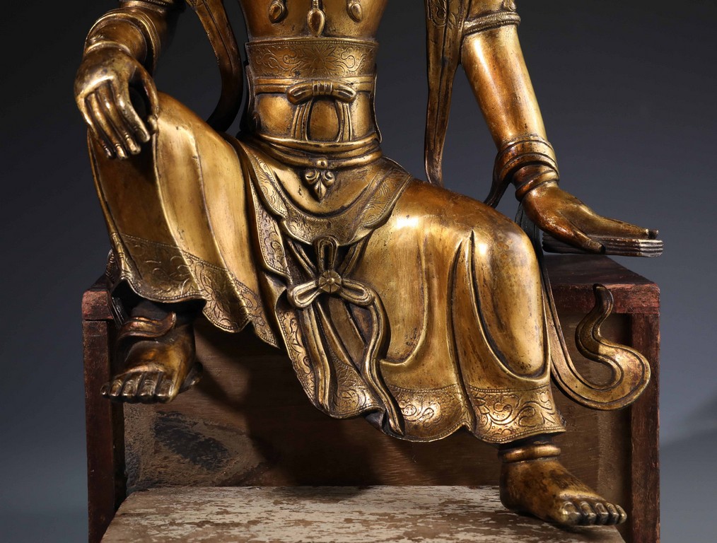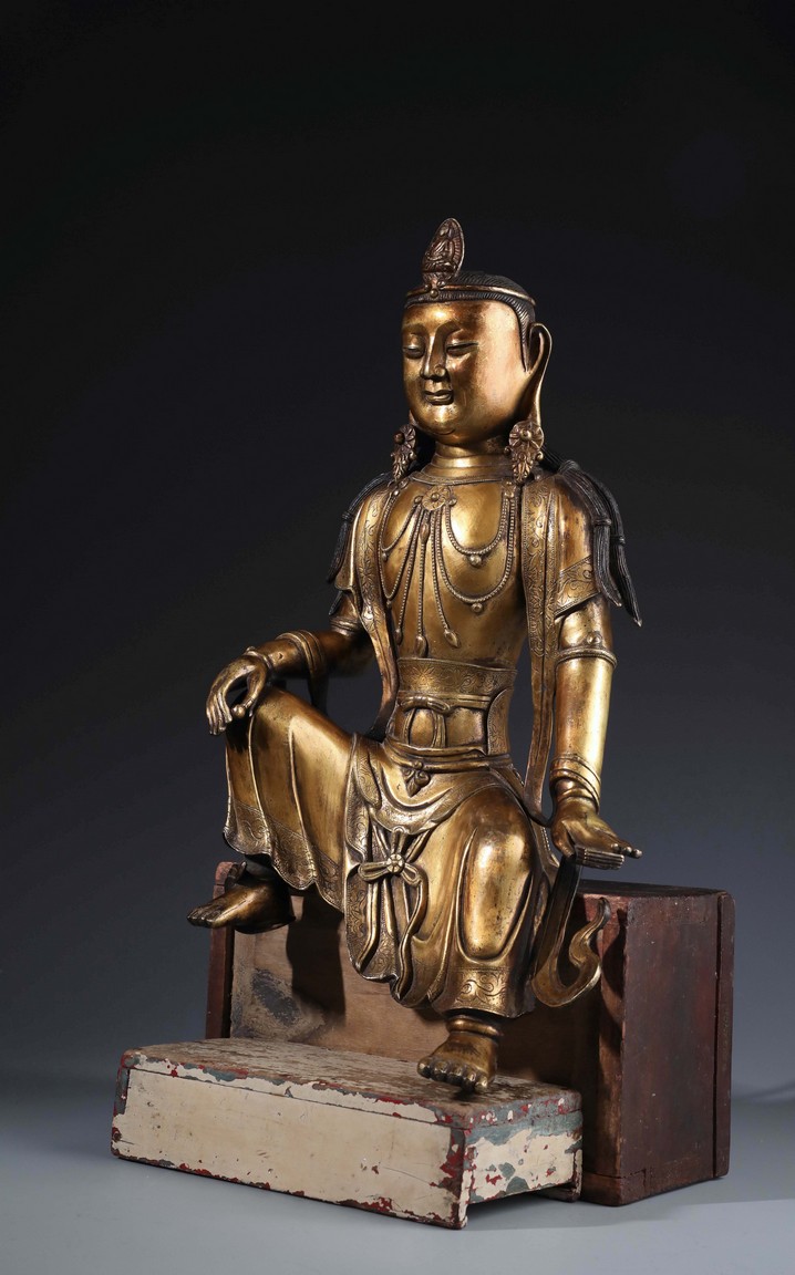 ⾃在觀⾳,被認為是觀世⾳菩薩三⼗三種化身之⼀,代表著⾯容俊美、姿態典雅的觀⾳形象。也是明清時期世間崇奉的常⻅造像題材。此尊觀⾳呈現舒坐的⾃在妙相,左臂⾃然平放,右⼿⾃然搭於右膝,姿態優美,閑情逸致。⾯相⽅圓端正,眉⽬細⻓,神態安詳。束发披肩,⽿垂圓珰,其下飾有花瓣墜,寬肩束腰,體態勻稱,造型優美,⼿腳刻劃寫實。上身袒露,胸前飾連珠式瓔珞,下身著⻓裙。裙褶⾃然流暢,⽣動⾃如,整體造型完美,形象⽣動。